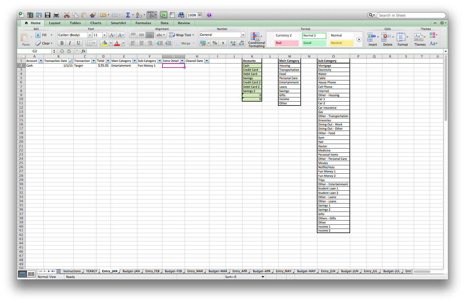 This is where you will enter all of your transactions. Brad and I keep a receipt basket. I attempt to go through this basket once a week. I sort each receipt based on what it was for. If a receipt was for multiple things, I note it on the receipt. I then enter it on this tab. You need to make sure you categorize everything correctly. After entering the receipts, I go to our different accounts and make sure what has cleared and label it. This is just an option, not a requirement. Below are two views, one blank and one with one entry.