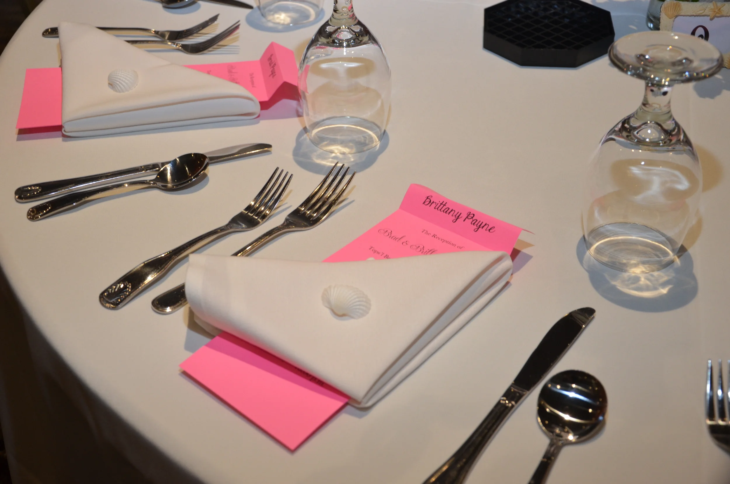 We had approximately 120 RSVPs. So it took me around 60 pages of paper. I printed a few extras that were blank names in case we had any last minute guests (which we actually did). A few weeks before the wedding, my wedding coordinator and I finalized the plans for the reception. I printed them all, cut them, then strategically folded the top so that when it was placed on the table it look like an ordinary placecard. We bought white seashells from Hobby Lobby that were placed on top of napkins that were on top of the programs. Overall, I think the program was a nice touch.