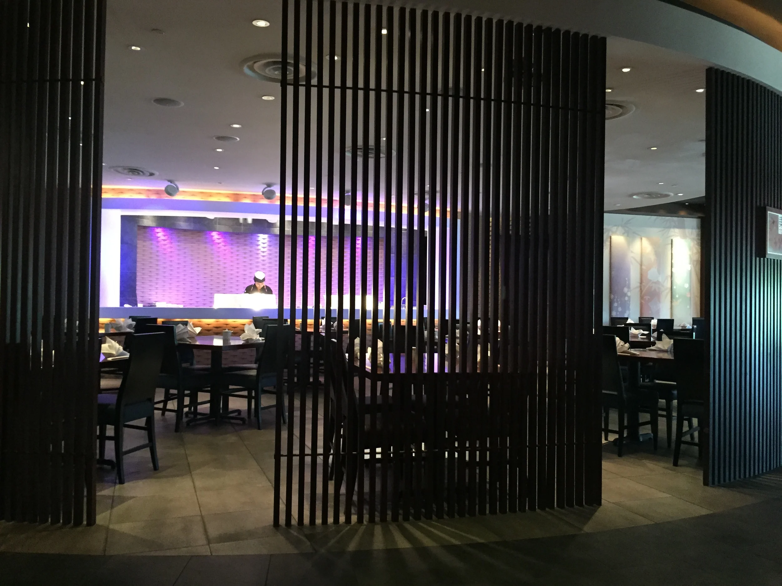 Right at noon, our pager went off, as well as the pagers of our soon to be tablemates. The hibachi tables seat 8 people. So if your party is smaller than 8, you will likely be seating with strangers. Usually this bothers me in a more family style setting, but here it does not. We were escorted to our table and greeted quickly by our waitress. They handed us our menus then asked to confirm if anyone was on the dining plan or had any special needs/allergies. Then they took our drink order. I ordered iced tea and Brad ordered a coke.