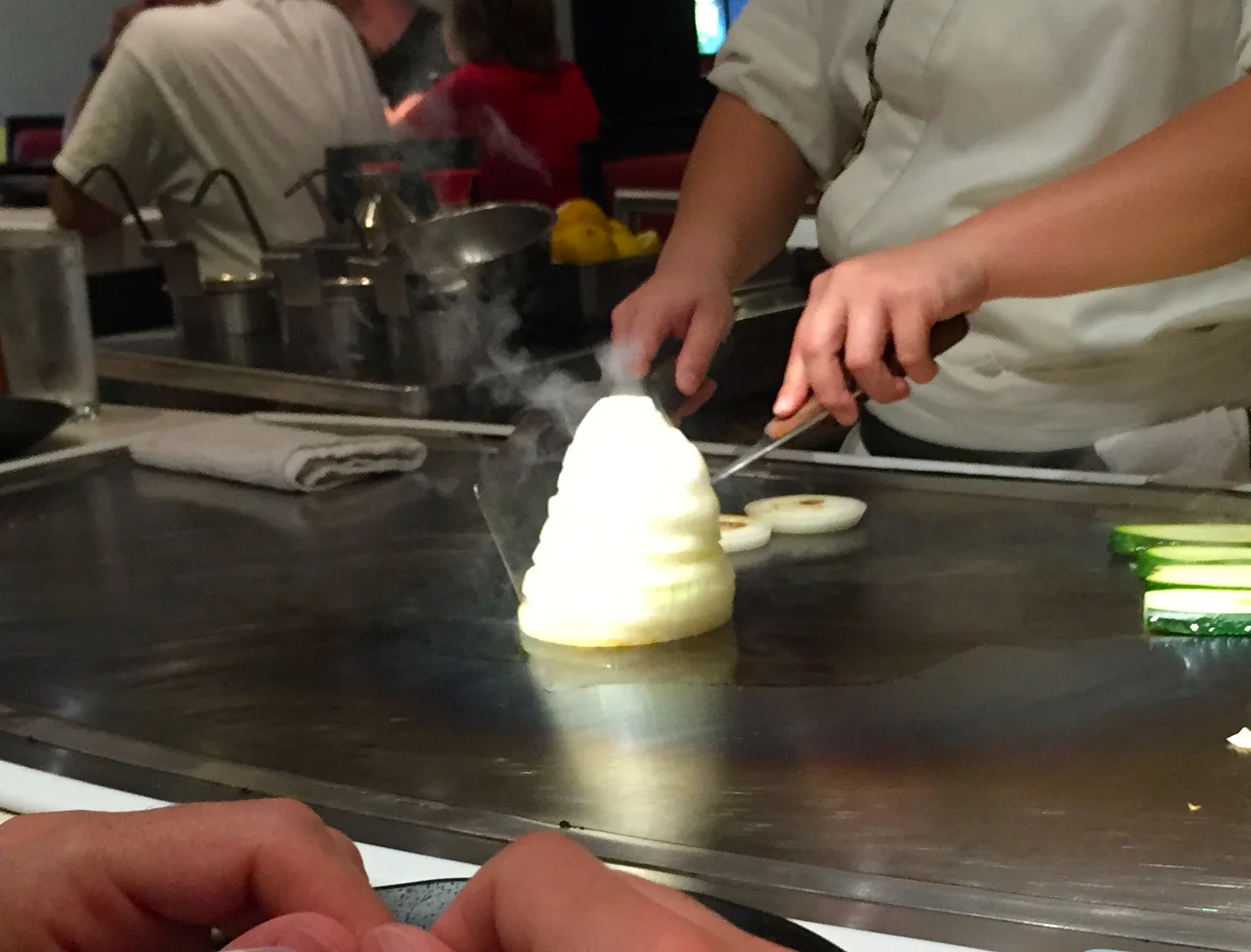 Then they destroy their priceless art to start cooking up the veggies! They do the stereotypical onion volcano/train combo. Nothing out of the ordinary.