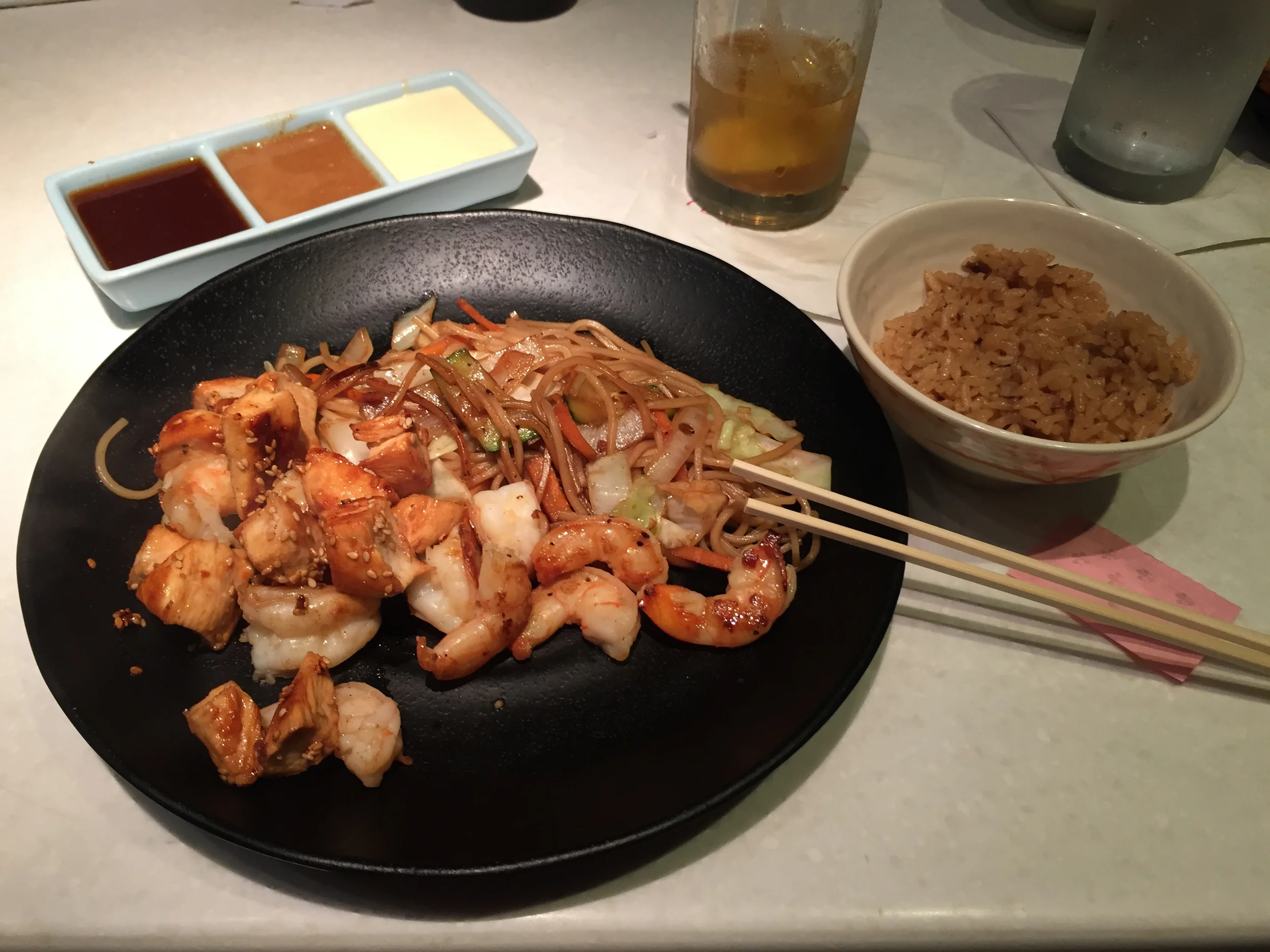 Then they start cooking the meats. Our table was chicken, shrimp, and steak. At this time, the cook will reconfirm your order and ask you how you prefer your steak cooked. They start cooking the chicken first, then shrimp. After both are seared, they sit them to the side and mix the noodles in with the cooked veggies. Around this time they will bring out your rice. That is because as soon as the noodles are nice and mixed in with the veggies, the chef adds them to your plate. At this point the chef really dives into the meats. She started the steak and finished cooking the shrimp and chicken. Once cooked, she will plate it for you. Now we get to dig in!