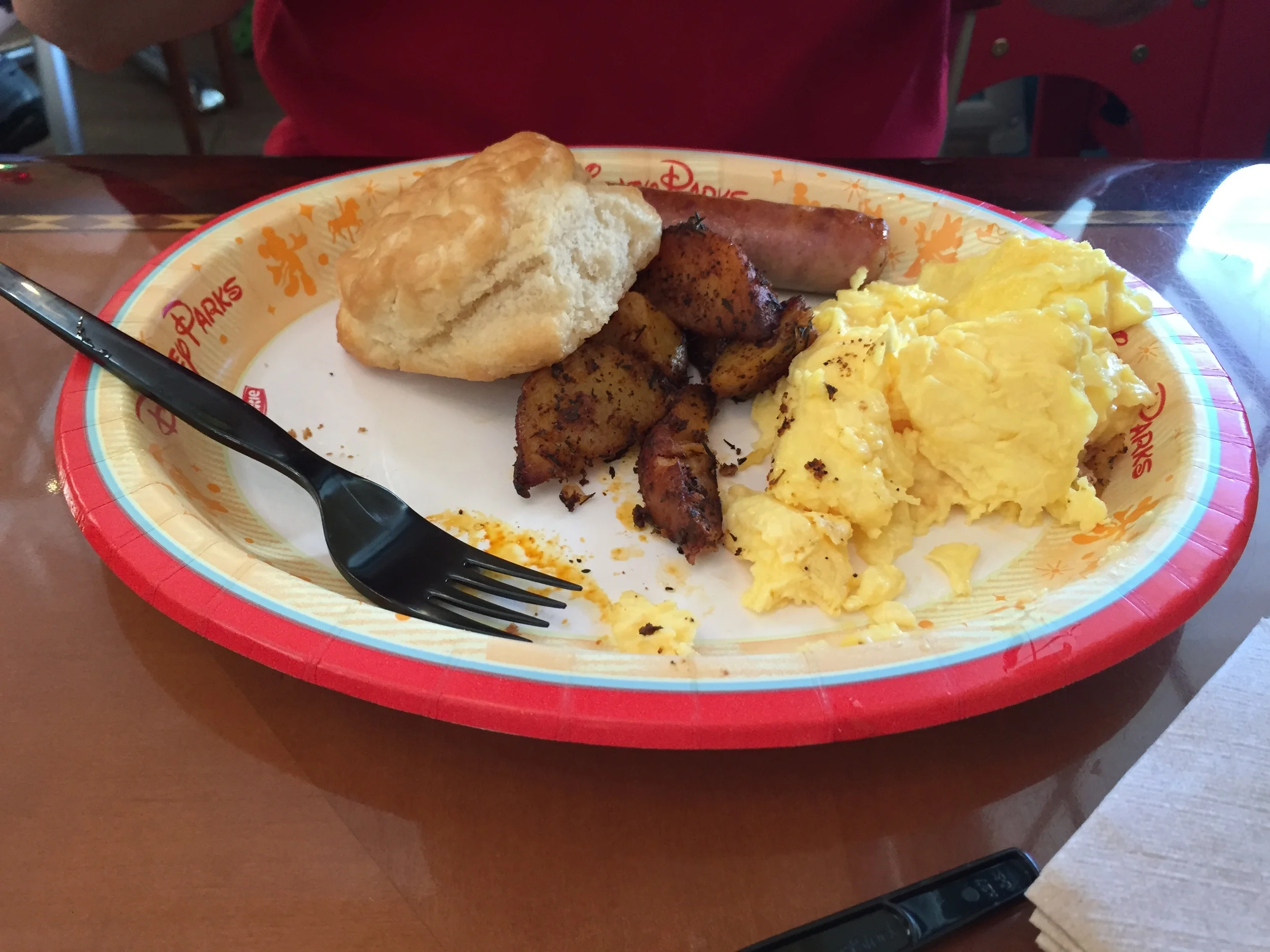 Bounty Platter - We split the bounty platter on trips because it has so much food and we each like most of it. It comes with a mini-Mickey waffle, bacon, sausage links, eggs, a biscuit, and potatoes. You can find extra plates near the microwave/pastry area. So I took the Mickey waffle, bacon, a few potatoes, and a few eggs. Brad had the rest. It is a lot of food for breakfast, so if you can split it with someone, I recommend it.