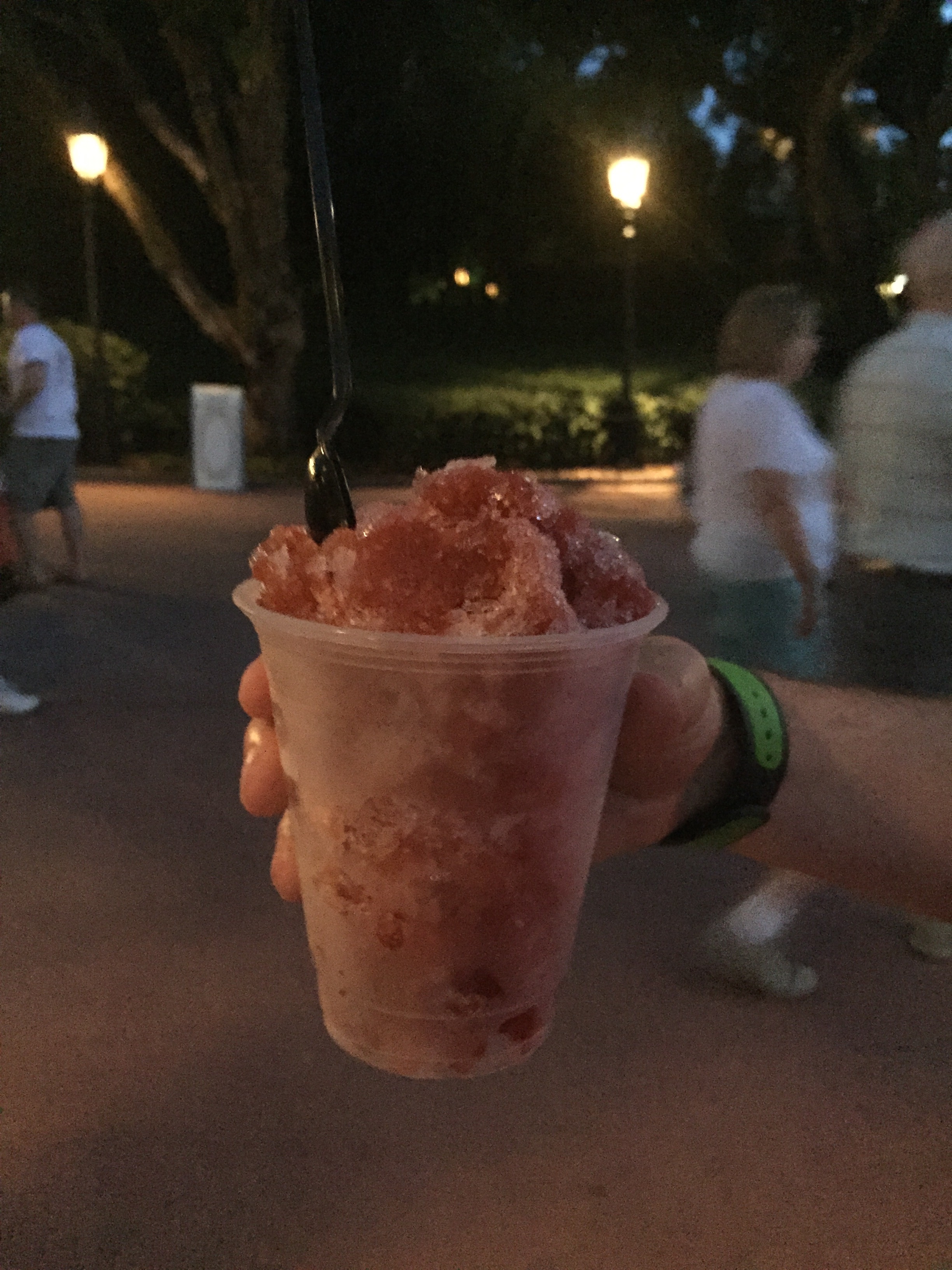 So I really enjoyed the Kaki Gori Cherry snack. After we finished our amazing dinner in Canada we decided to have a few snacks before calling it a night. She had her fruit stuff and I had the shaved ice snack. So I really love shaved ice. We stop at Snow Biz (our local shaved ice hut) all the time during the summer and it's a nice snack. This Kaki Gori Cherry snack was a little different. I don't know if it was the way the ice was shaved or what, but it seemed more "full" than the normal Snow Biz ice I have. It wasn't heavy though, and I really liked it. It made a great snack to eat as we watched Illuminations!