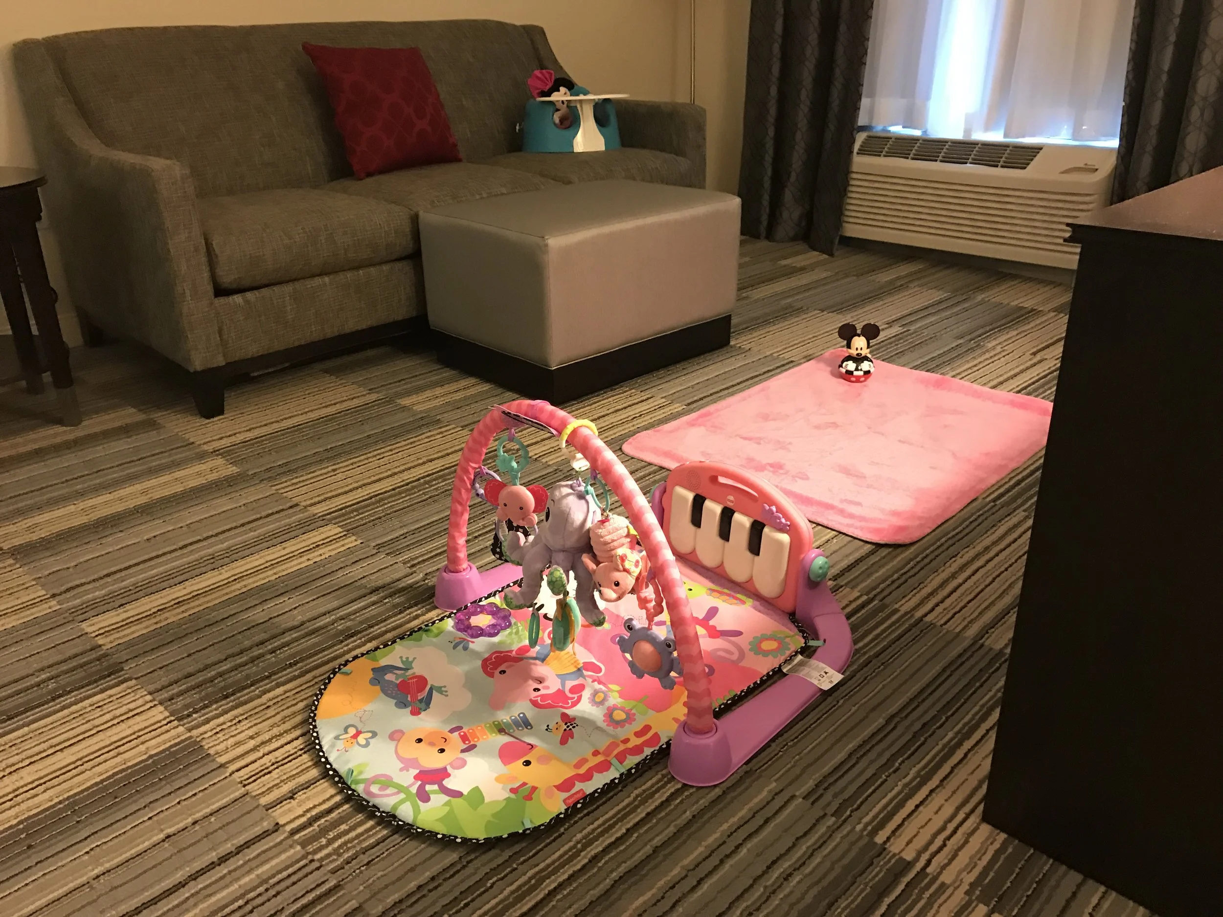 Recently, Melody and I went on a trip with my mom to South Carolina. We wanted to stay at a Hilton to get points, so we investigated different options. I knew staying in a hotel room with an infant was going to be different and possibly a struggle. We narrowed it down to Home2 Suites and Hampton Inn. Because we knew we would be spending a lot of time at the hotel during the day, we opted for the Hampton Inn because it had an indoor pool (which we never ended up using sadly). The Home2 Suites did have a full kitchen, but the room itself was going to be smaller than the Queen Suite at the Hampton Inn. The Hampton Inn was also fairly new, and it had the necessities. Below are some tips and tricks I discovered that helped us while staying in small quarters with a baby!