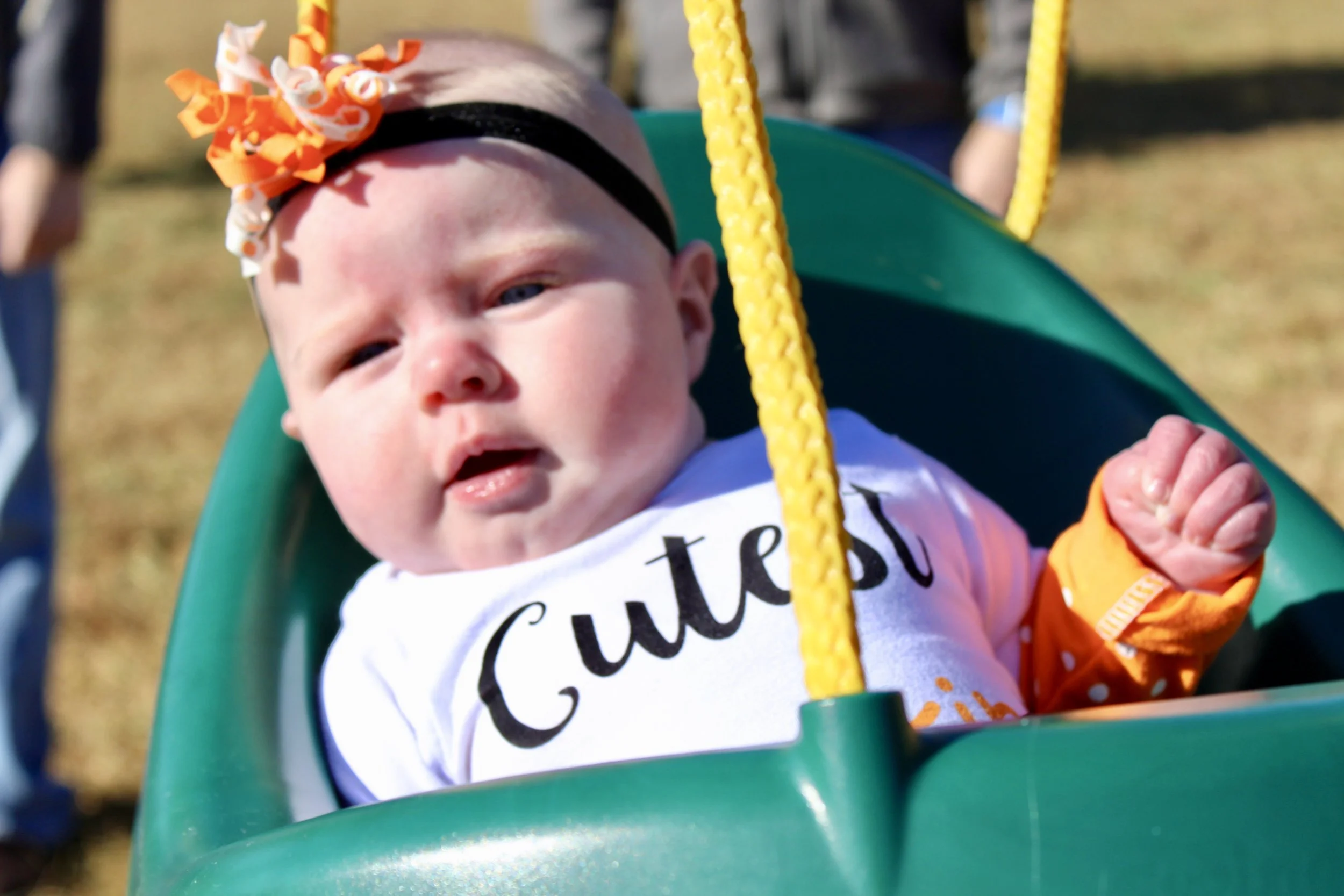First up was the baby corn bin. We thought this would make some cute pictures and it was for babies, right? There was even a nice sign that said it was for 2 and under. There were a few frustrating points throughout the day, and this was one of them. There were kids clearly over 2 in the bin. And I am not talking they were 3 or 4. These kids were 8 or 9, at least. And to make matters worse, their parents were standing right there with them as they jumped in the bin and threw corn as young kids were trying to play. It was really uncalled for. I stood back with my camera and was kind of hesitant to take Melody to the bin, but my best friend took charge and walked right up and laid her daughter down in the corn bin. The moment that happened, some of the parents cleared out their older kids. Not all parents did, but at least some did. We were able to get a few decent pictures before the older kids that remained starting throwing corn again. So out we went!