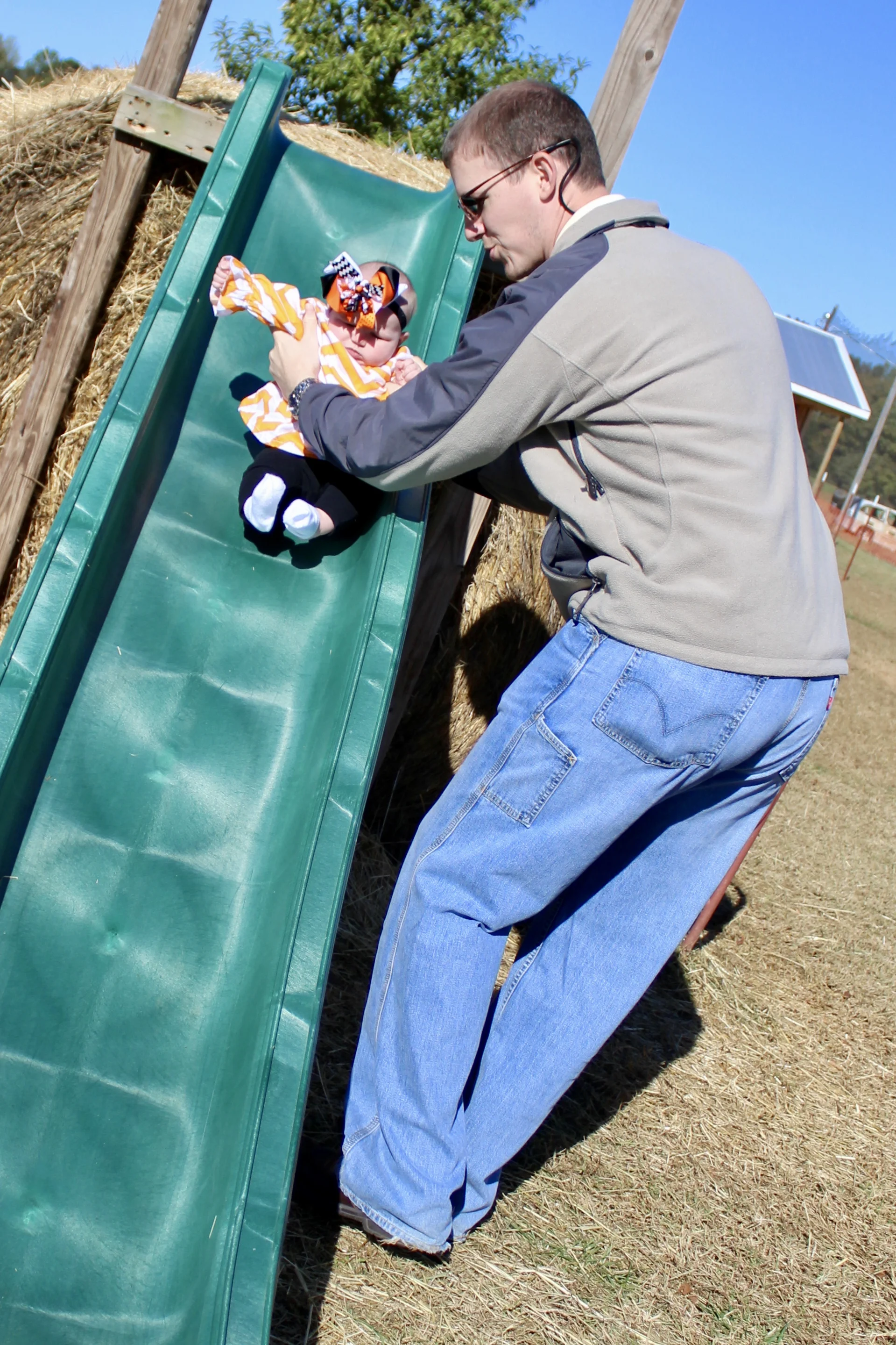 After swinging, the dads let the girls ride down the "small" slide. Our goal before the end of the day was to ride down the big slide with the girls, but the lines were way too long.