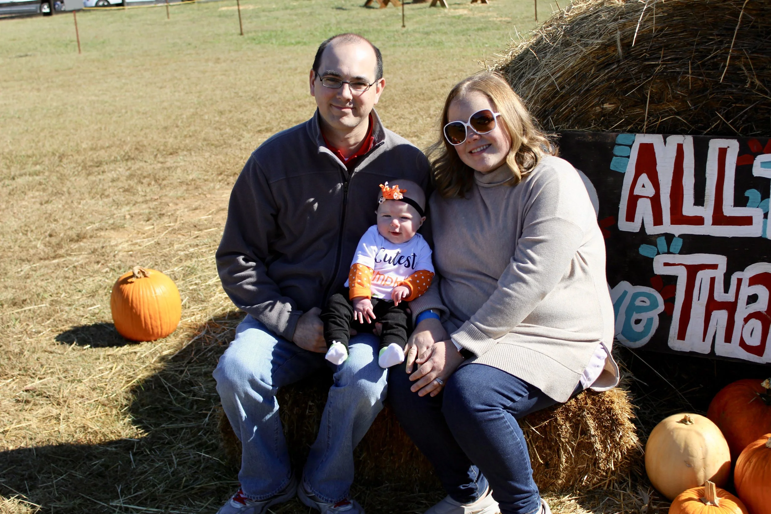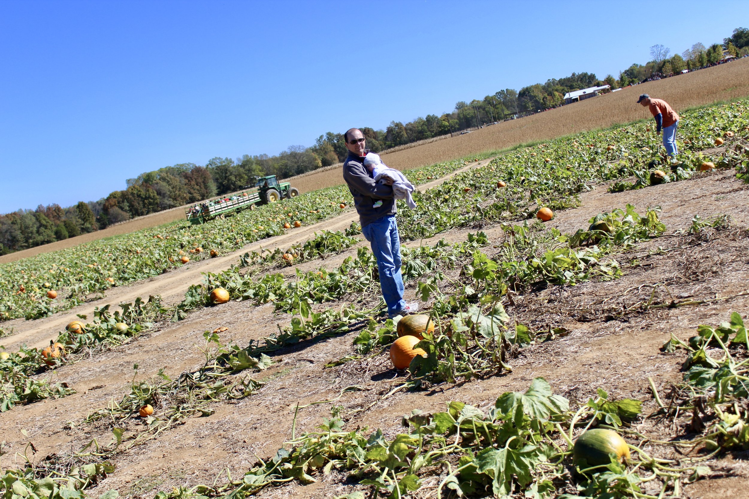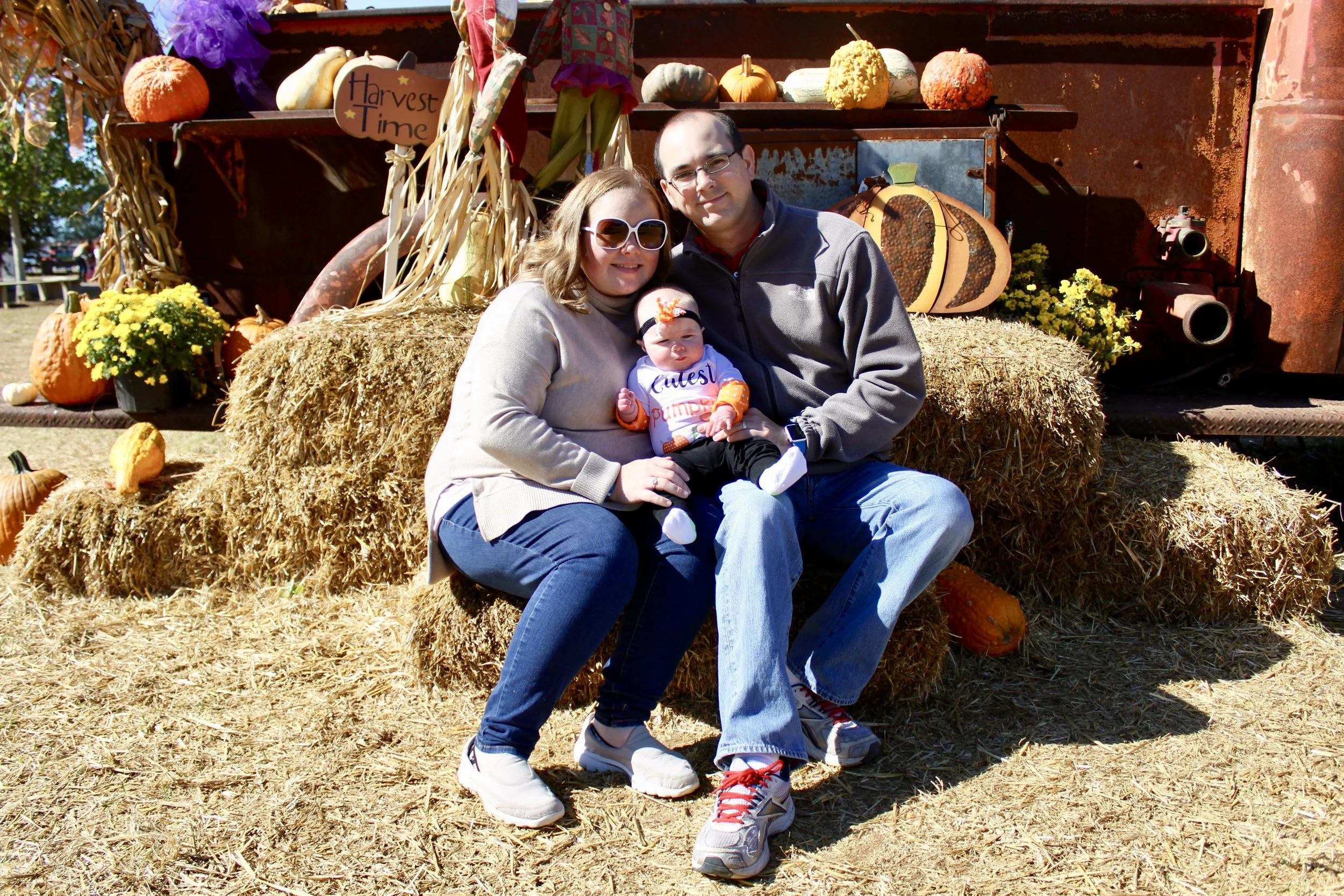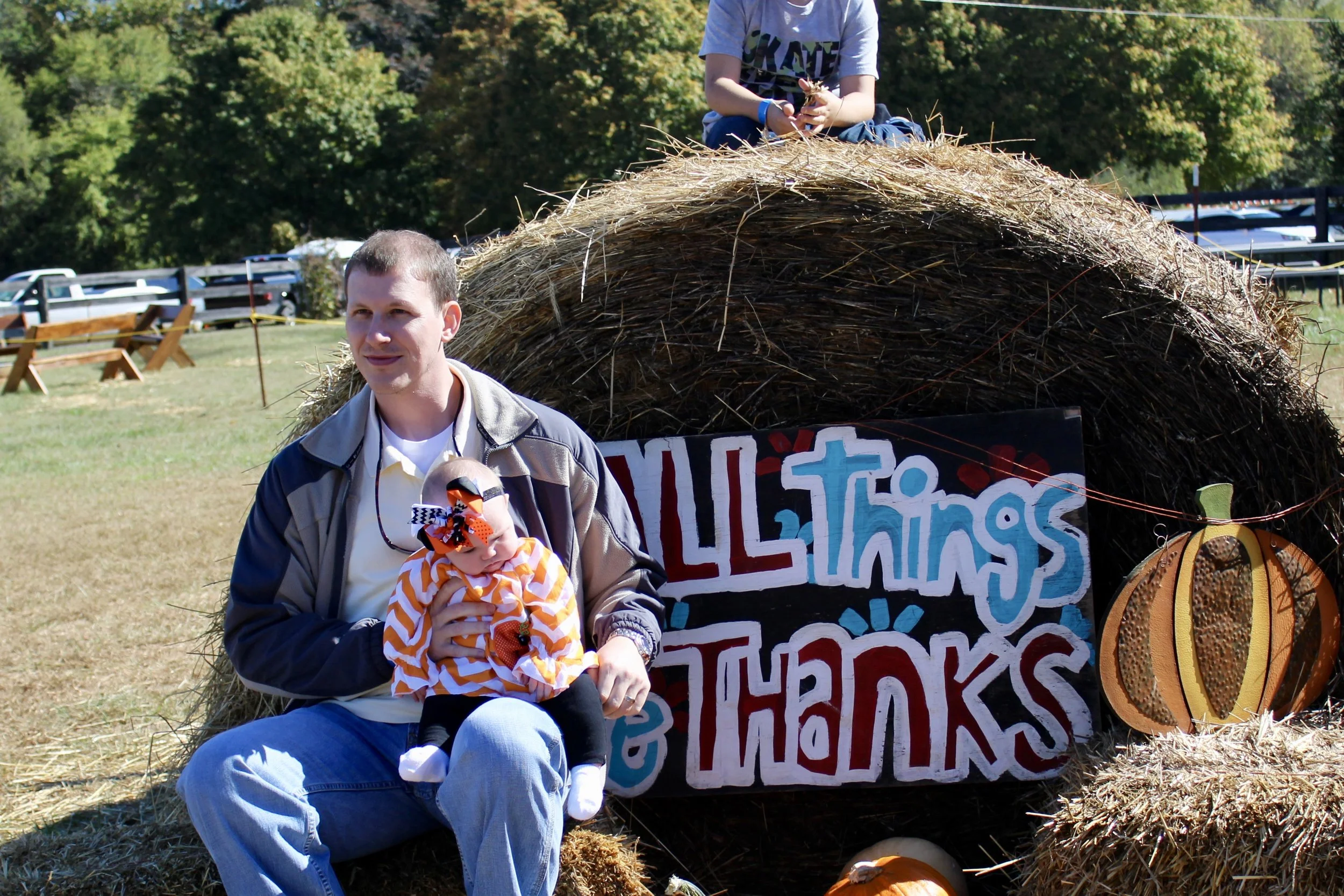 Next up was the hayride. We took the hayride to the pumpkin patch so that we could pick a pumpkin for the girls. This was fun, but not what I expected. I think I expected the hayride to drop you off and you sent an unlimited amount of time in the pumpkin patch. That isn't how it worked though. Your specific hayride went to a specific area of the patch. Your group all got off and had to return together. Luckily we found some nice pumpkins and returned back to the farm. Lydia had her bottle on the hayride. Then when we returned back to the farm, Emily and I went and sat at the pavilion, and I fed Melody her bottle while she fed Lydia her oatmeal.