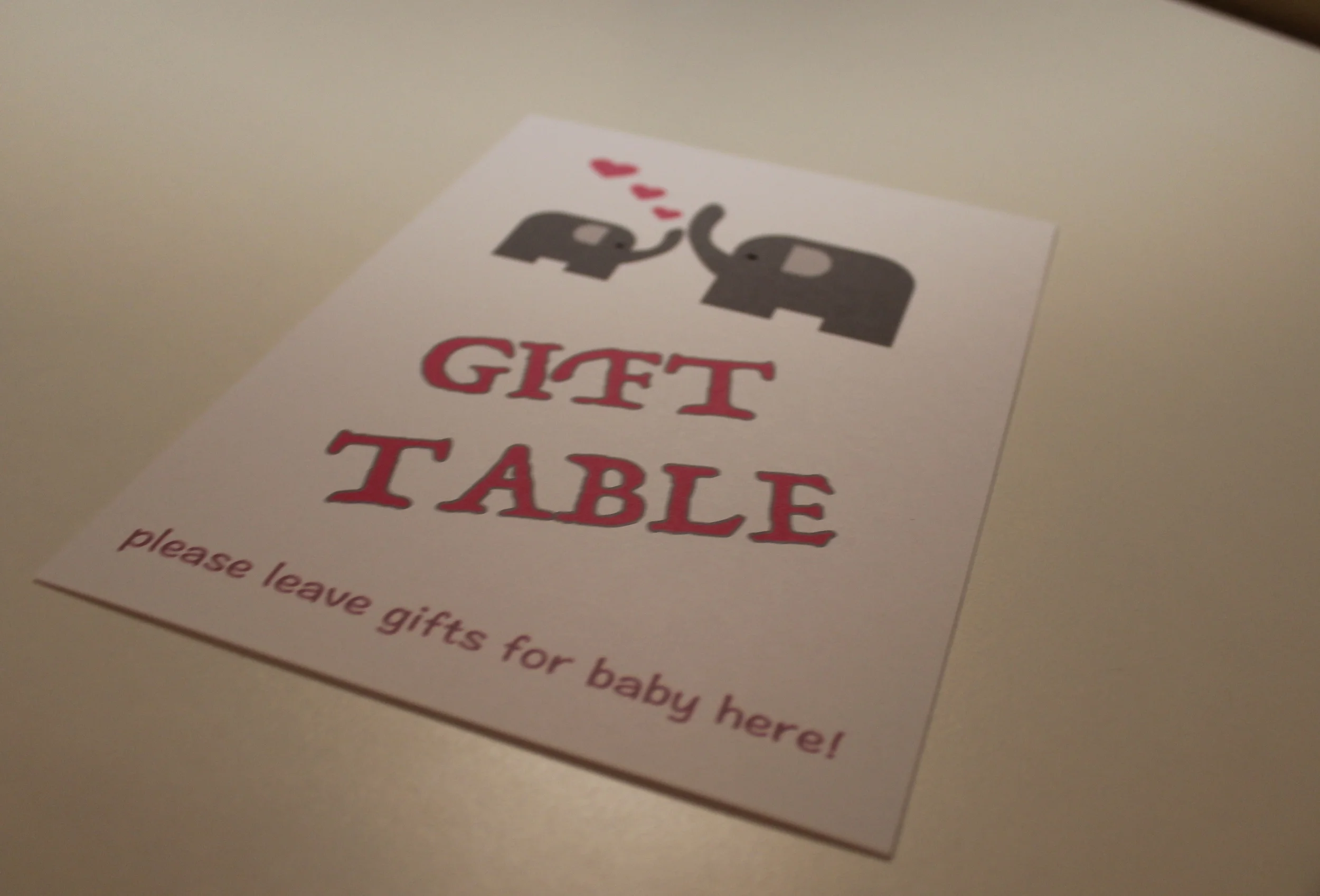 For my best friend's baby shower, the theme was pink and gray elephants. I decided to make a cute sign to let guests know where to put their gifts for the mommy to be. I used white cardstock and found a cute pink picture frame at Hobby Lobby. I used the same elephants that I used throughout her baby shower and printed that along with the words "Gift Table" onto the cardstock. I placed the picture from on the table we were using at the shower for gifts. This is super simple and easy, but adds a nice touch to any party.
