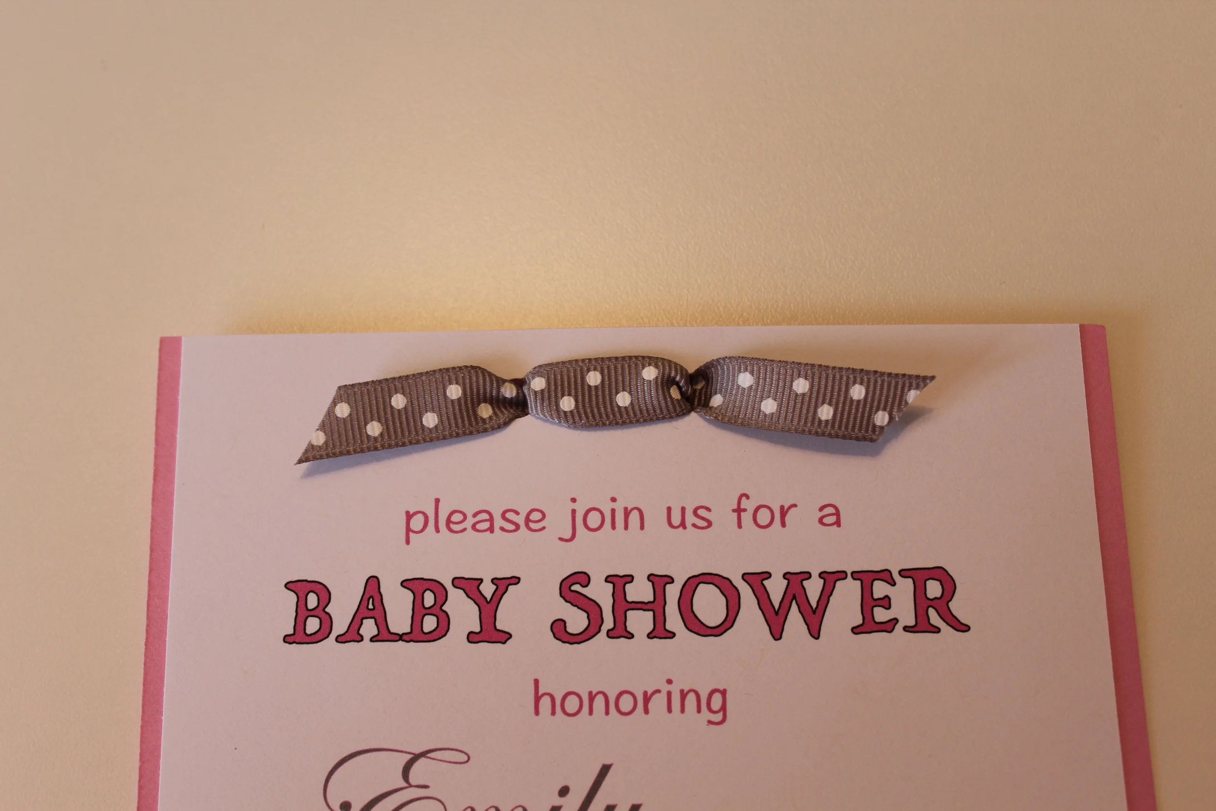 I entered the ribbon from the top of the invite first and pulled it through to the back and made sure it was centered. I also made sure the polka dots were seen.