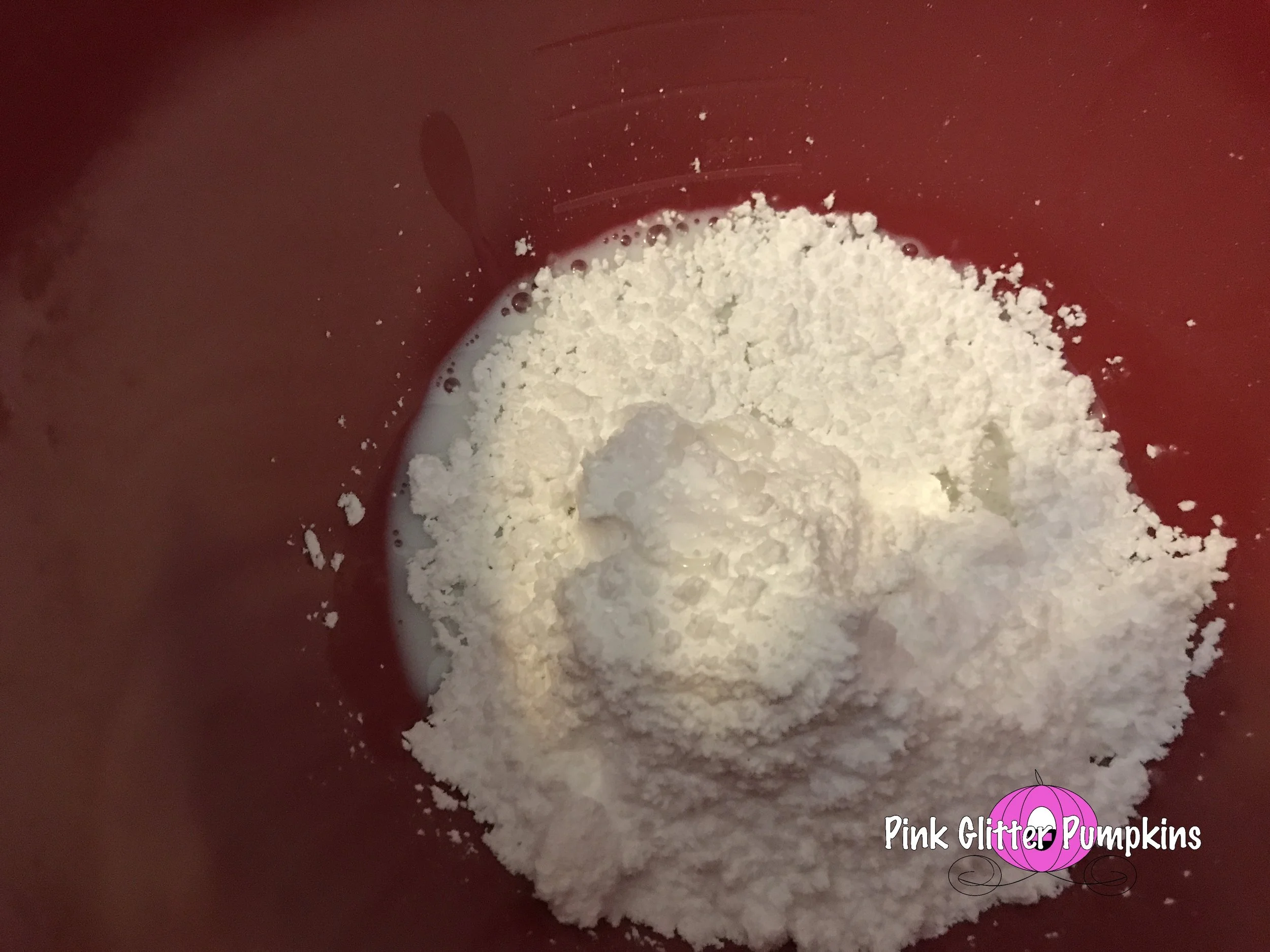6. After the cookies have cooled, make the frosting. Mix together the powdered and sugar.
