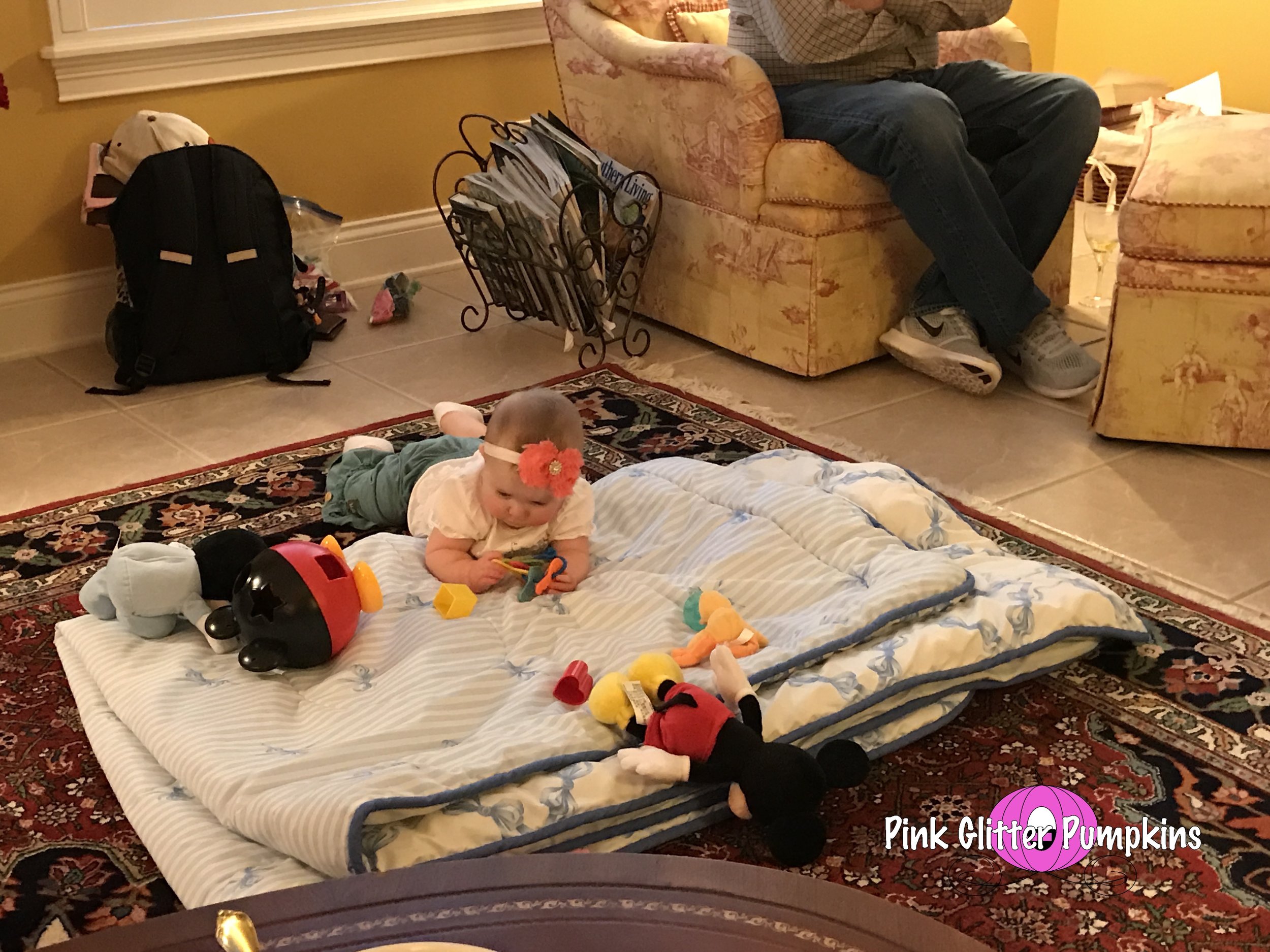 We did not buy Melody a plane ticket since she was under 2. She just sat in our lap the entire time. No one ended up in the seat beside Brad, so she did have a little bit more wiggle room. We started feeding her a few minutes before 1:00 because she was getting fussy. However, she did really well during take off, but she did not sleep until after about an hour into the flight. When she did fall asleep, she was out! I plan to do a post in the future regarding flying with a baby. So be on the lookout for that!