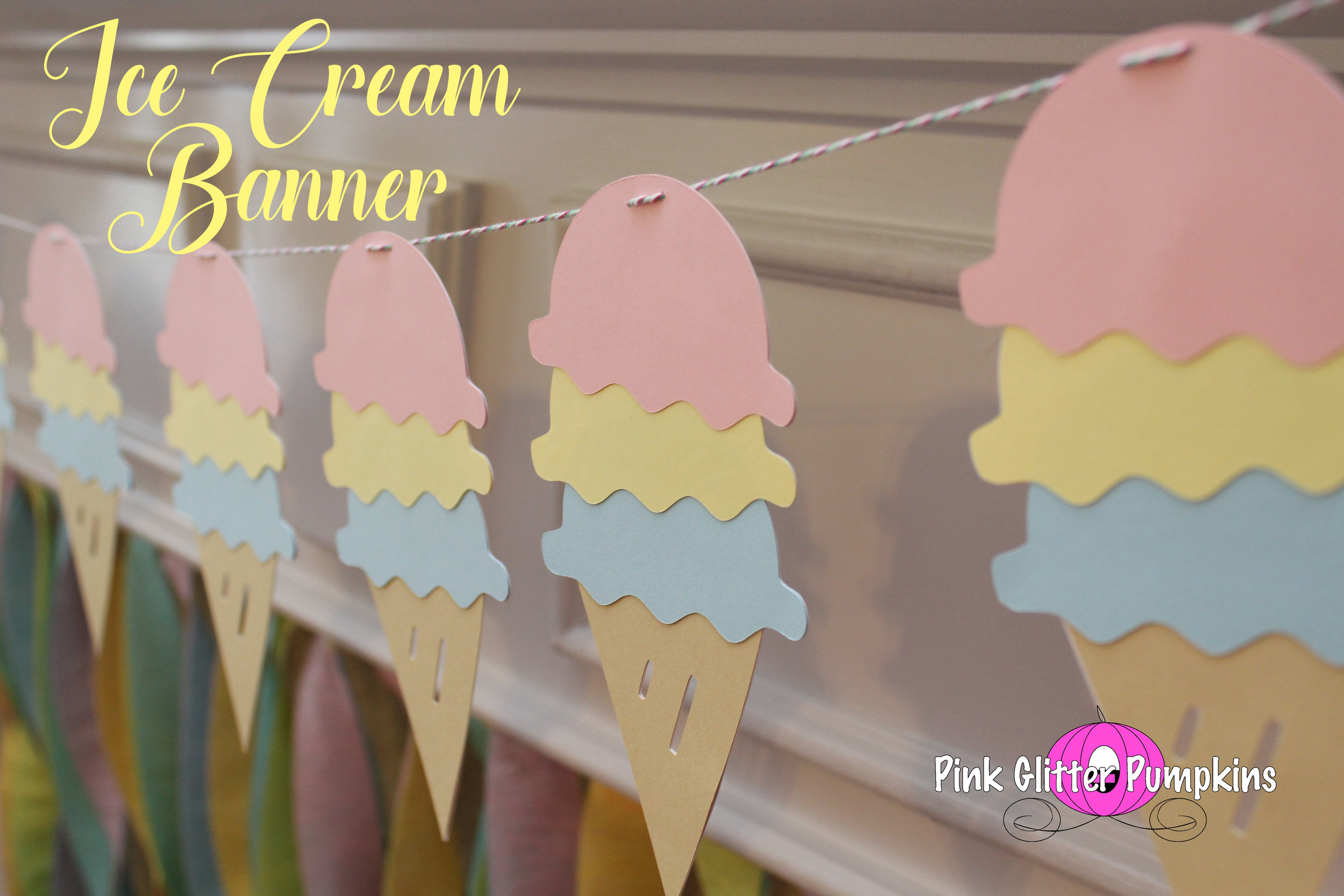 Melody's first birthday party was an ice cream themed party. I designed an ice cream cone in the Silhouette software then I used that as a staple throughout the party. One of the things I did was create banners using it. Check them out below.