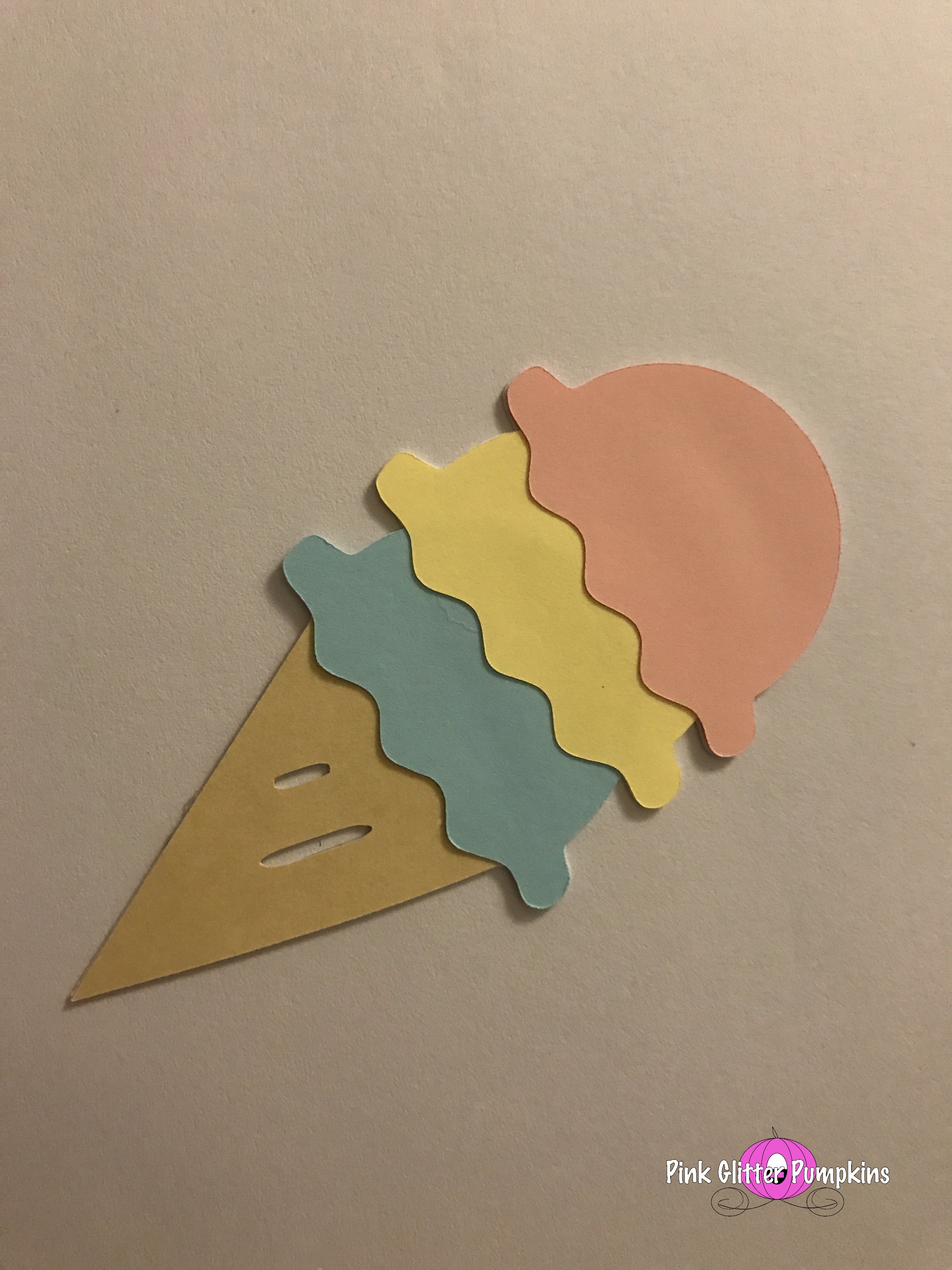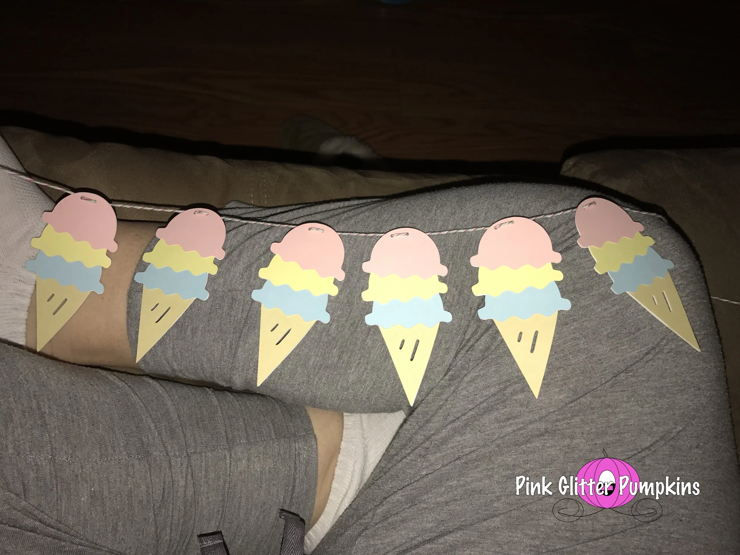 I purchased card stock from Hobby Lobby. I bought a pack of white, a pack of Earth tones for the browns, and a variety pack of pastel colors. The "main" colors were yellow, pink, and blue, so I used those for the ice cream scoops. I cut the entire cone along with the scoops out of white cardstock so that there was a "backing". It also allowed it to be less flimsy when hanging from the twine. I then used double sided tape to attach each piece starting with the cone and working my way up to the top scoop. Once assembled, I punched holes in the top, then I inserted twine to form the banner.