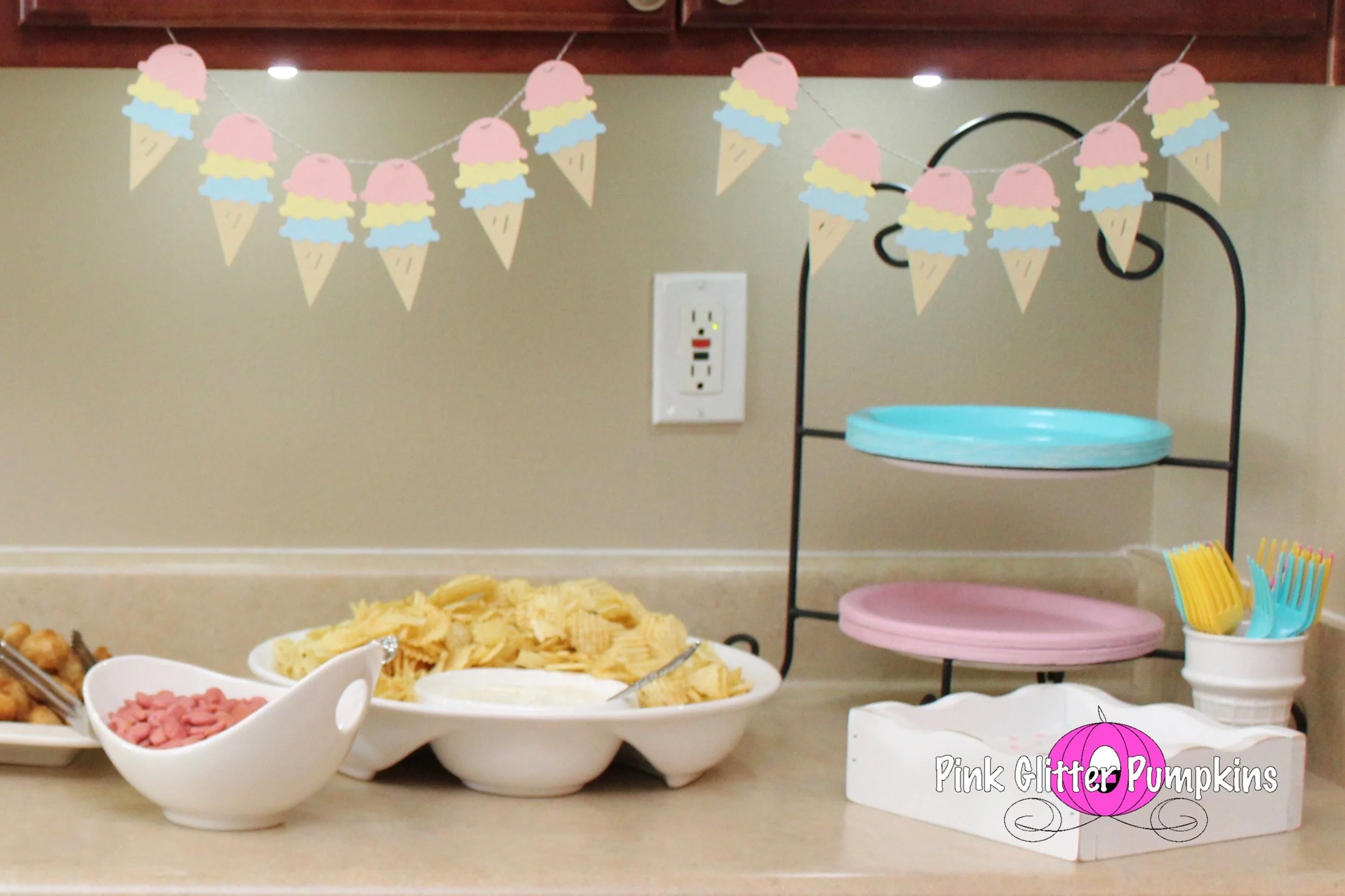 I made 5 of these banners. One of large ice cream cones to go above the mantel, and then 4 with smaller cones to attach above the food.