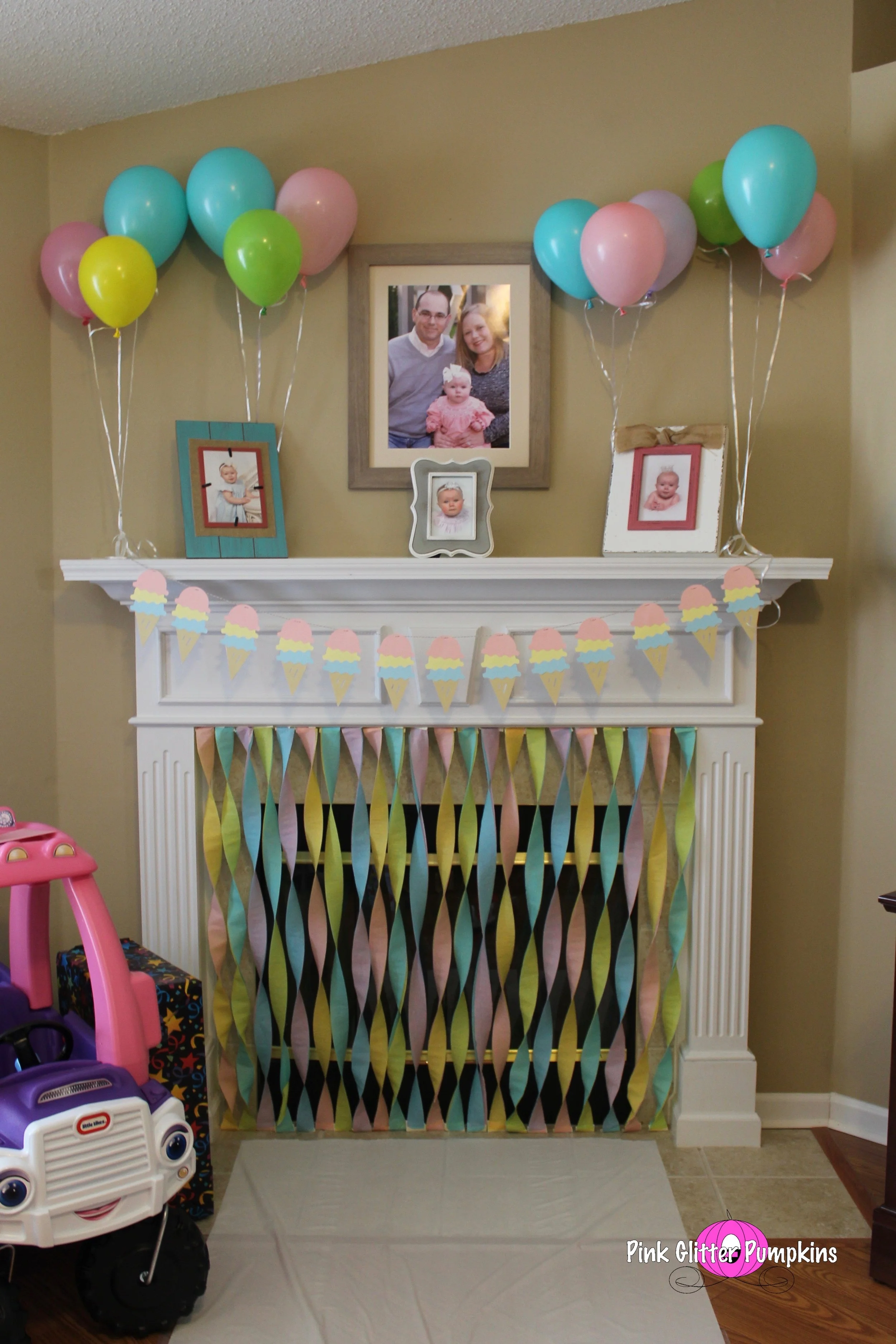 The fireplace was the focal point of the entire birthday party. The final product literally was decided on a few days before the party! I handmade the ice cream cone banner, and I decided to display formal pictures of Melody on the mantel. We then added some balloons to complete the look on the mantel. The fireplace itself was my concern. I found some inspiration on Pinterest for fireplace streamers.