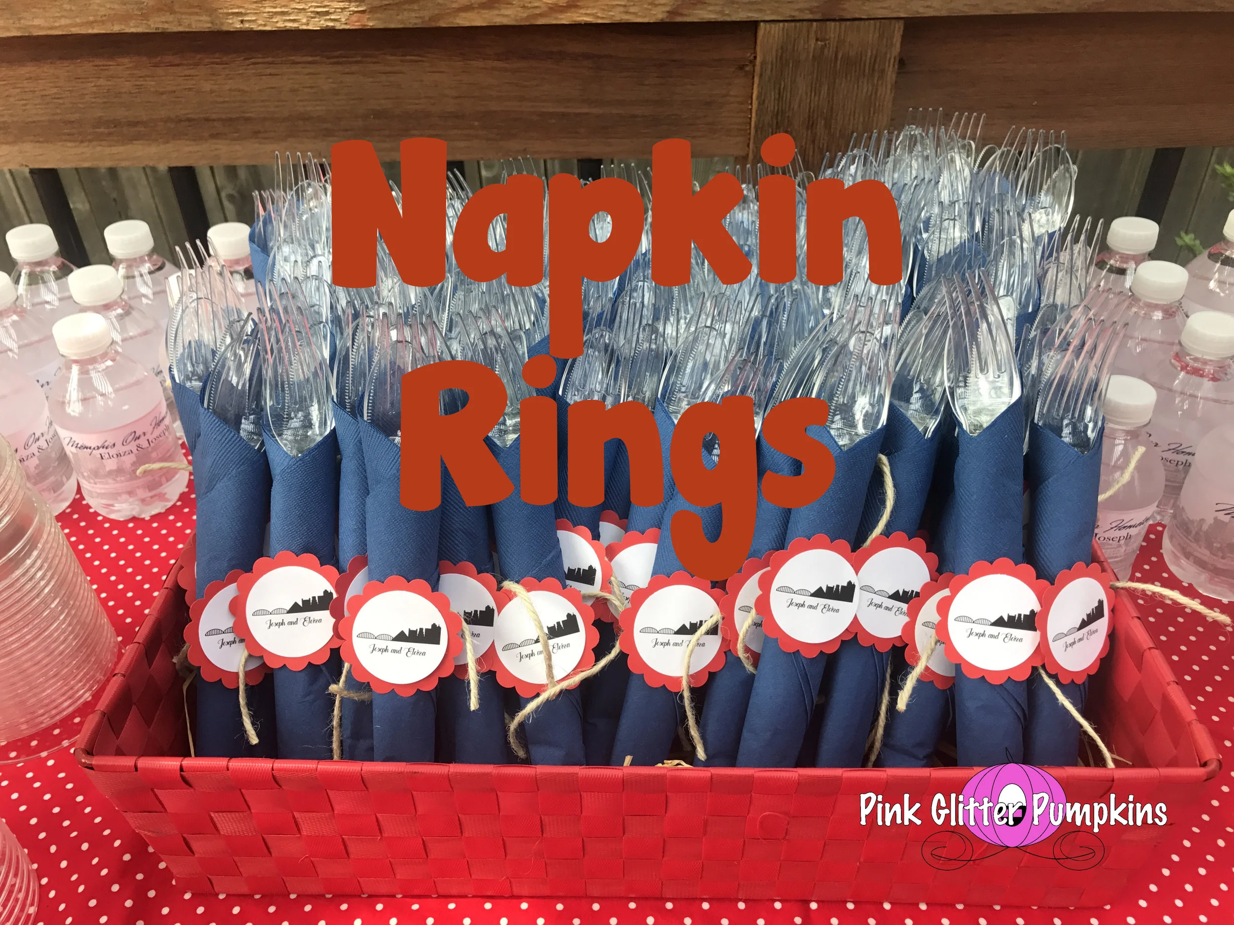 I have discussed making napkin rings numbers times [baby shower and baptism], but I liked to share different napkins rings that I do for various events. I was in charges of the napkins for the couples shower I helped host. I wanted to do something cute that tied into the theme very well. Check out what I did below!