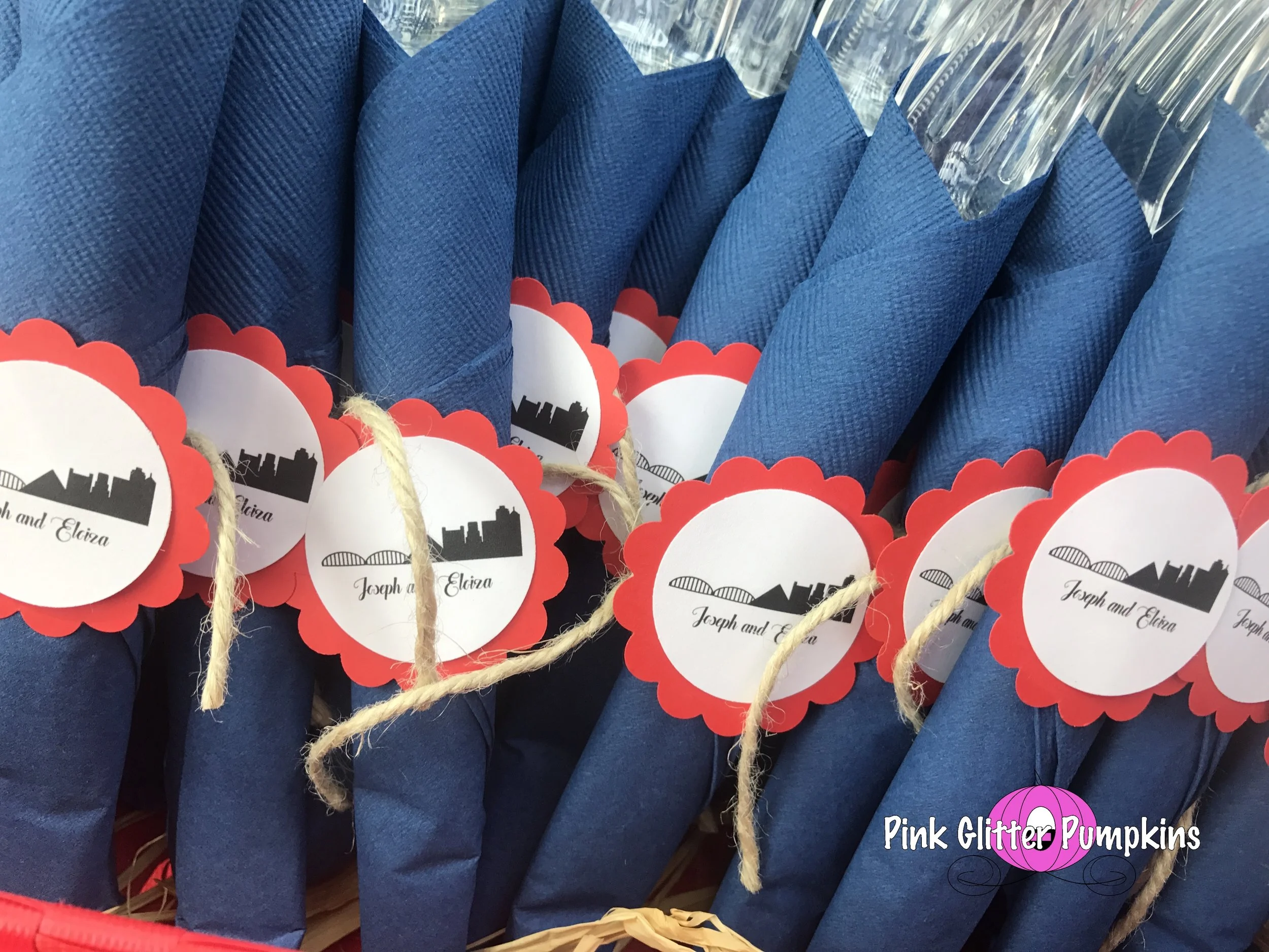 The colors were red and blue, so we bought blue napkins and used red cutlery. Like my previous napkin rings, I knew there would be two layers. I wanted to print the Memphis skyline along with the couples name on white cardstock. That would be the top layer. So I had to find a good color to go in between the white cardstock and the blue napkin. I found numerous pieces of cardstock I liked at Hobby Lobby, but I purchased two just to see which would look better once I got one. A solid red one and a black one with musical notes. Musical notes would go well with the Memphis hometown theme.