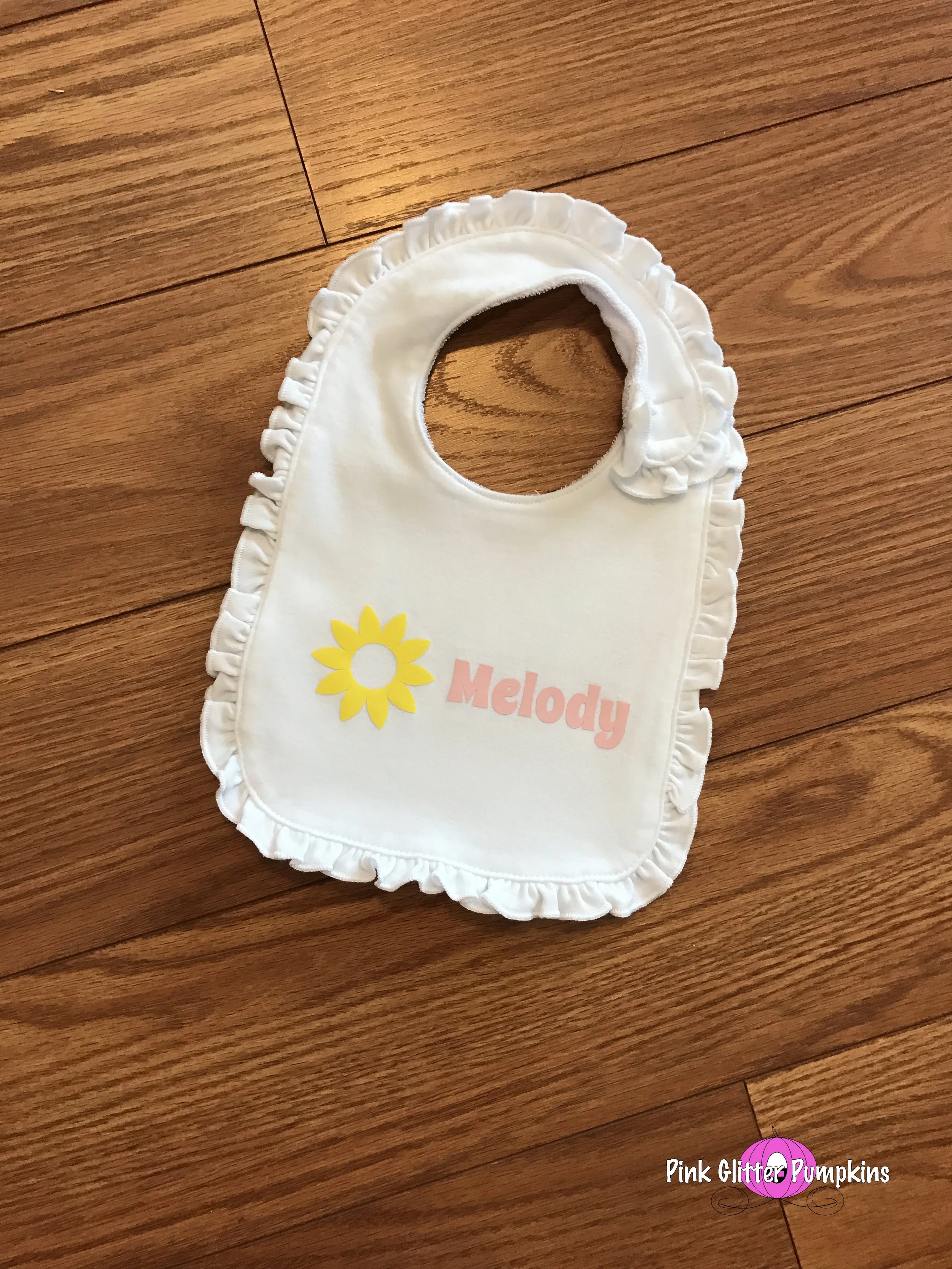 I used the Cameo to do some Easter presents for Melody. First was a cute Bunny shirt. This was another design I used my free credit to purchase. I added her name in pink to these cute Easter pajamas. The font was one I used my credit to purchase. Lastly was the bib I made. The sun and font were both designs preloaded onto my software. I purchased the shirt, pajamas, and bib from Blanks Boutique.