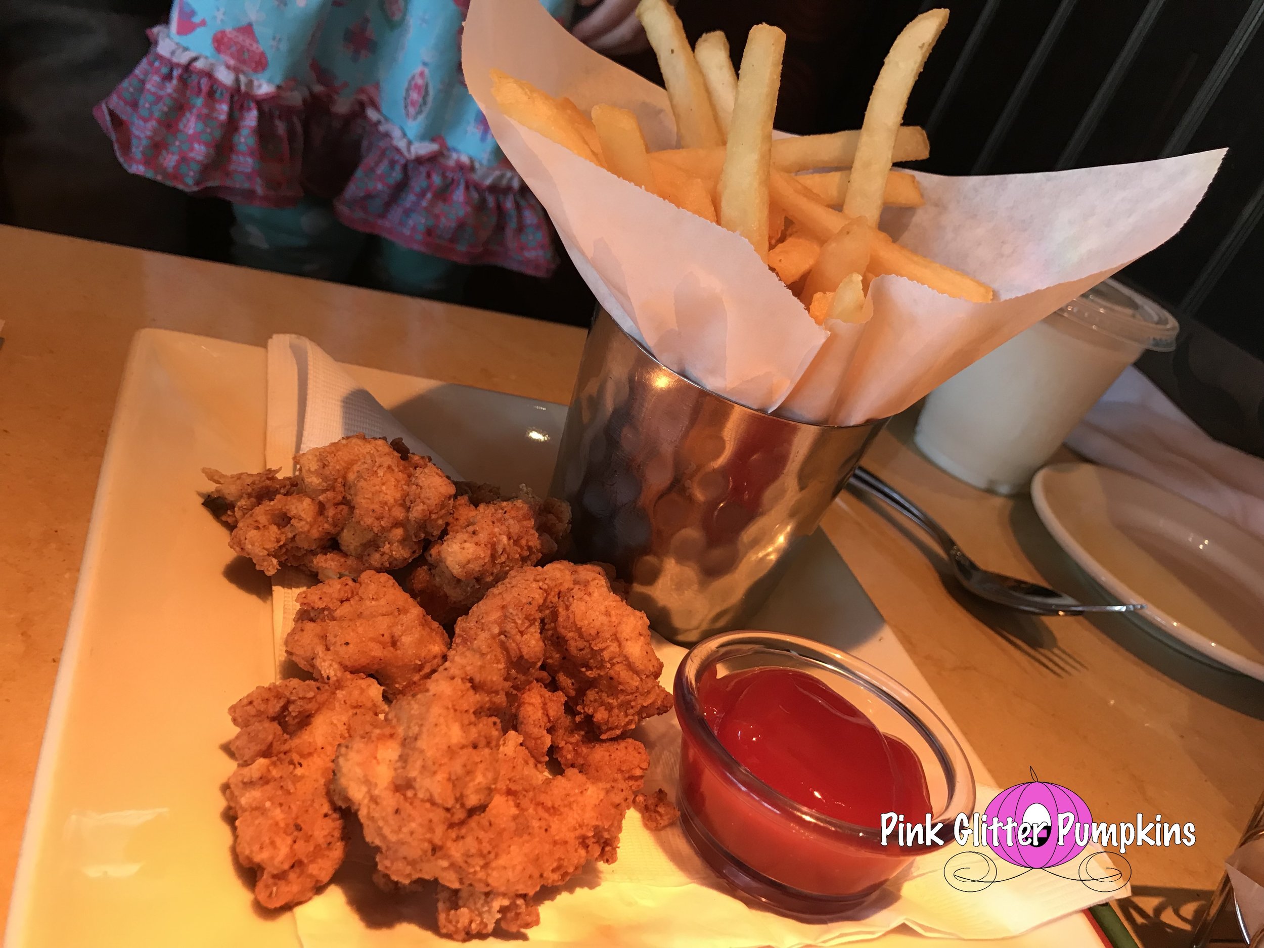 We ordered Melody the kid’s chicken fingers and fries (which she barely touched). I tried the chicken, and it was really good. They are smaller pieces of chicken which was easier for Melody to eat (the two bites she did have). And that meant that every bite had the right amount of crispiness to it.