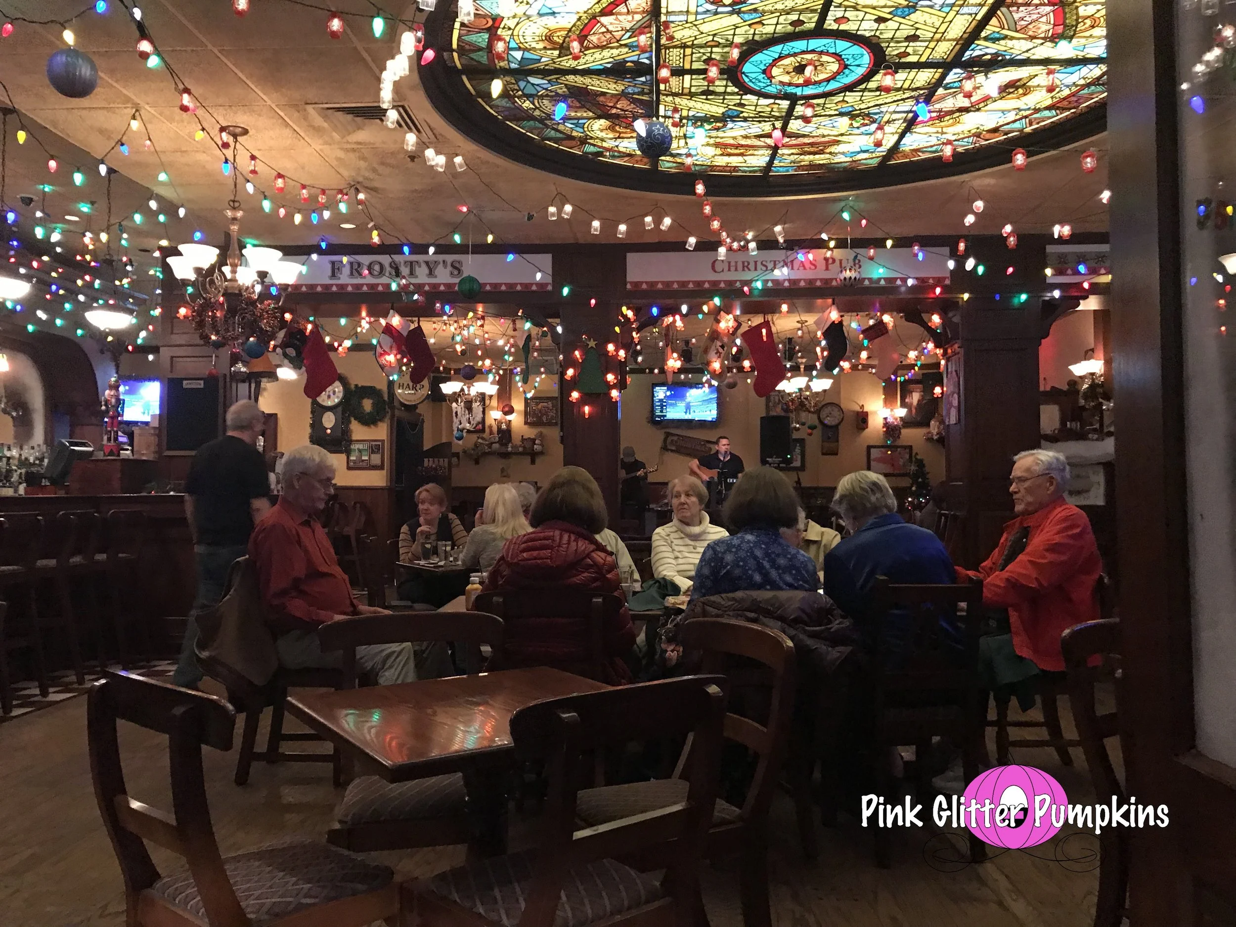 We decided to go to Finley’s Pub (Frosty’s Pub during the holidays). We were one of four tables when we arrived. The sign said seat yourself, so we picked a booth style table that had a couch and 2 chairs (we pulled up a third one from another table). It was on their faux balcony area. They had a lot of Christmas lights all throughout the restaurant.