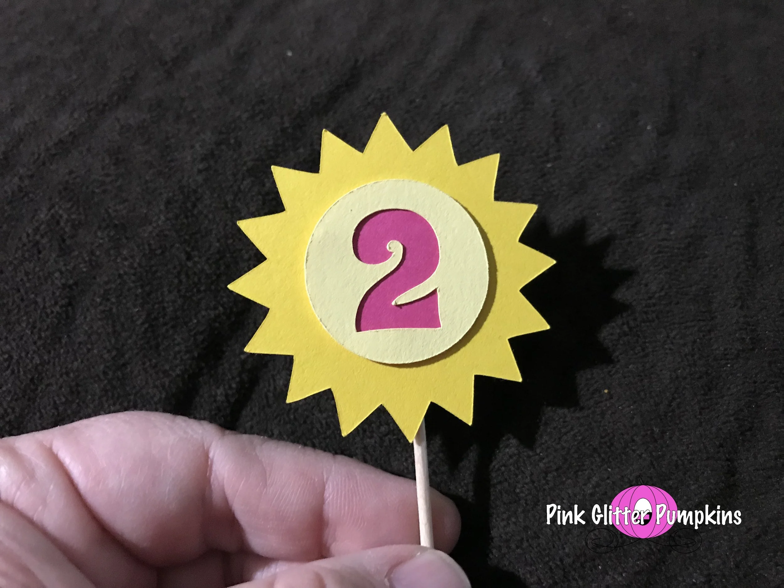 I basically used the same sun I used on her invitations. I did a combination of the sun with a "2" and a plain sun. Just as I did with the invite, I used double sided tape to attach the sun together. Then I attached a toothpick to the back of each sun using regular tape.
