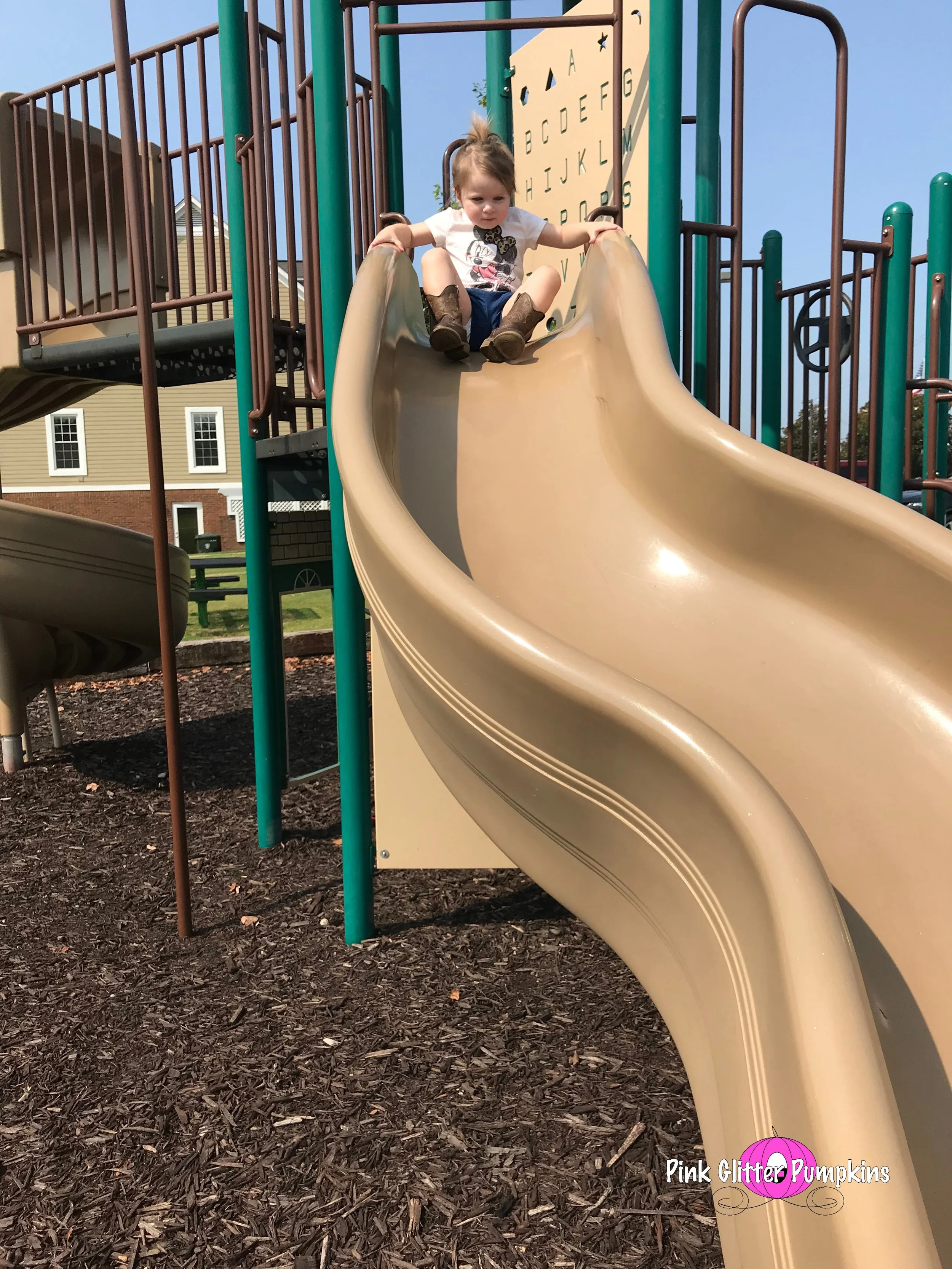 I asked her what she wanted to do, and she wanted to go to the playground in our neighborhood. So we first attempted that. Well that didn't go super well because all the equipment was way too hot for her legs!