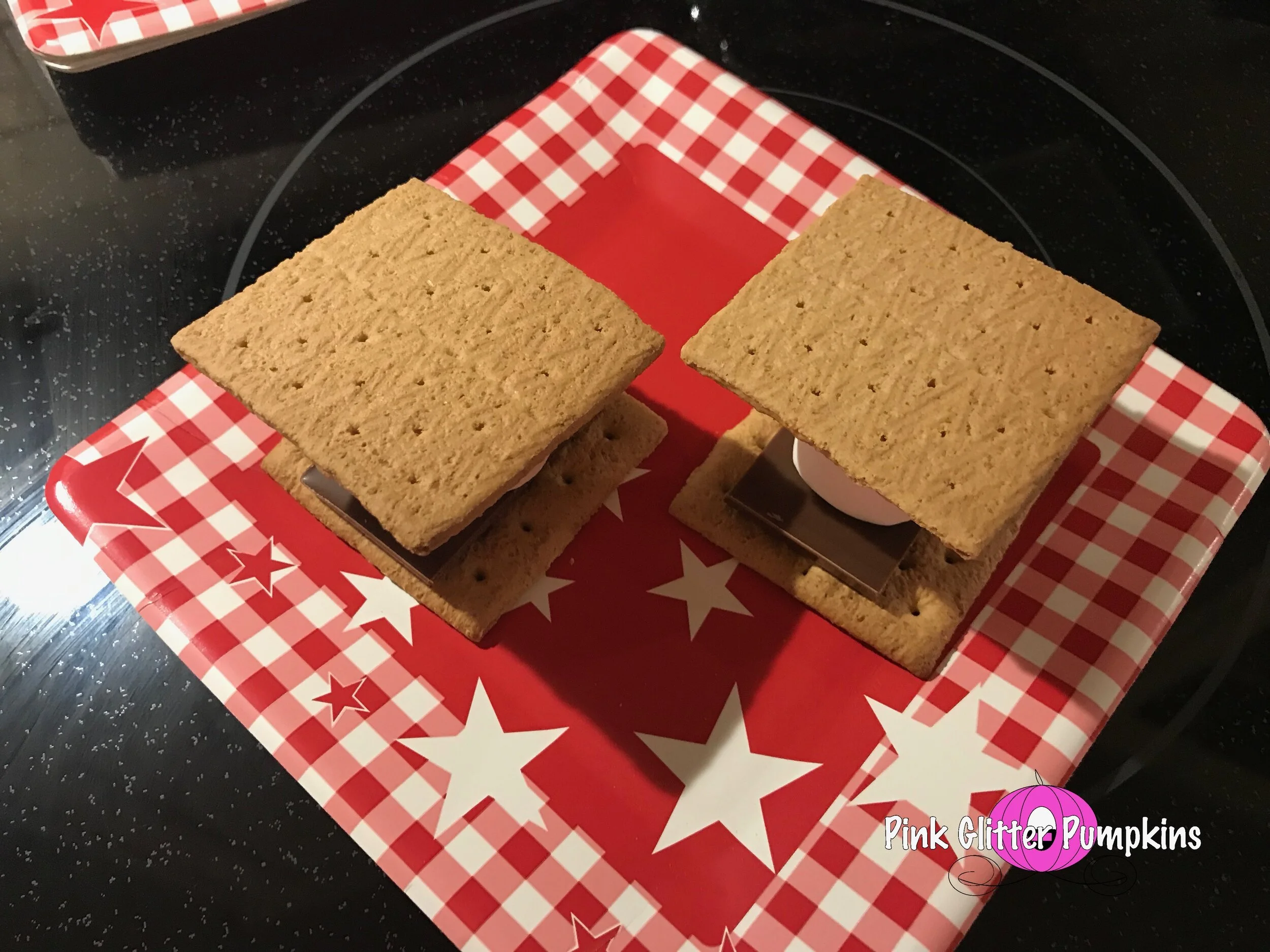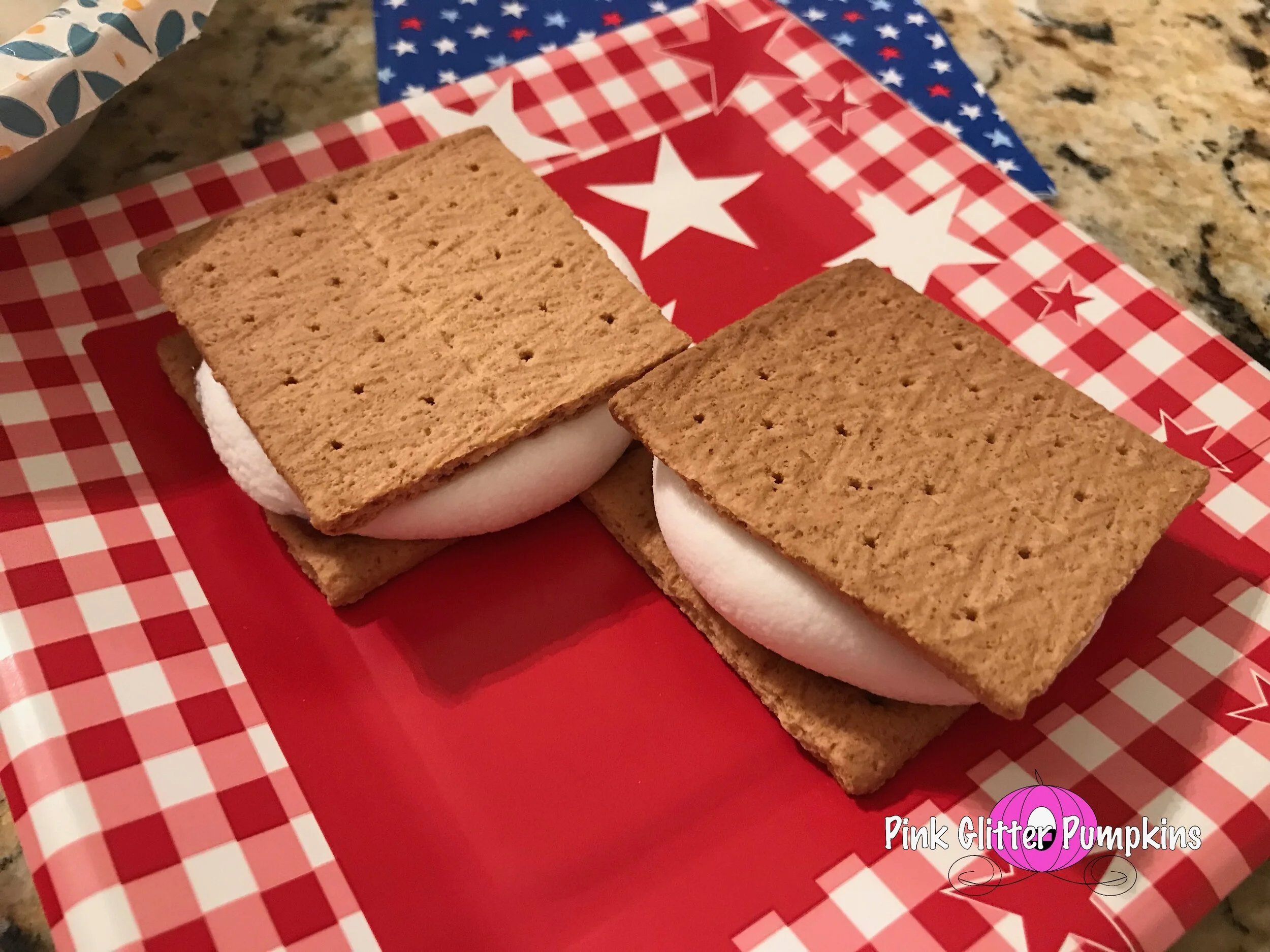 1. Assemble your Smores. I leave the top graham cracker off sometimes because it often falls off in the microwave.