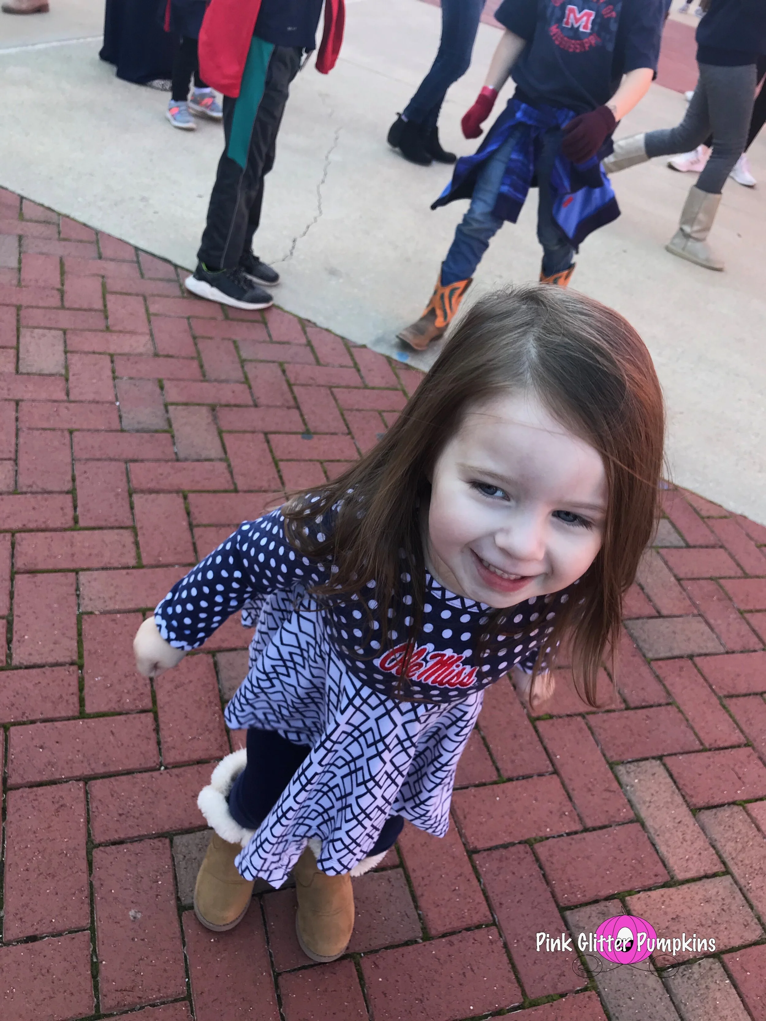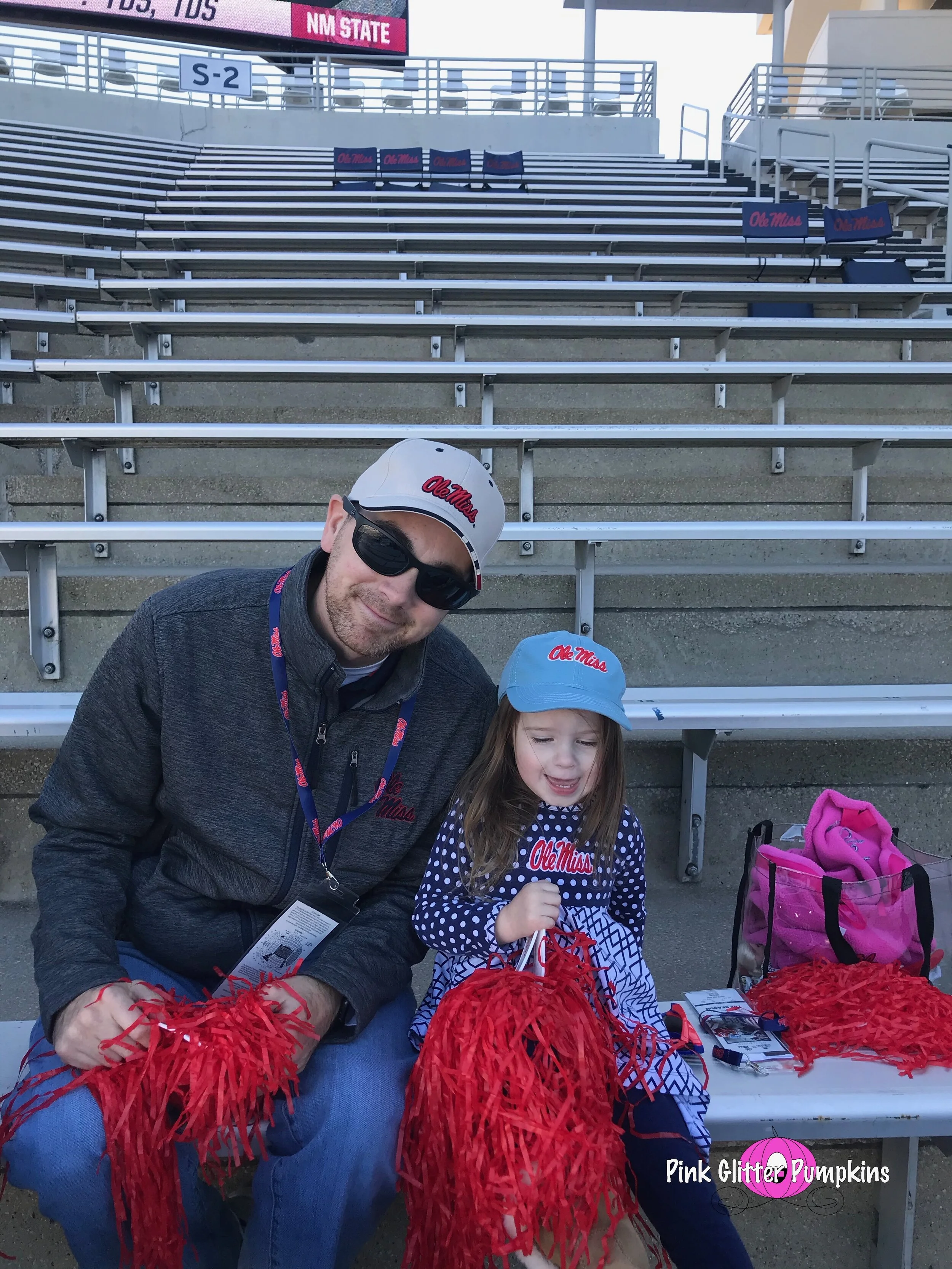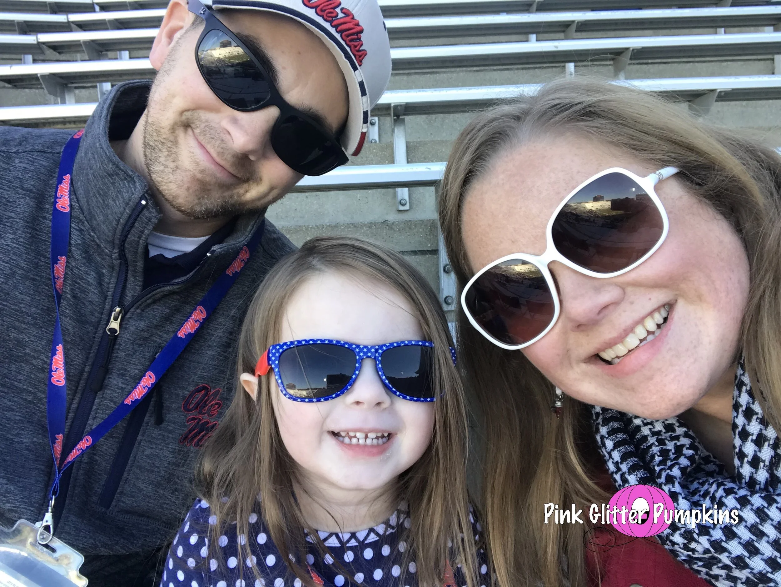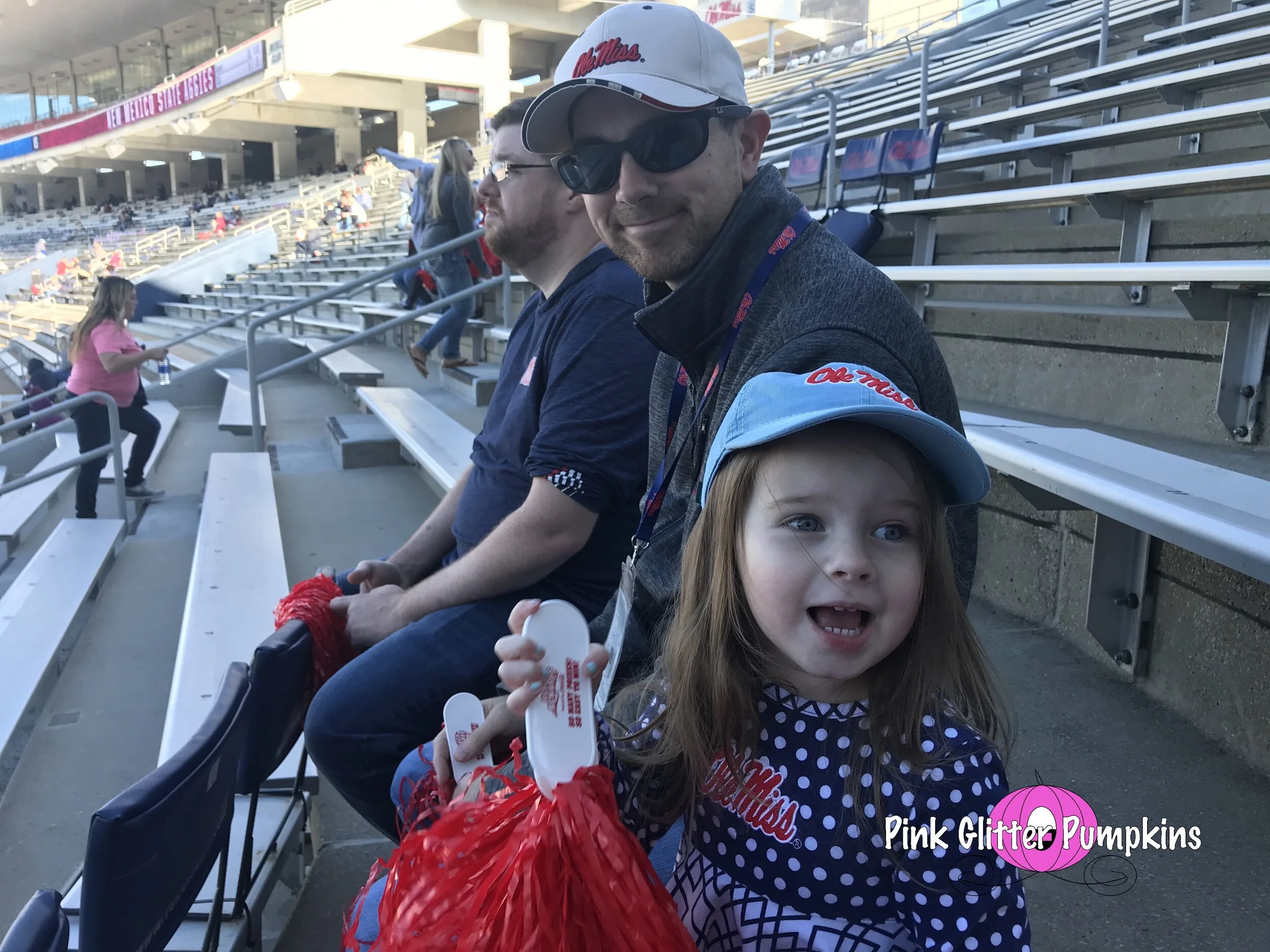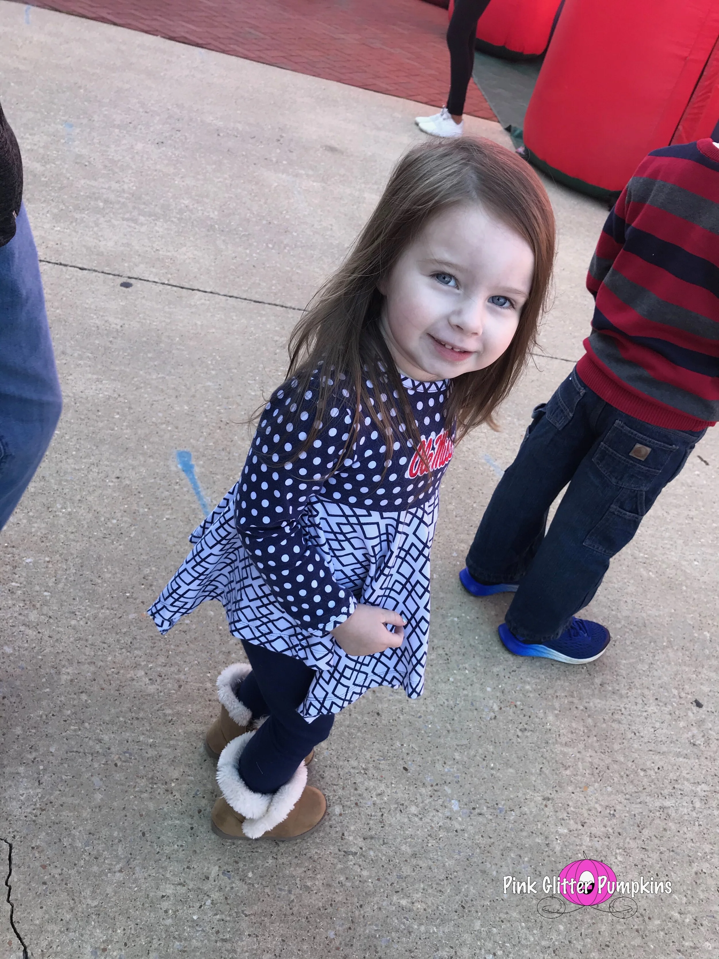 So last year, Melody attended her very first football game. It was a local high school game where my alma mater was playing. Well this year we decided to take her to her first college football game. My husband is a graduate of Ole Miss, and we continue to have season tickets there. They were playing a smaller game in November, so we decided that would be ideal for her. A friend of ours that has season tickets behind us let us have one of theirs for this particular game.