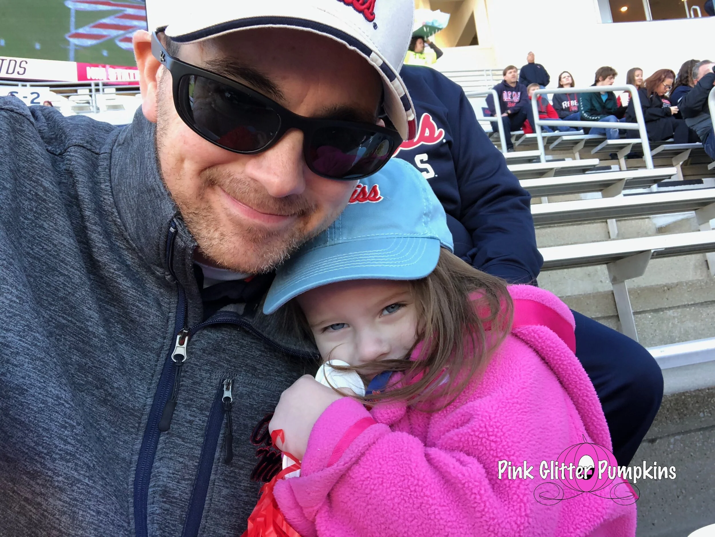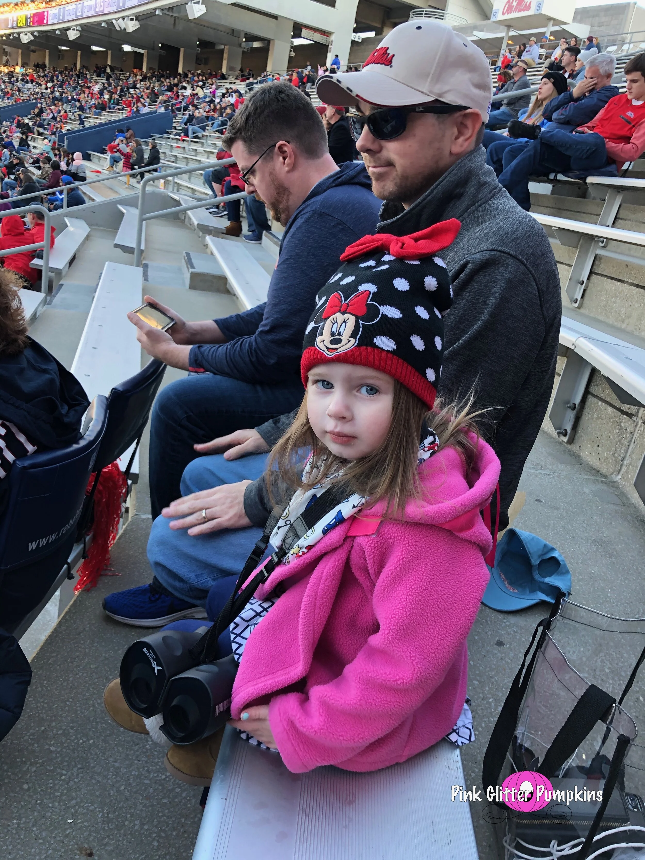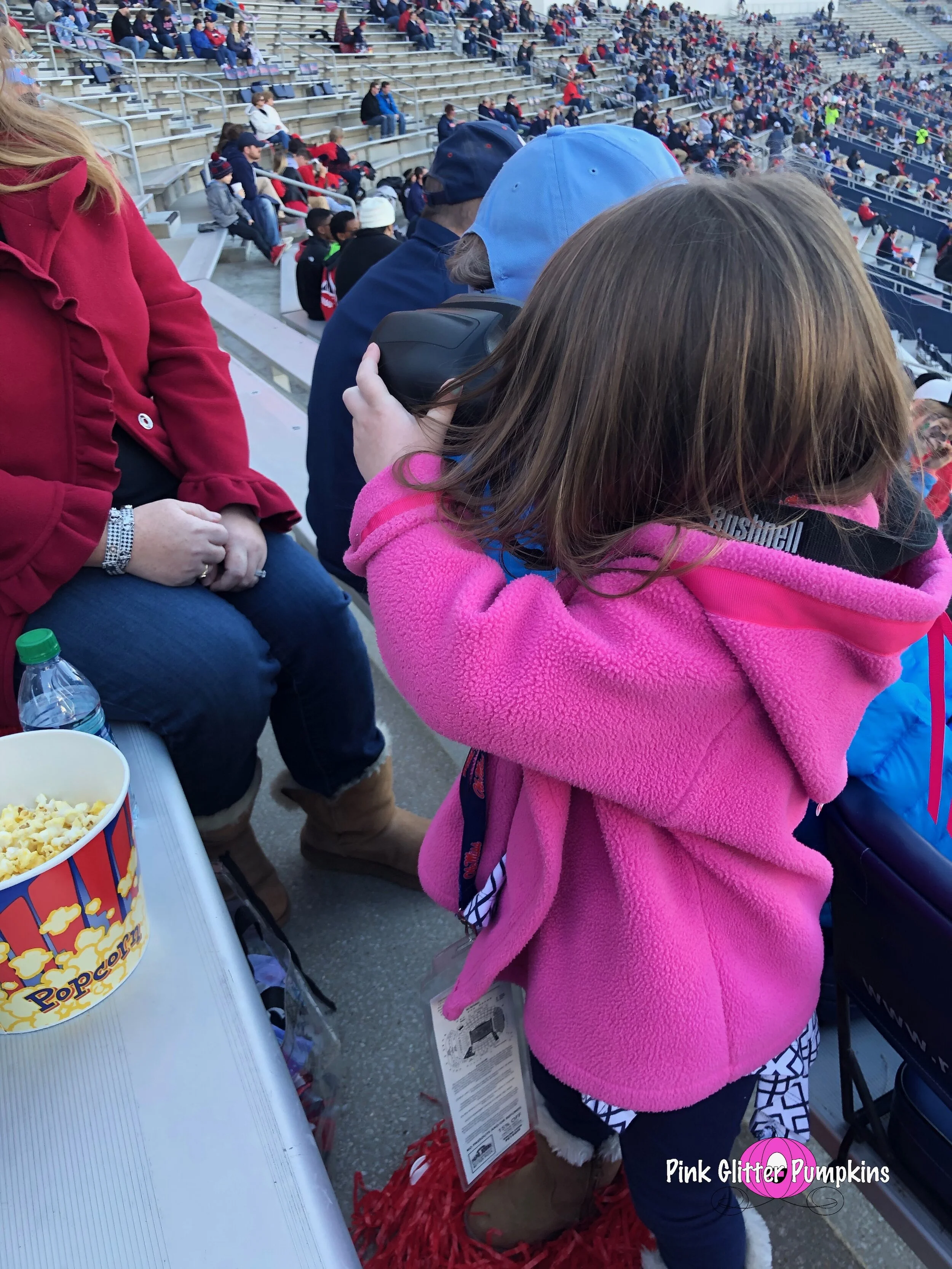 The game itself was not overly crowded which was perfect for Melody. She loved all of the food and all of the attention she got from those around us. Brad has sat in the same spot for a number of years, so we have become really close with those around us. She had fun watching the game along with the band and cheerleaders. She loved the binoculars the most. Hopefully next year we can take her to a few more games and maybe even an Alabama one!