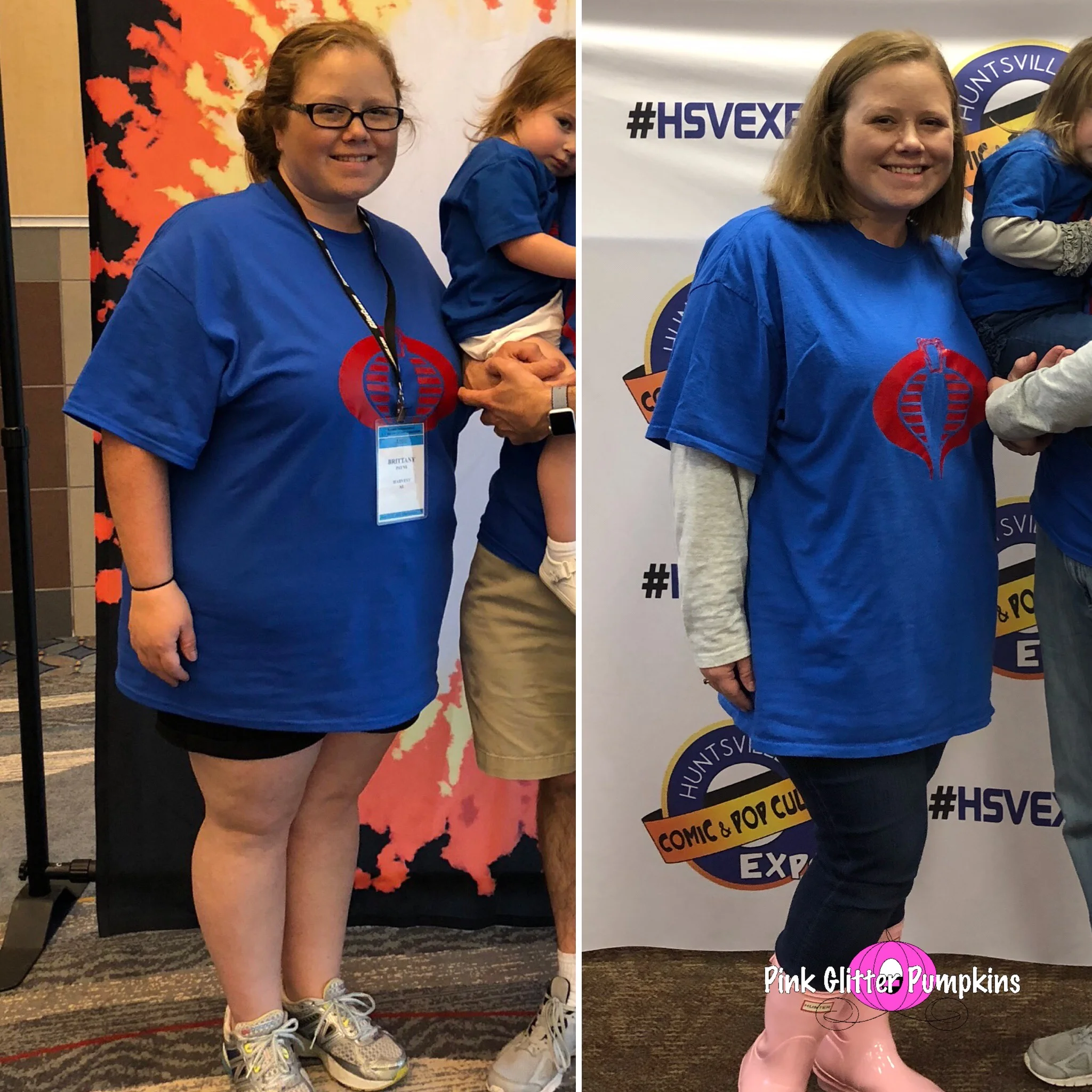 *And lastly, here is a fun before and after for you. The first picture is from our Joe Con visit back in June. I started my weight loss journey back in October, so it is neat to be able to do these pictures.