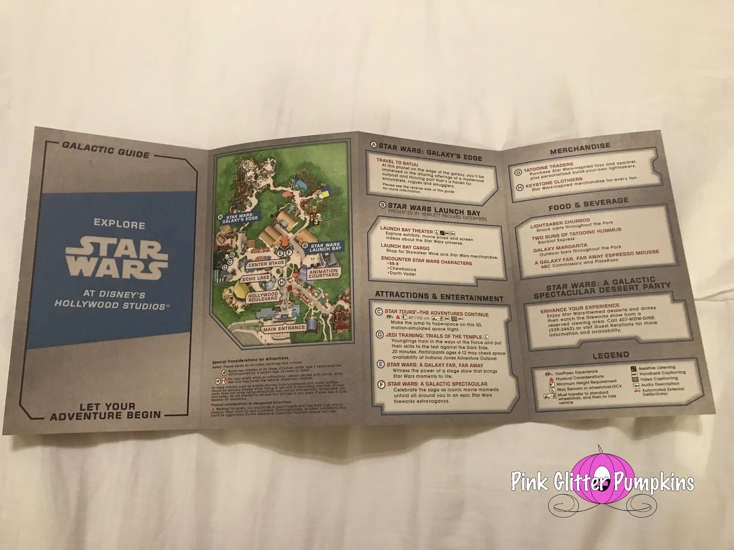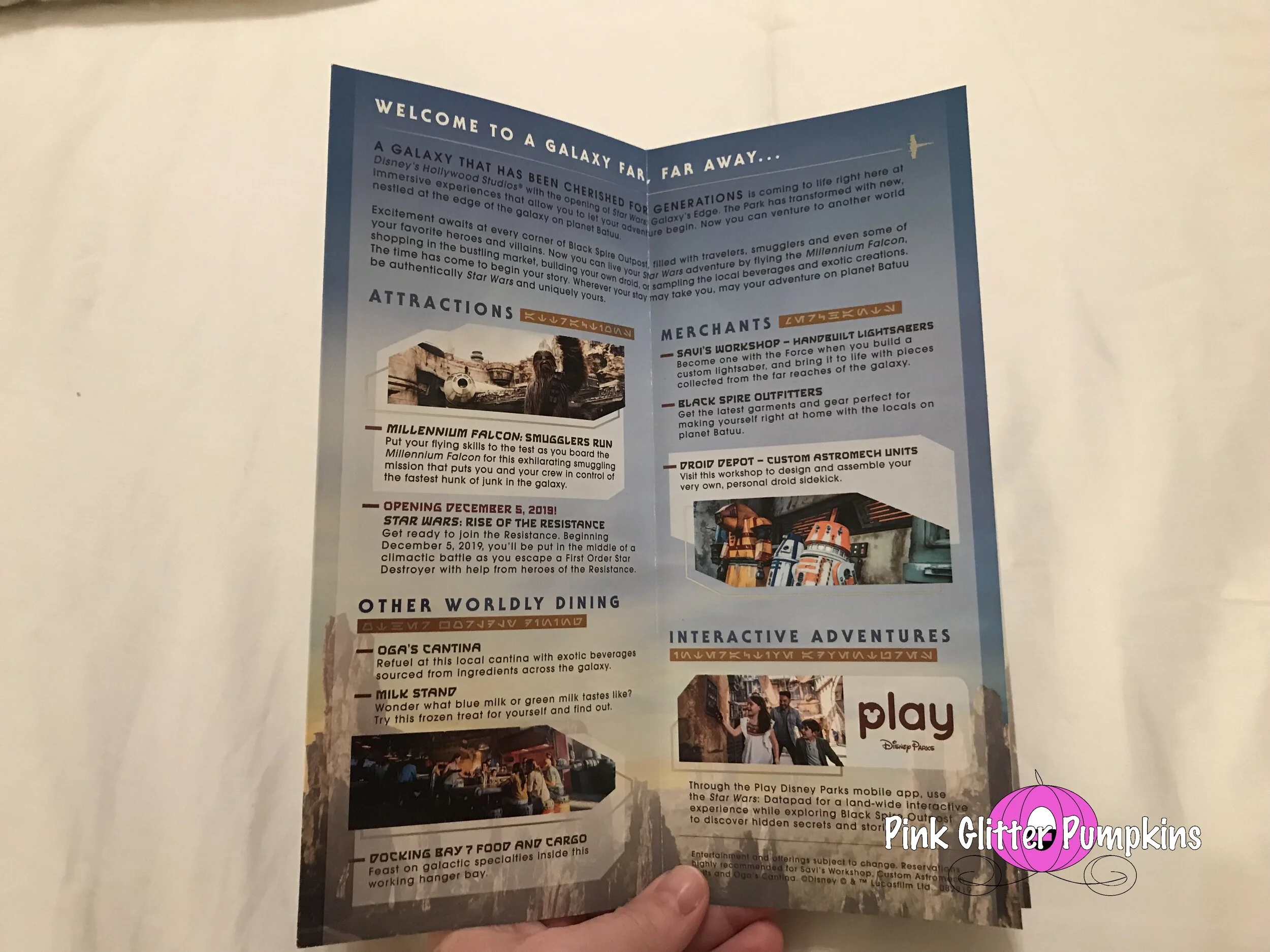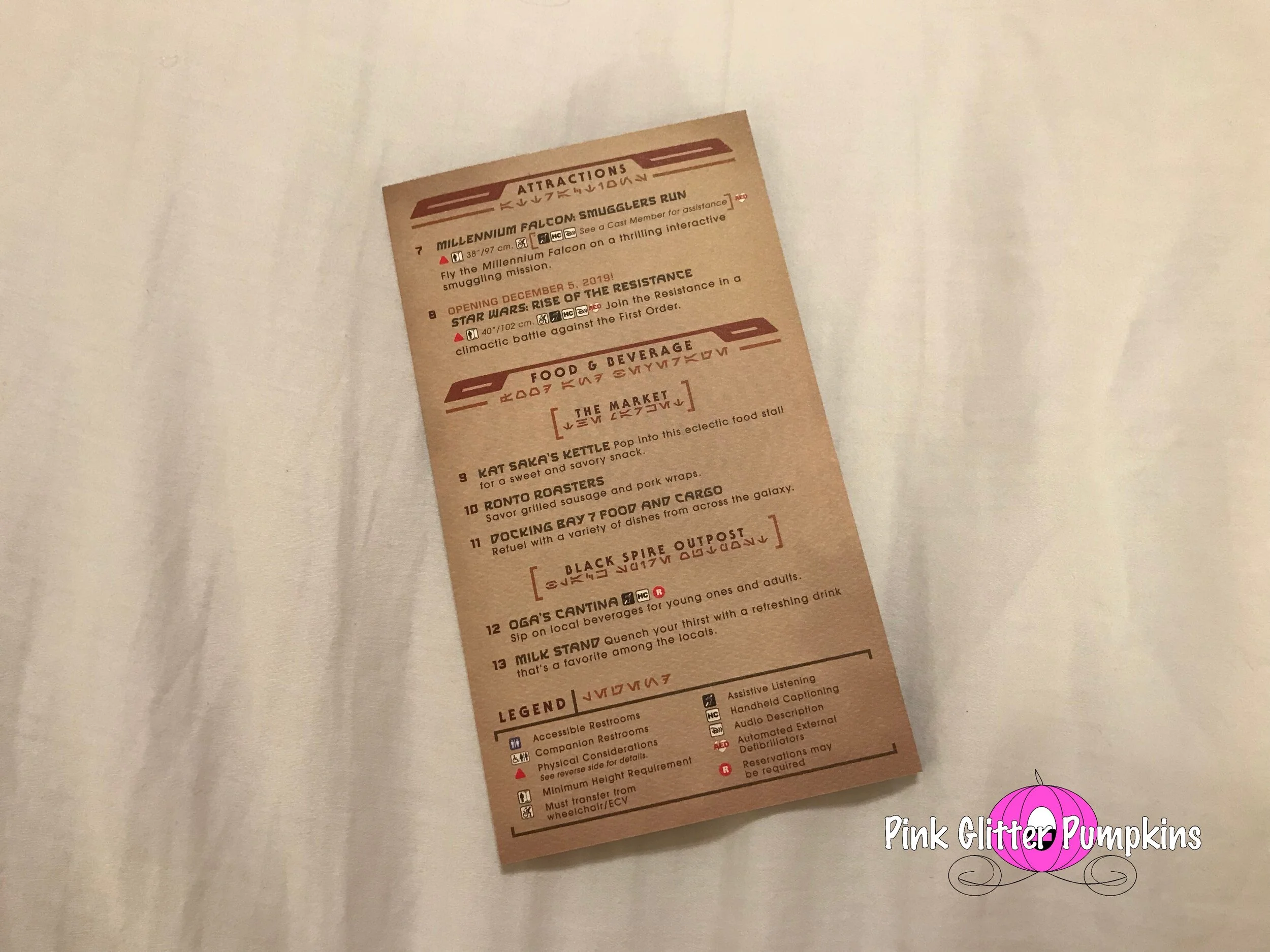 Also below are the maps we were given while at the parks. The first map you see is the standard park map you normally would get. We found found these at the entrance of the parks where all the park maps are located. The second park map is a much nicer map made for the opening. It is made of higher quality paper, and changes color with the light in some spots. It also provides more information about Galaxy’s Edge. These were handed to us as we walked in the park. The third map was exclusive to Galaxy’s Edge. It does not provide anything for the other areas of Hollywood Studios. It is made of an even heavier cardstock, and it provides a lot of information about the area. It is also pocket size to make it handier than the larger maps. These were handed to us as we entered Galaxy’s Edge. All very nice keepsakes.