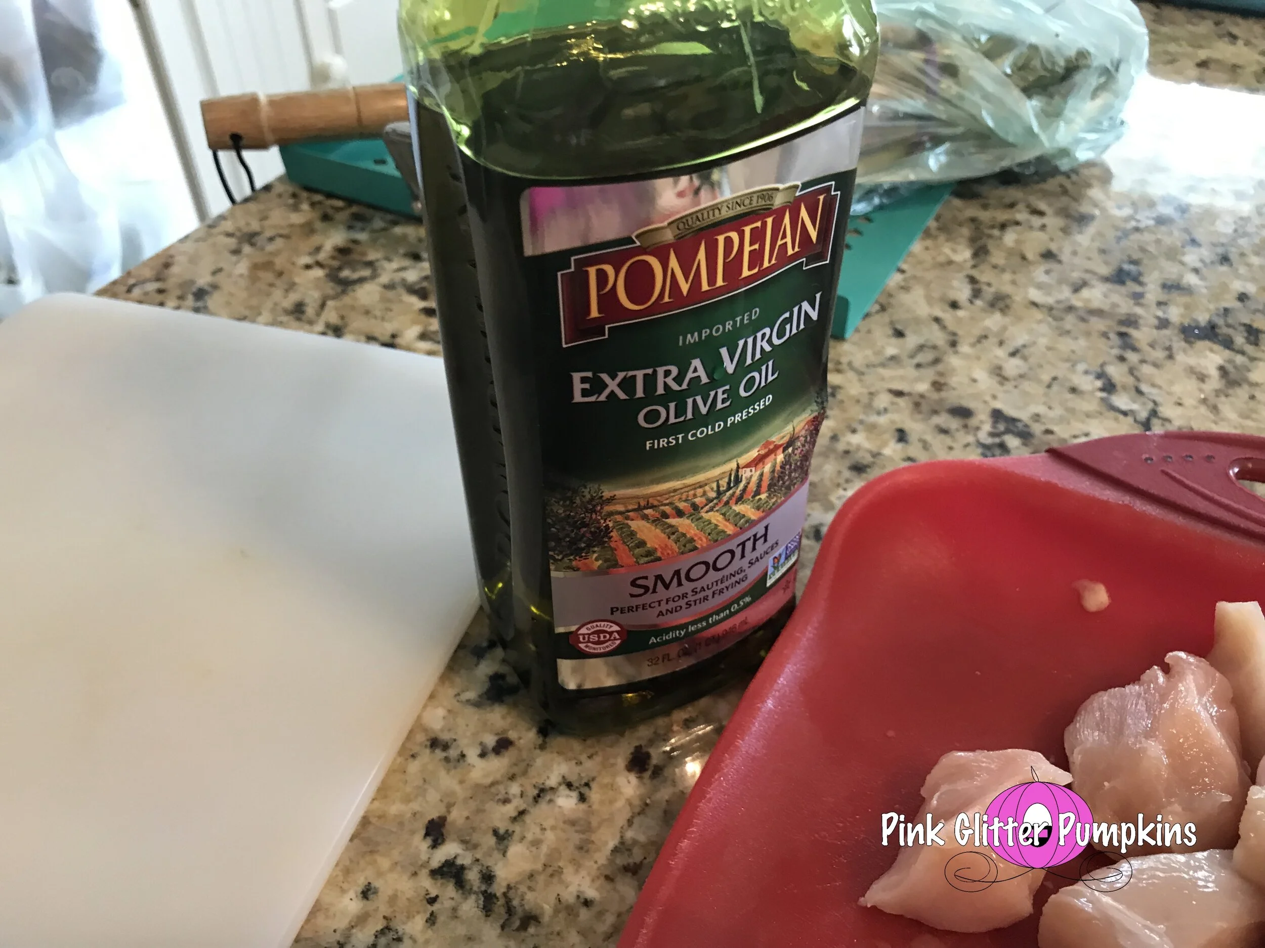 2. Make sure the skewers are covered in EVOO. This keeps them from burning too easy and allows the food to slide on and off easier. Then add the chicken and veggies. Since we had so many veggies, we made some skewers only veggies.
