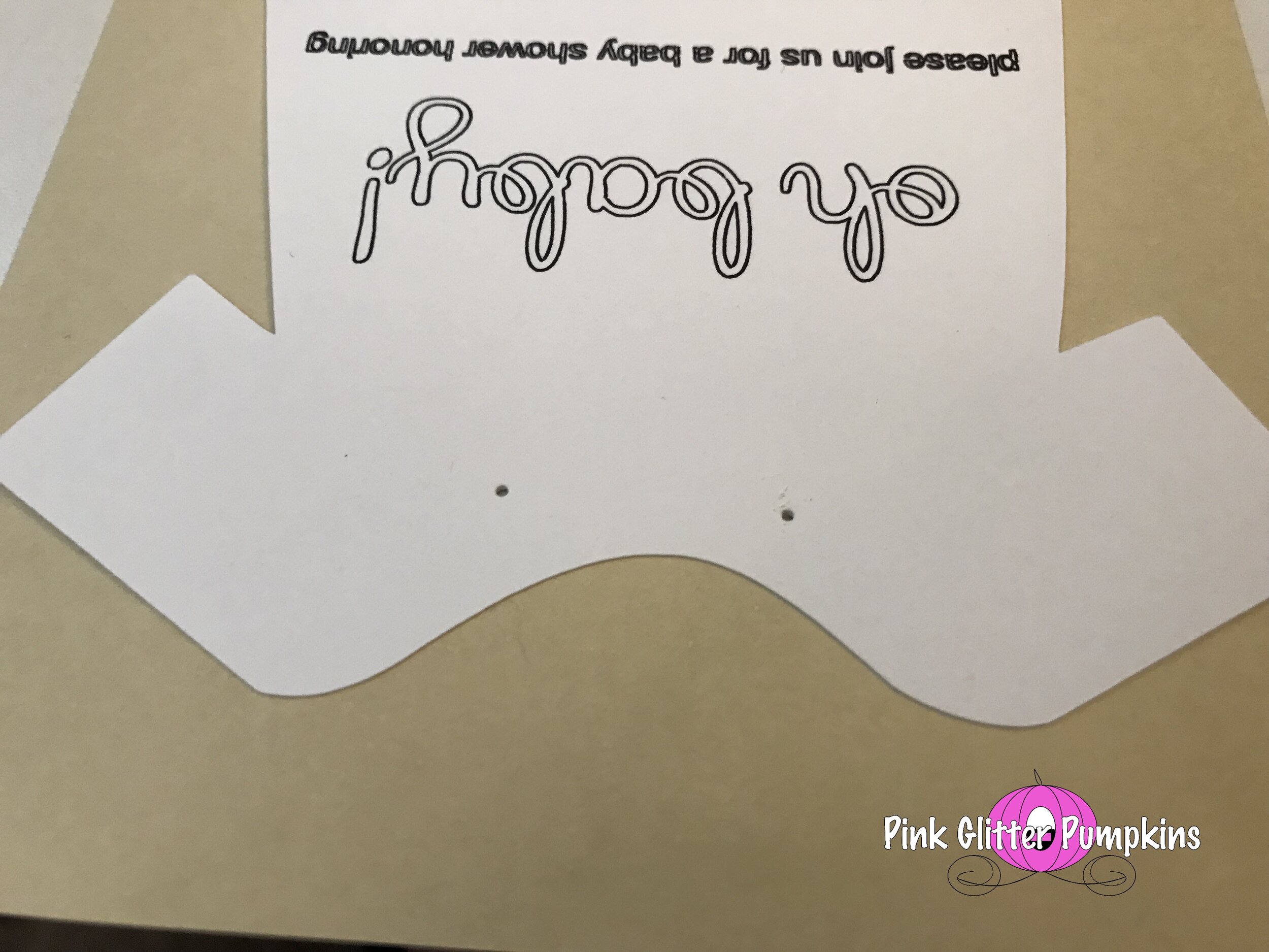 I found Kraft paper from Hobby Lobby half off one week. I cut these in half width wise and that was my background. Then using my Silhouette Cameo, I designed a baby onesie and cut it out of white cardstock. I used my Silhouette Cameo to also write out the wording on the invitation. I used just a black pen for this. Then I had to find a way to attach the onesie to the Kraft paper. Glue was a possibility but not my favorite idea. I did this for Melody’s Snow White invitations, and while it worked, it wasn’t ideal. I hole punch would not really work due to how low I wanted to attach it. So I made my own holes. I started with a push pin. I push the holes through using it first in the exact locations. Then I used a wooden skewer to gently push the hole wider. And ta-da! I then used baby blue ribbon to attach the two through the holes.