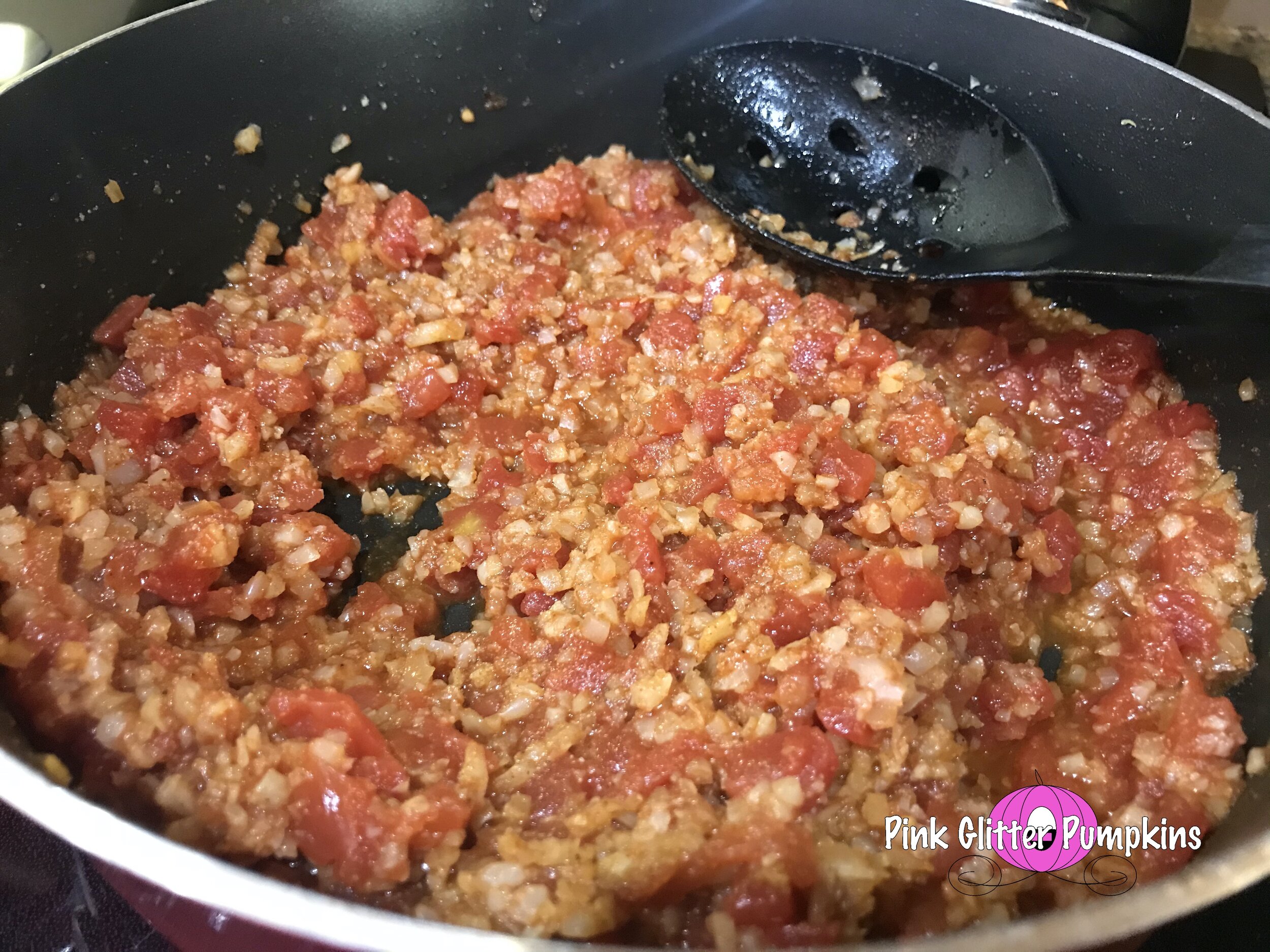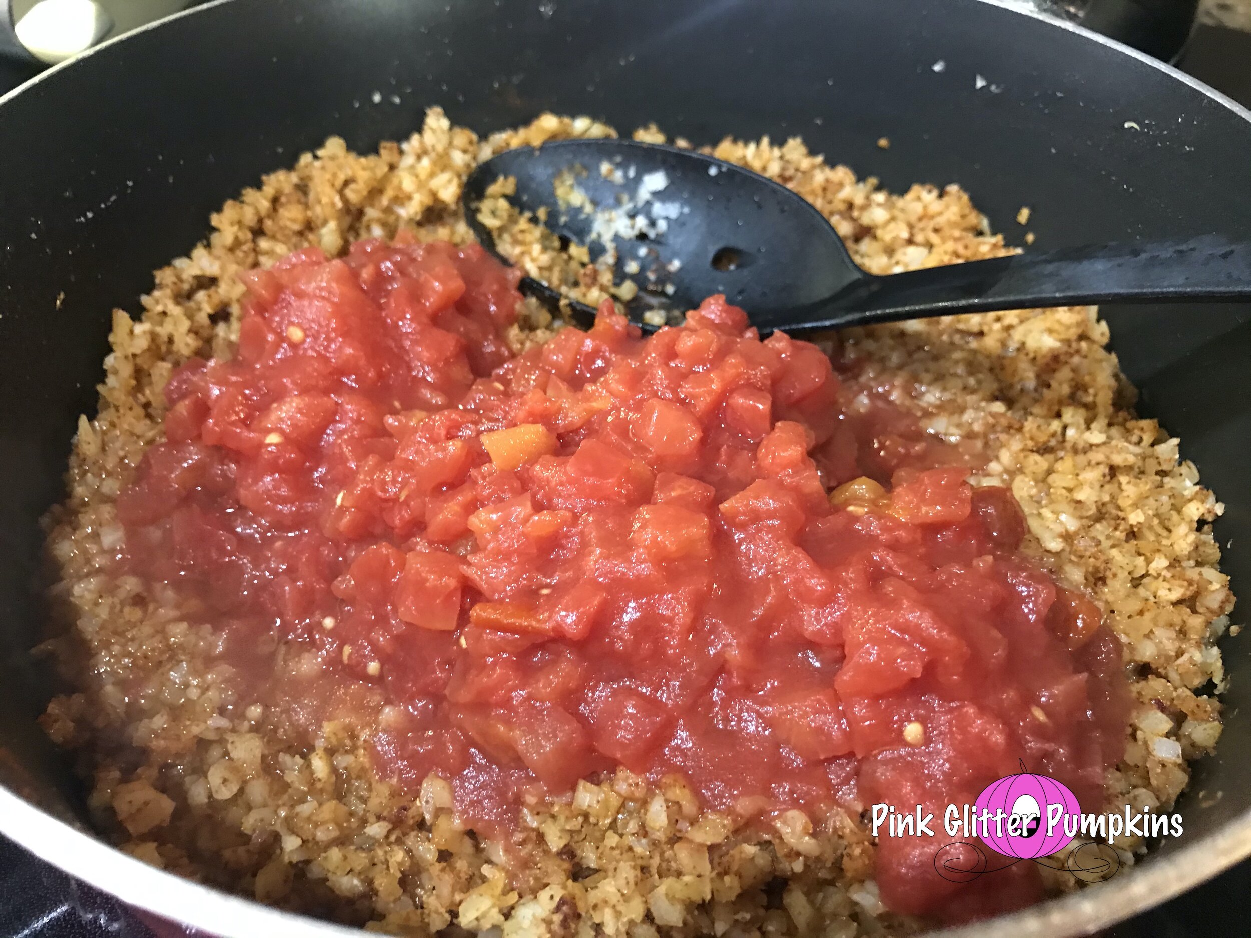 3. Add the rice to the original pan and cook for about 3-5 minutes on medium heat. Add in all of the spices and mix well. Add the tomatoes and broth and bring to a simmer.