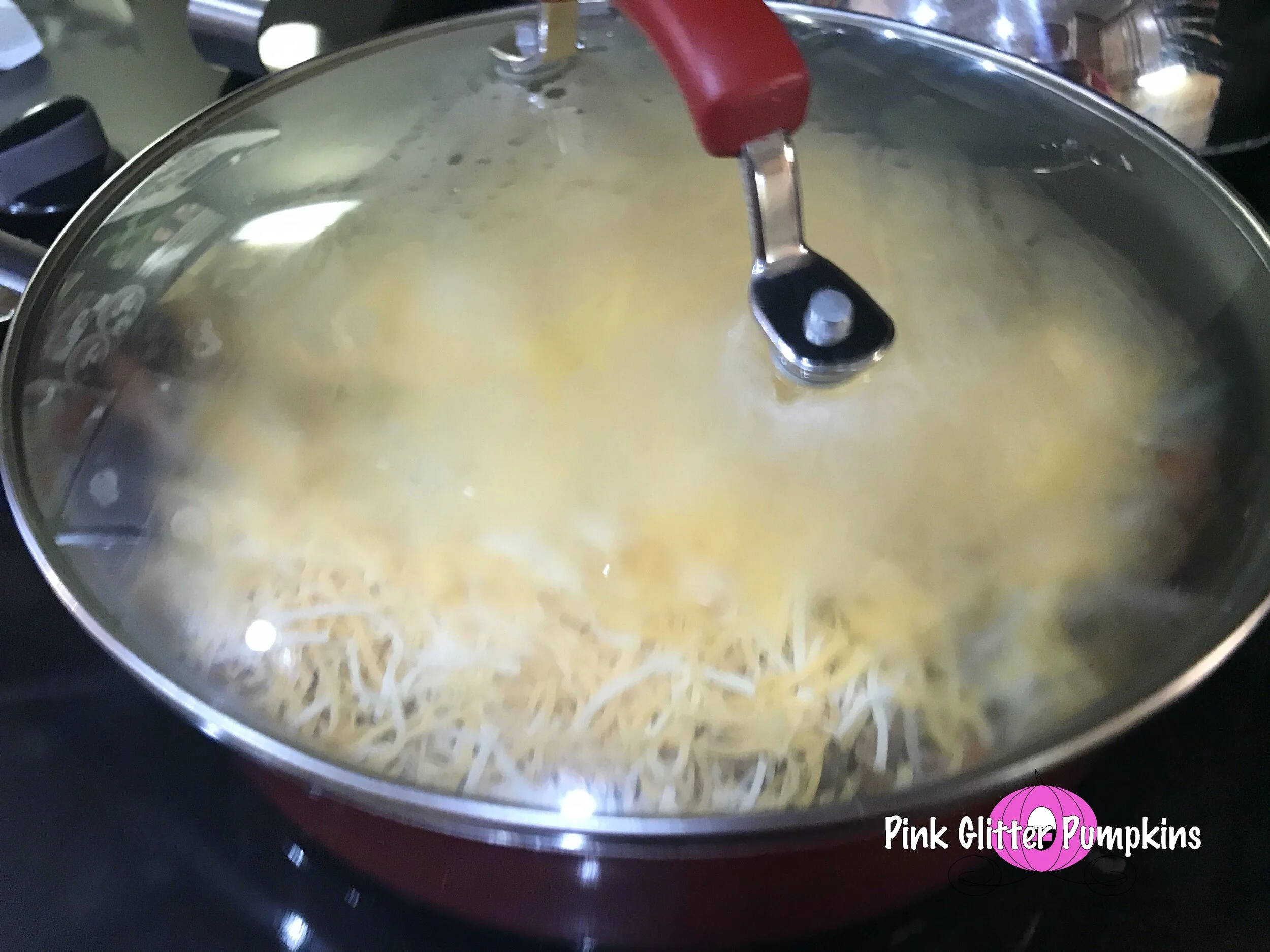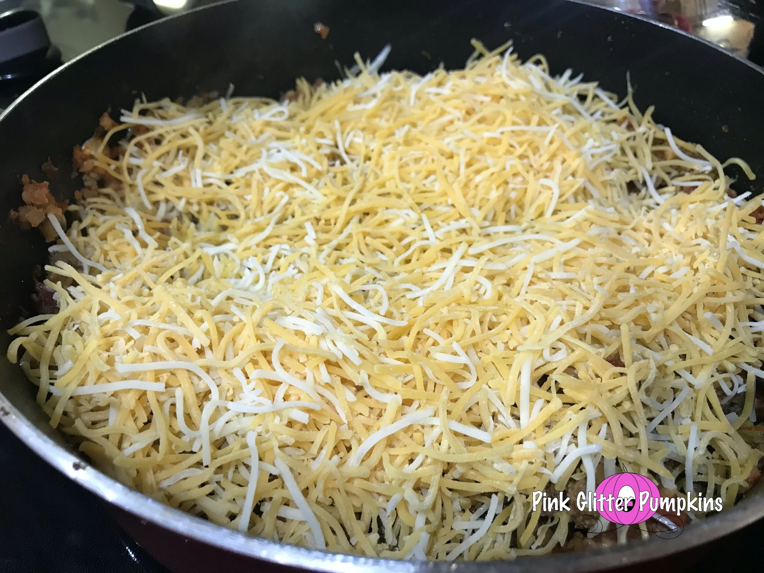 4. Once all of the juices have cooked out, add the beef back to the skillet with the rice mixture. Mix together well. Top with cheese and place a lid on top of the pan. Cook until the cheese is melted.