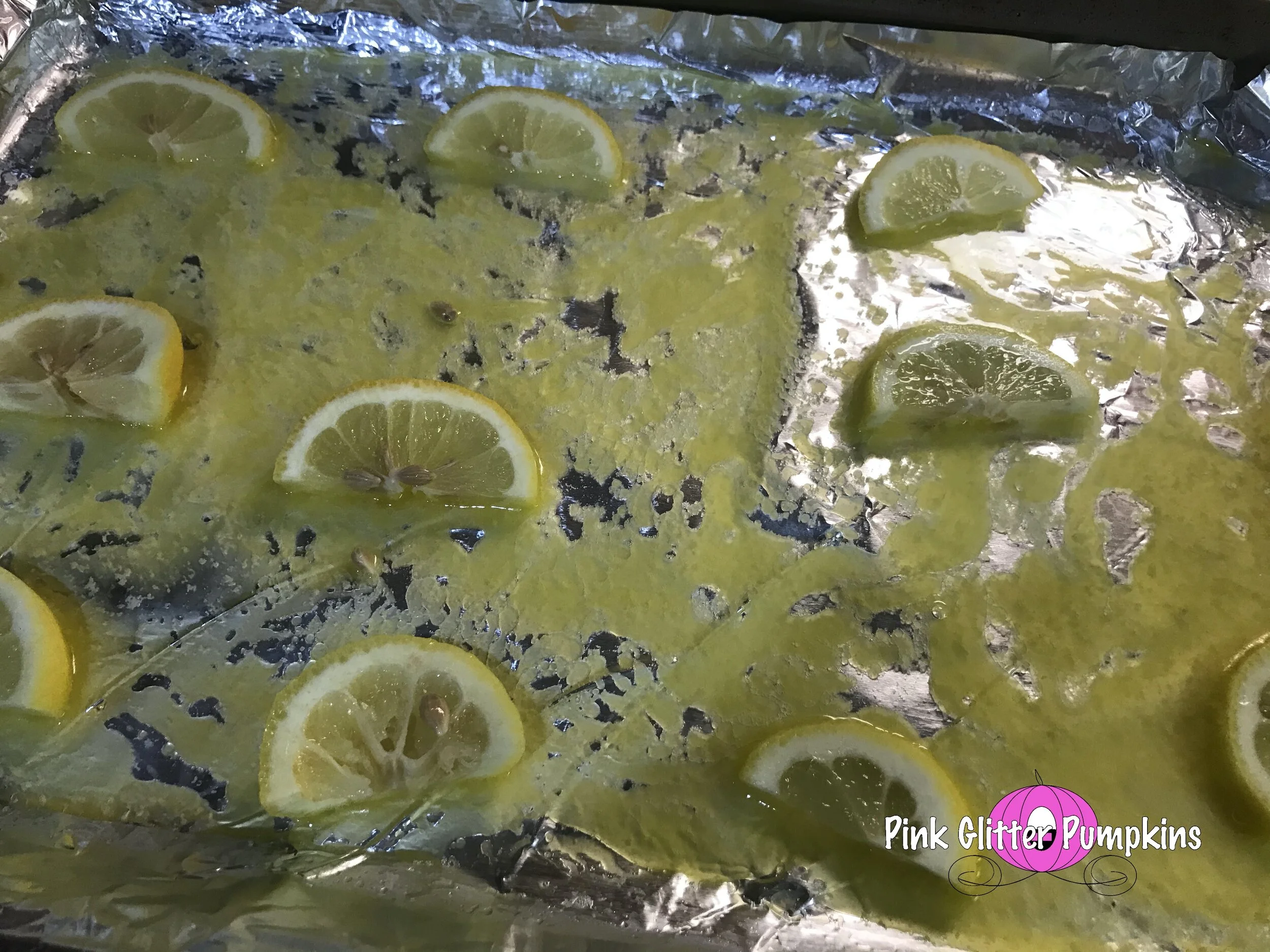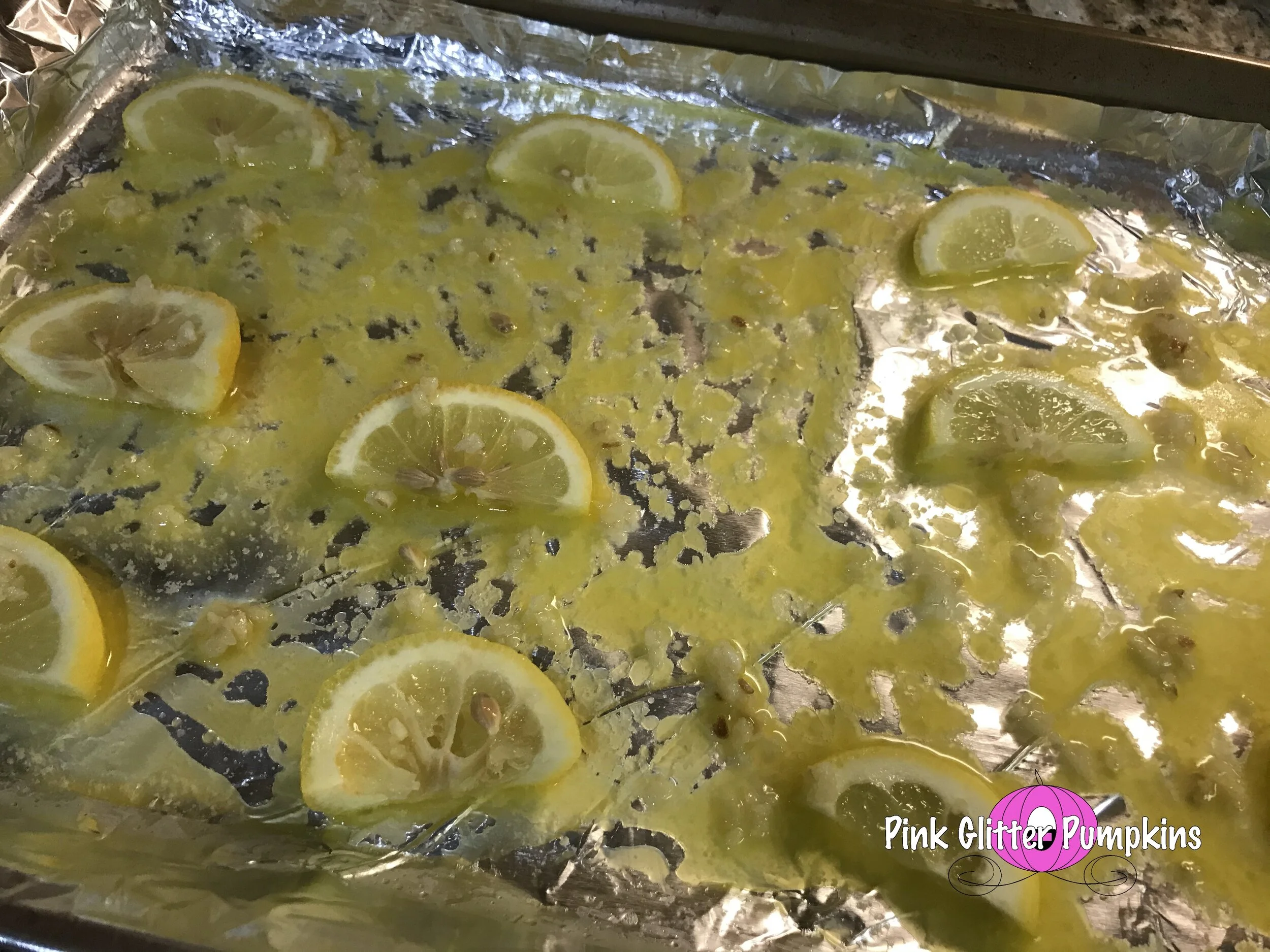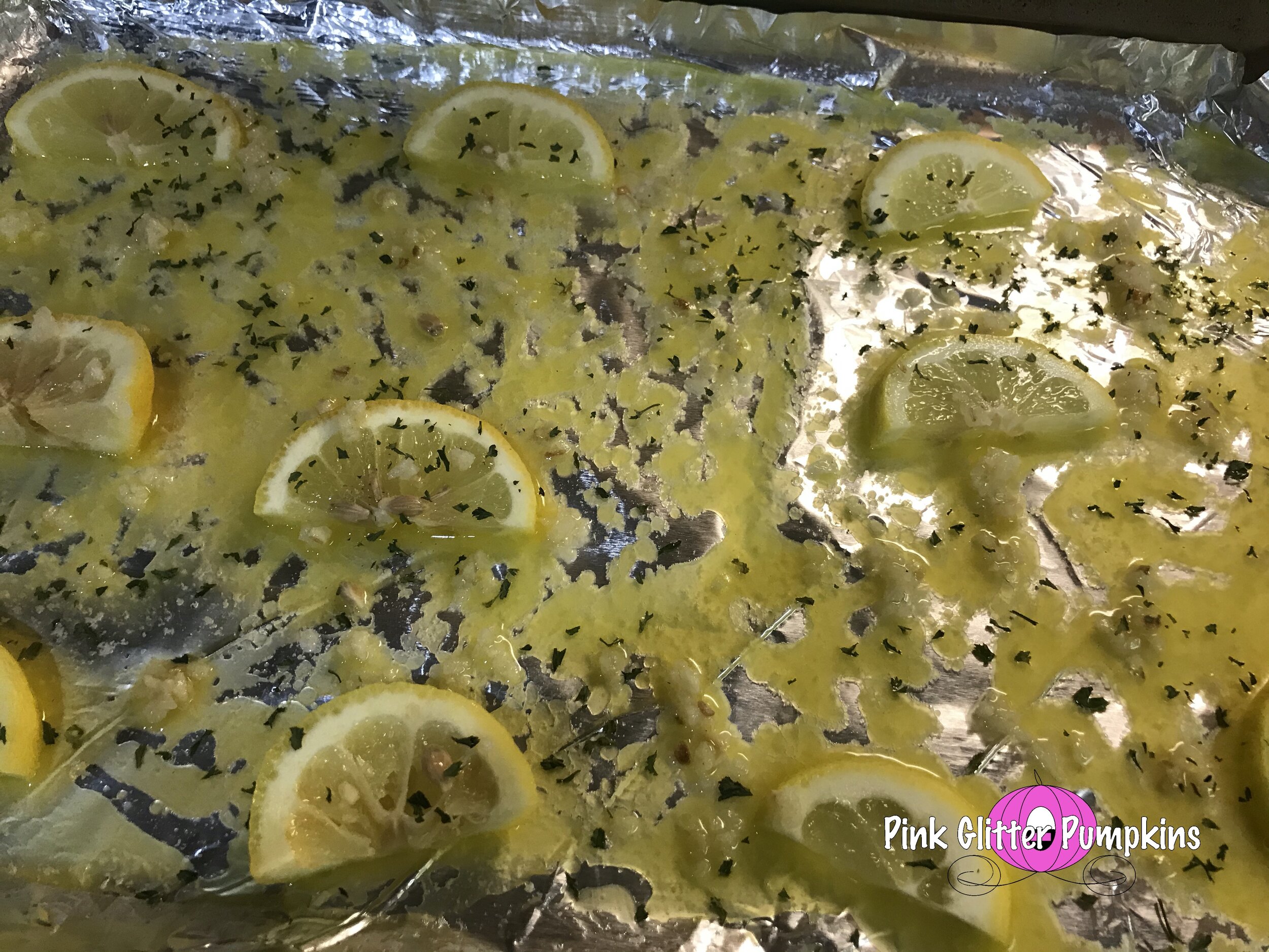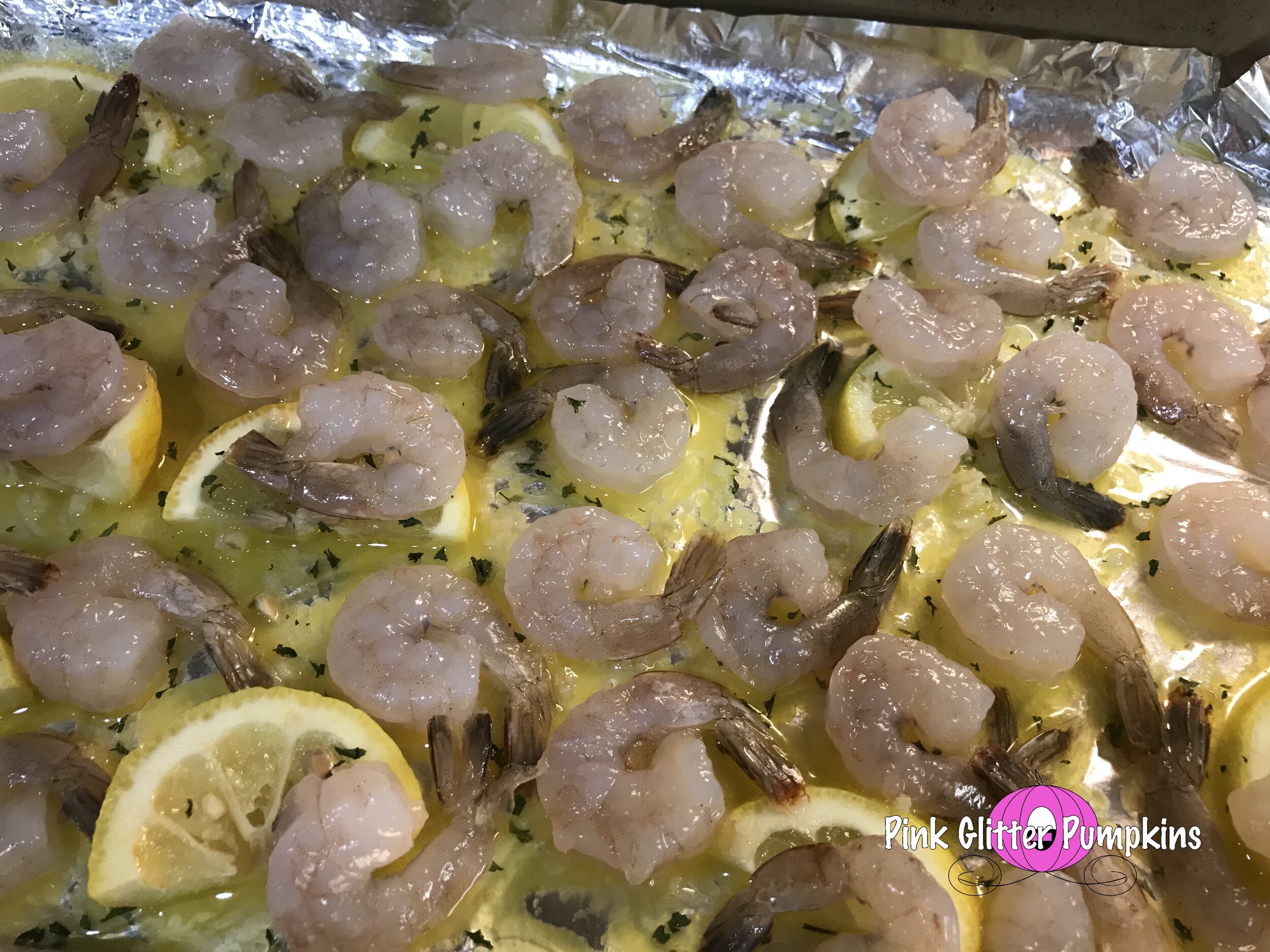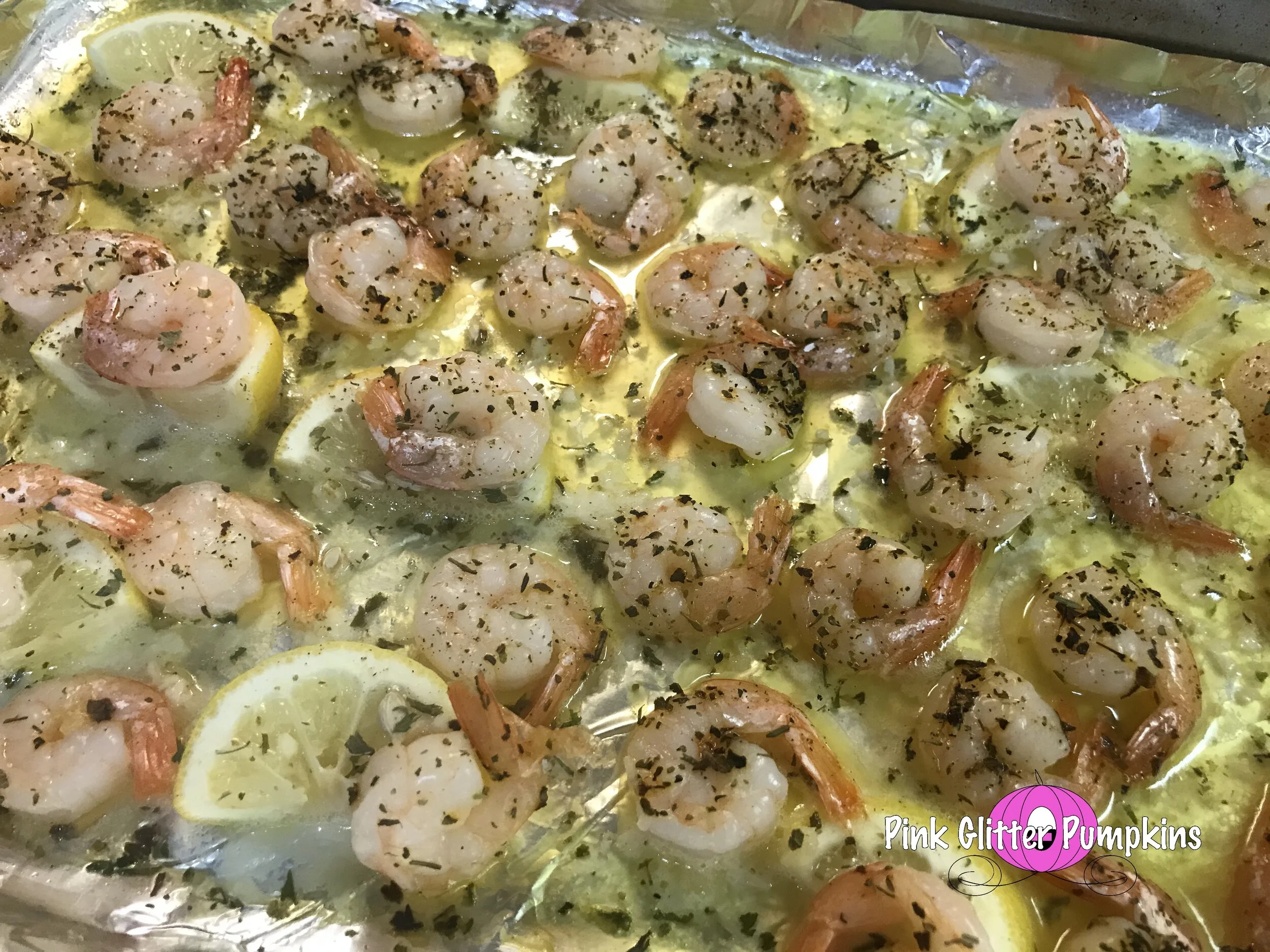 1. Place the stick of butter on a sheet pan (it needs to have a rim!). Place in oven at 350 until butter melts. Add the sliced lemon, sprinkle with garlic and parsley. Add the wine. Place the shrimp atop the mixture. Sprinkle the shrimp with salt pepper and Italian seasoning.