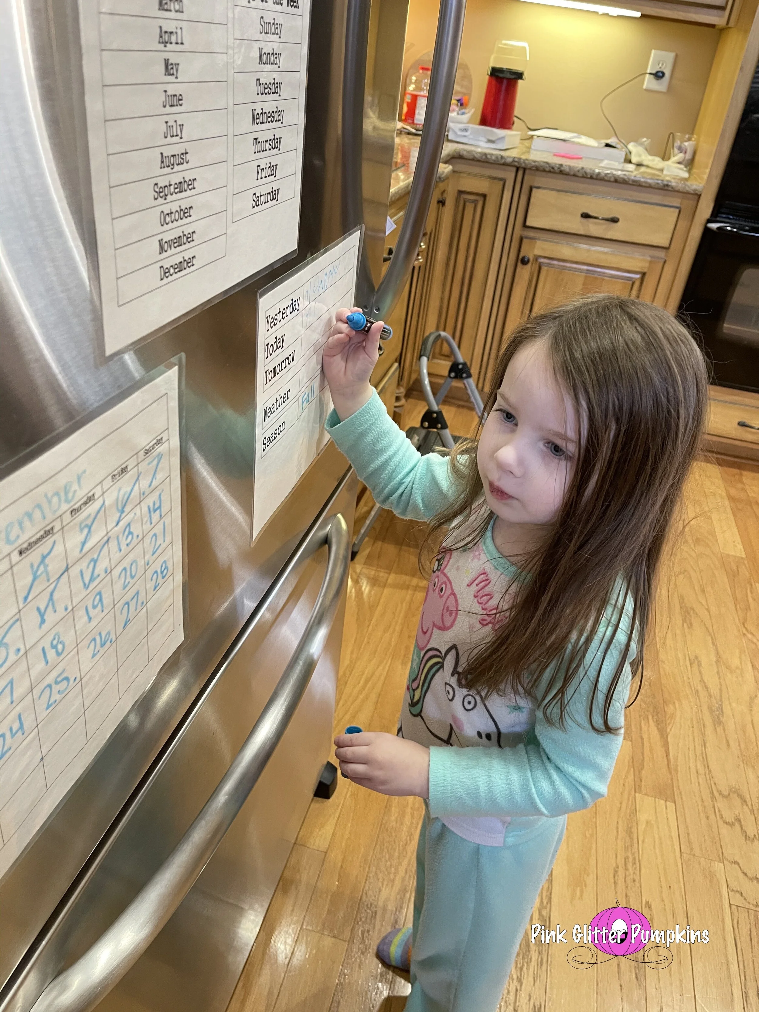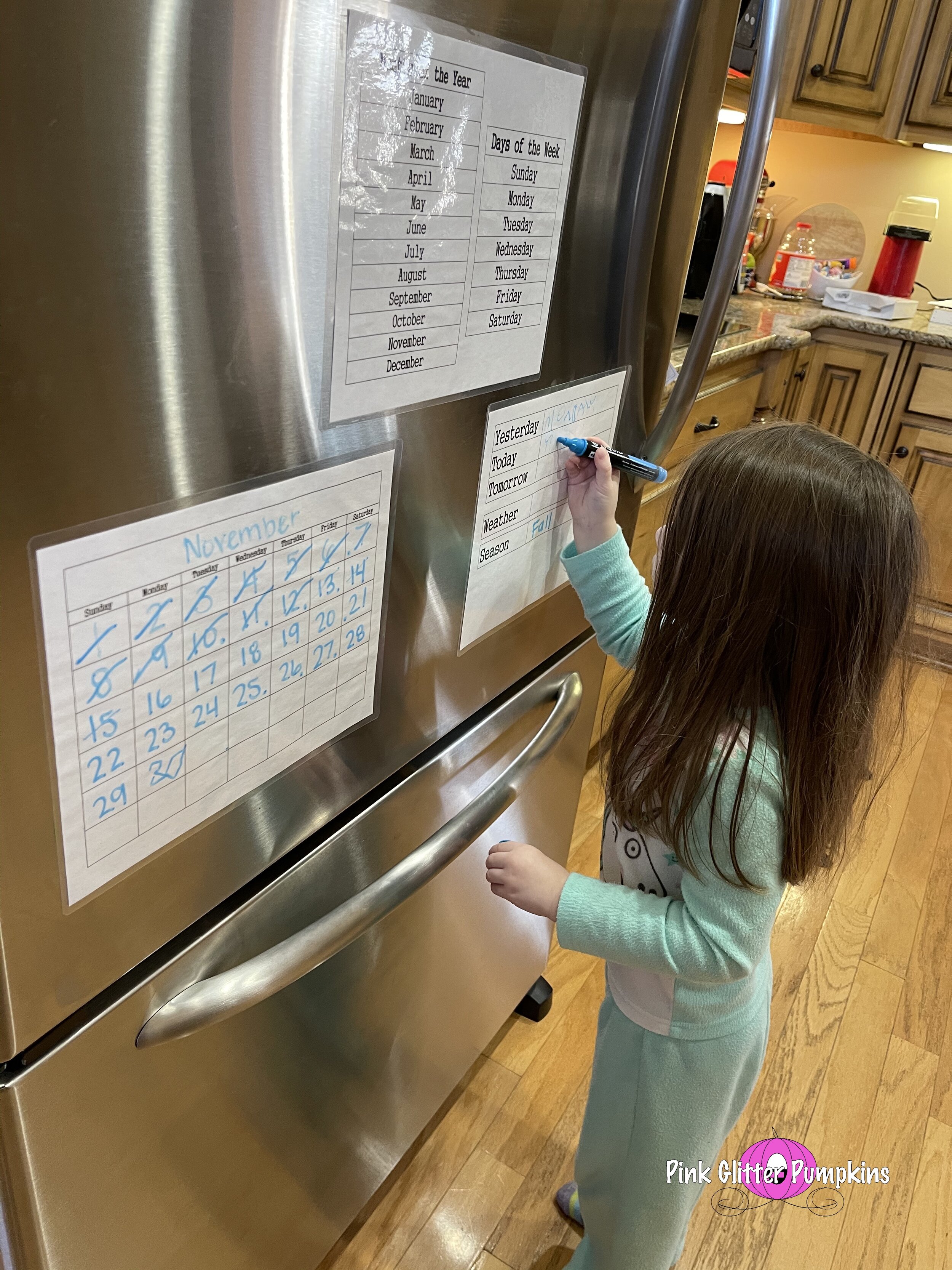Melody started doing calendar time more on her own. I still have to tell her how to spell some things, but she is doing the work.