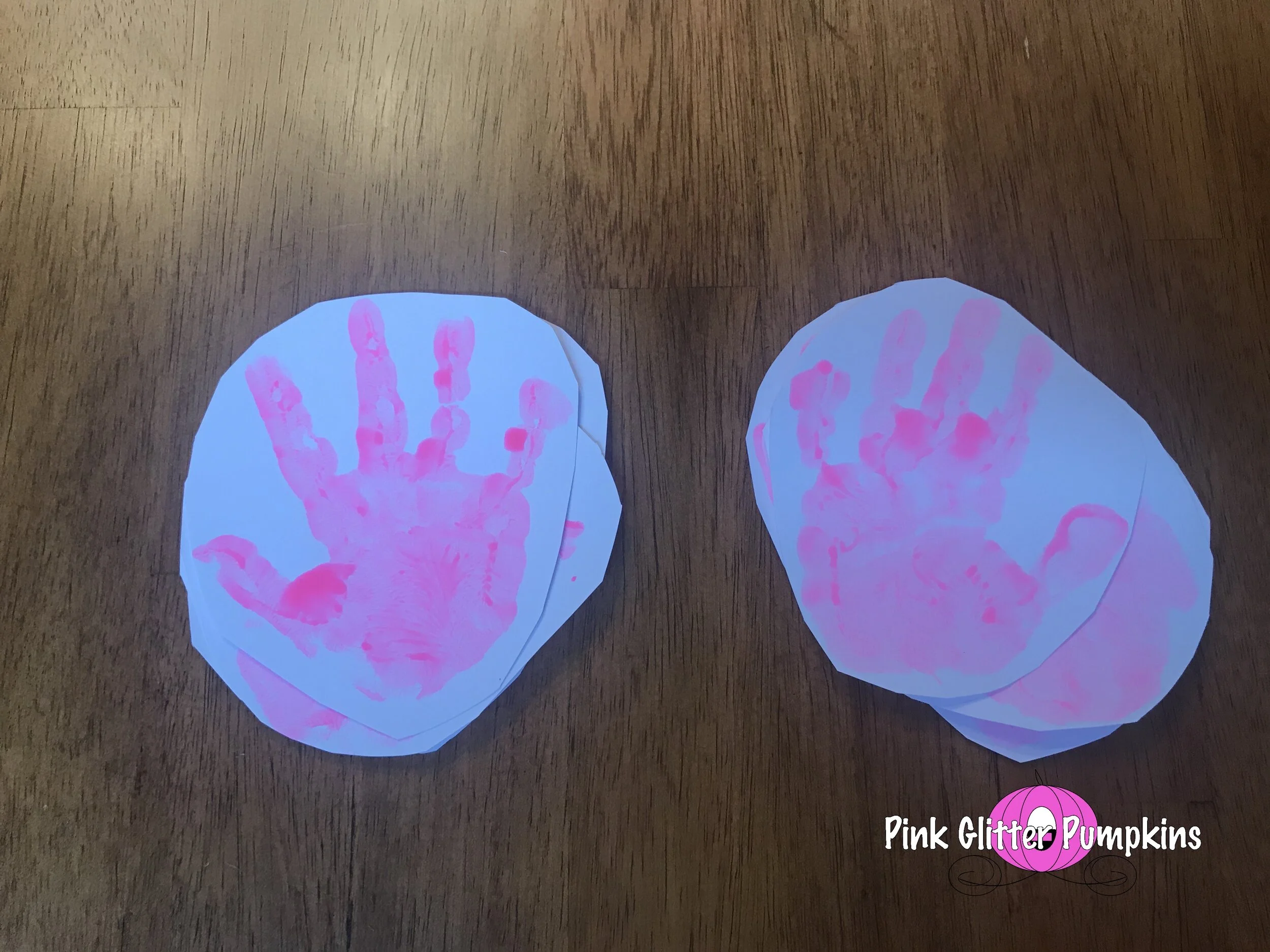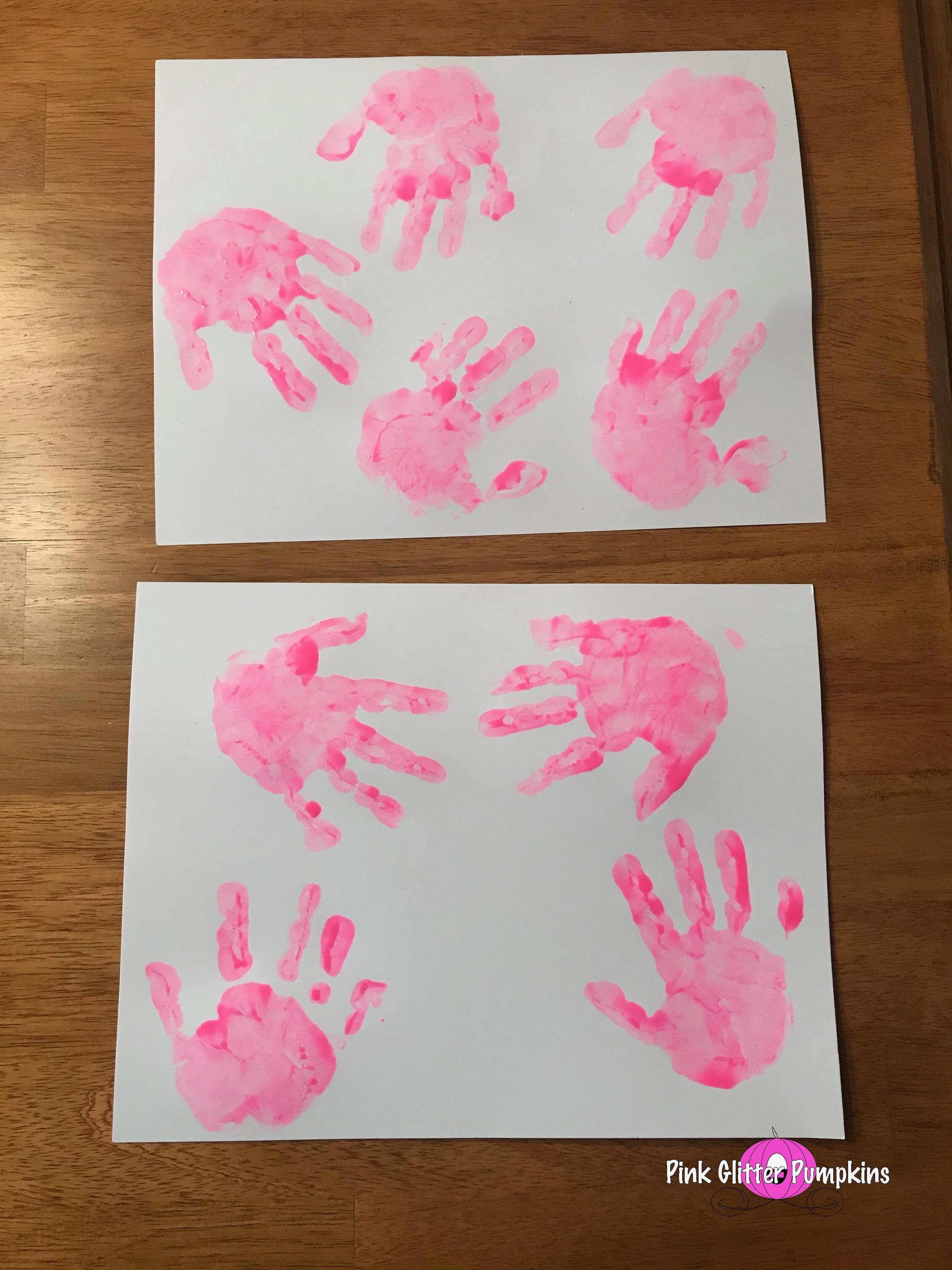 So to start, I made Melody make hand prints the night before really diving into this craft. I let her pink a color from my paint collection (she picked pink), and I did both right and left hand prints on white cardstock. I filled the pages up because I planned to use this for multiple crafts.