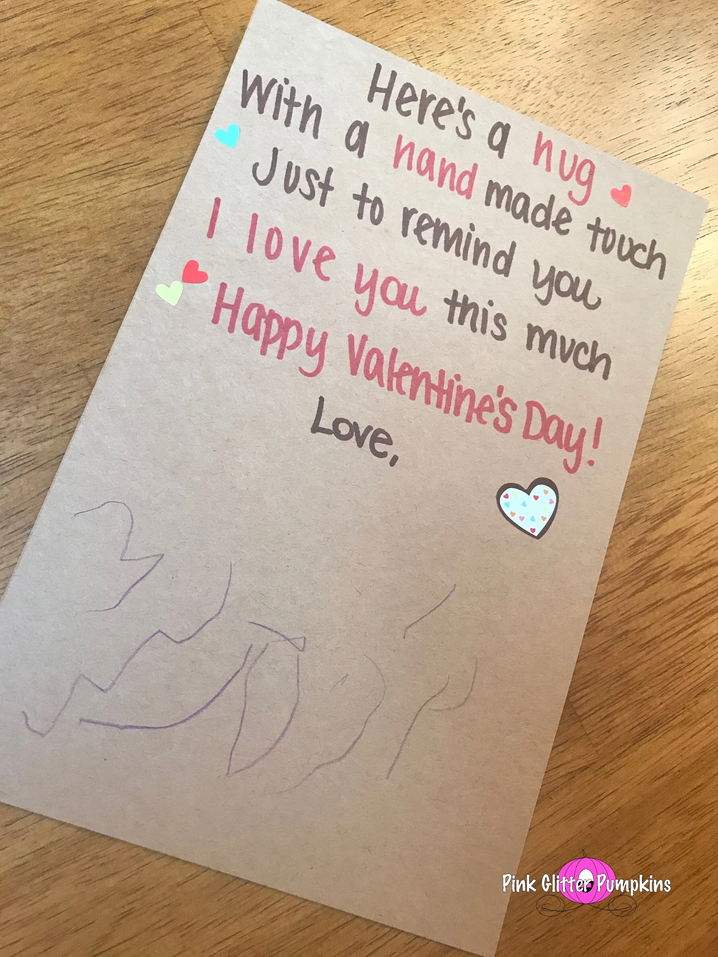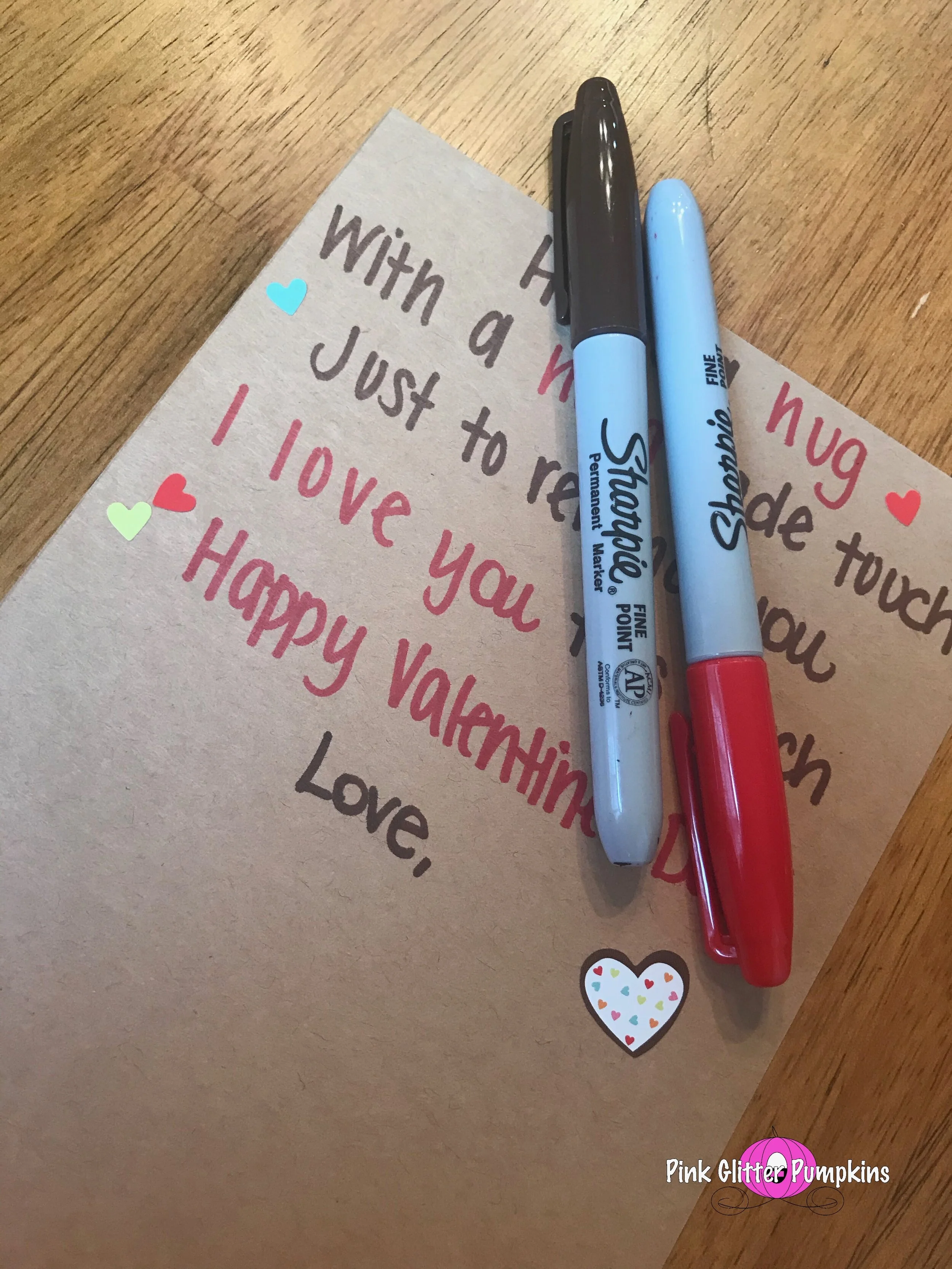 Next I used Kraft paper to make the card itself. I used sharpies to write out the phrase I found on Pinterest. Melody had some heart stickers I added from some extra decor. Then Melody signed it.
