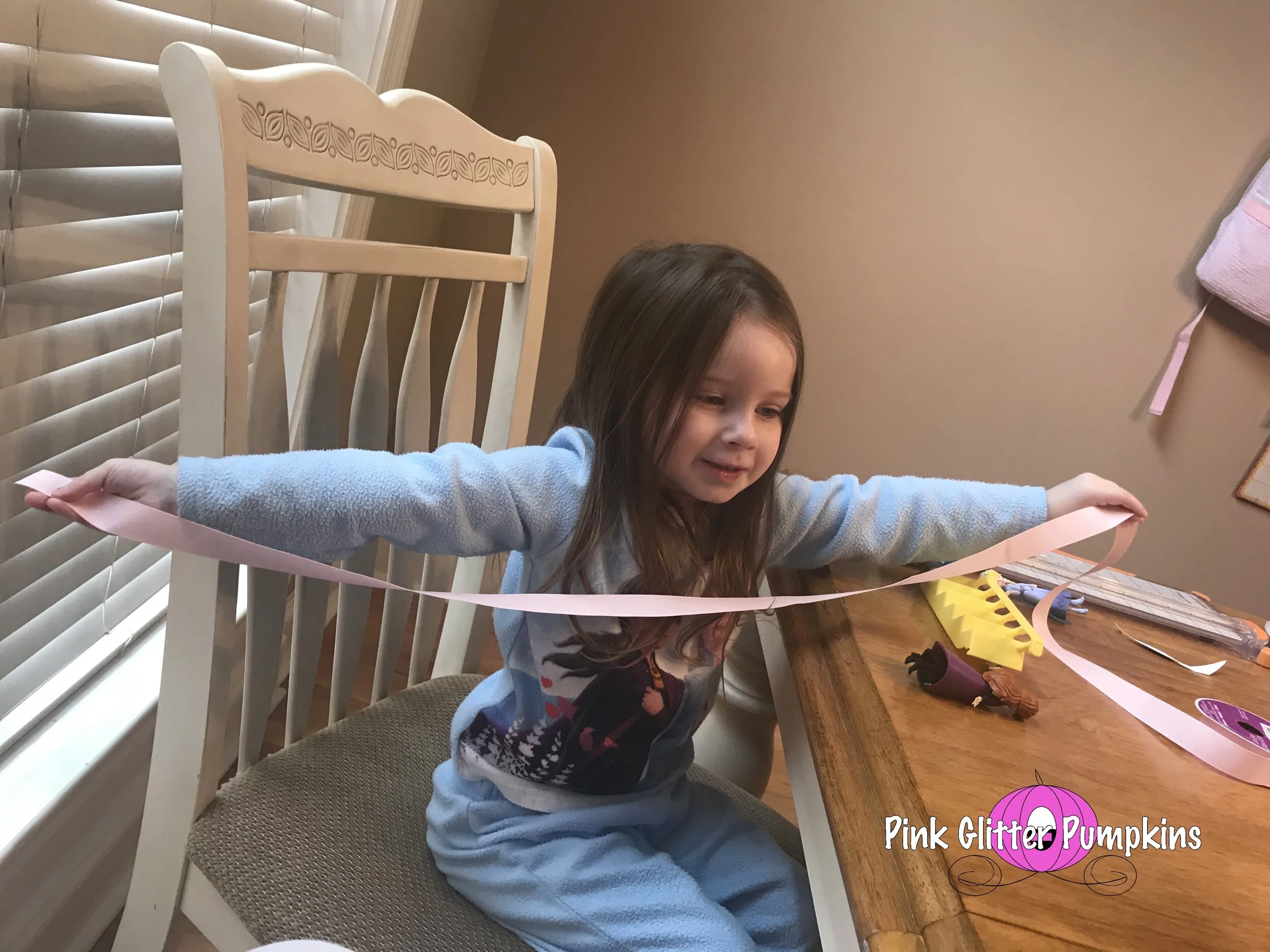 Now to make the actual hug. I let Melody pick out ribbon to use. Of course, pink it was again. I had her measure out the width of her arms to get the width of her hug.