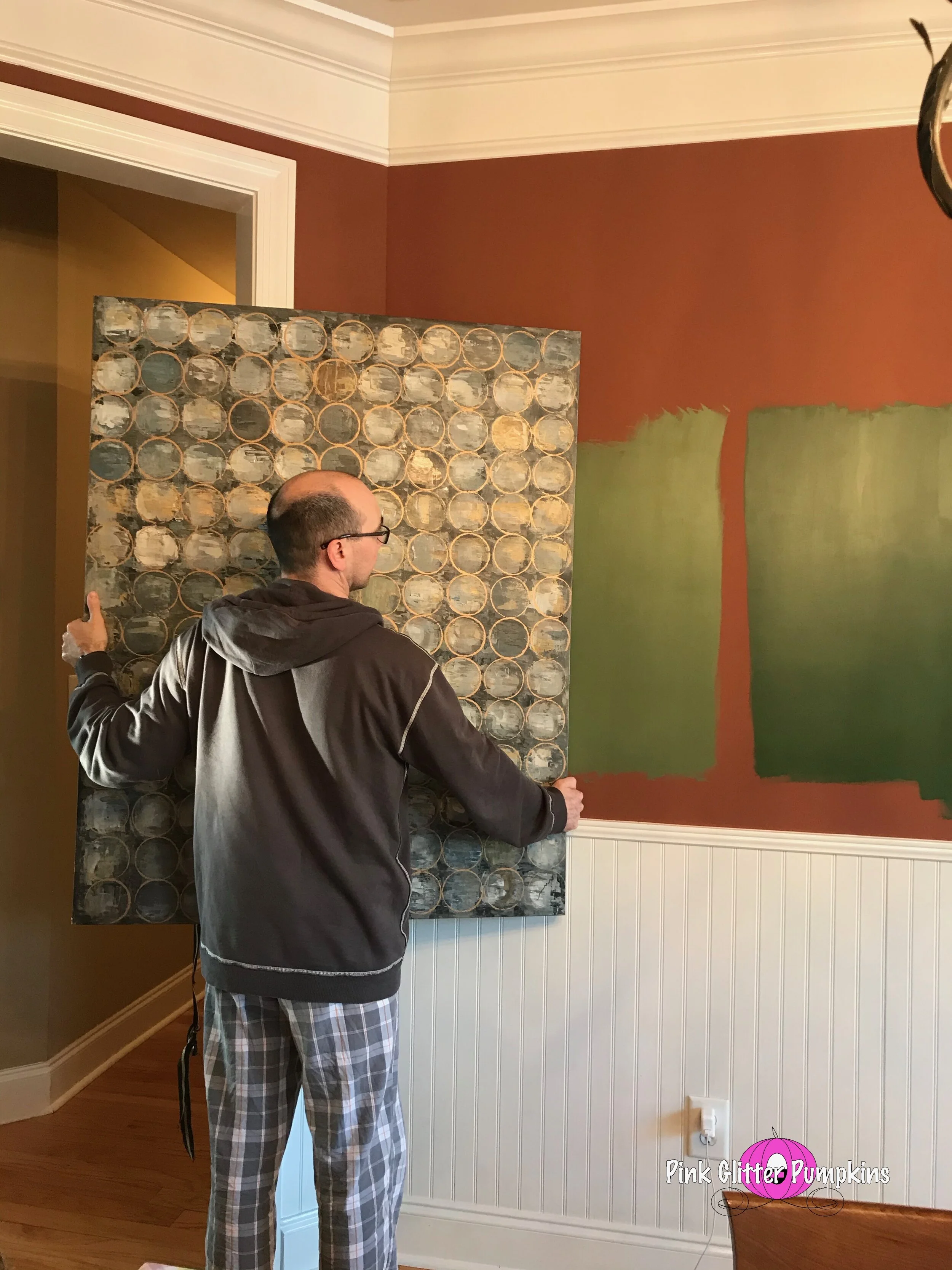 So below is the best “before” I really have without using our previous owner’s images which I don’t feel comfortable doing. Overall, the orange/burgundy just isn’t us. I mean if this is your ideal color, that’s great. We just tend to go for a more earth tone color as well as more neutral color that a lot of things can really match. This was really the only “bold” room in our new house. All the other walls are either green or beige. This room is in the very front of our house, and it is really huge. So it made sense to do it first. Plus we received a piece of art and some sconces for Christmas for this room, but it did not match this orange. So we knew painting was coming and needed to happen. The goal was to complete it in March, so it made sense with us home to go ahead and do it.