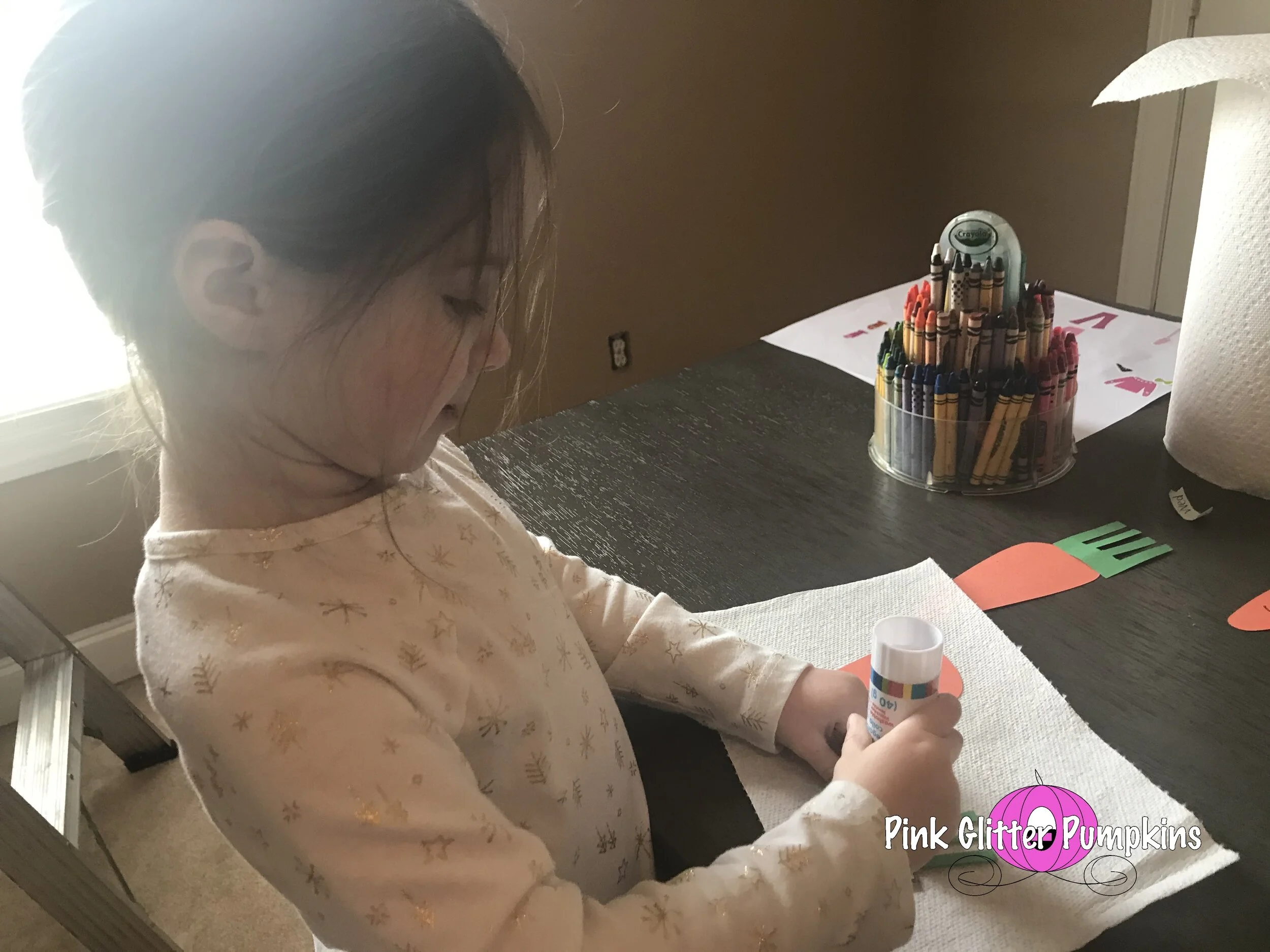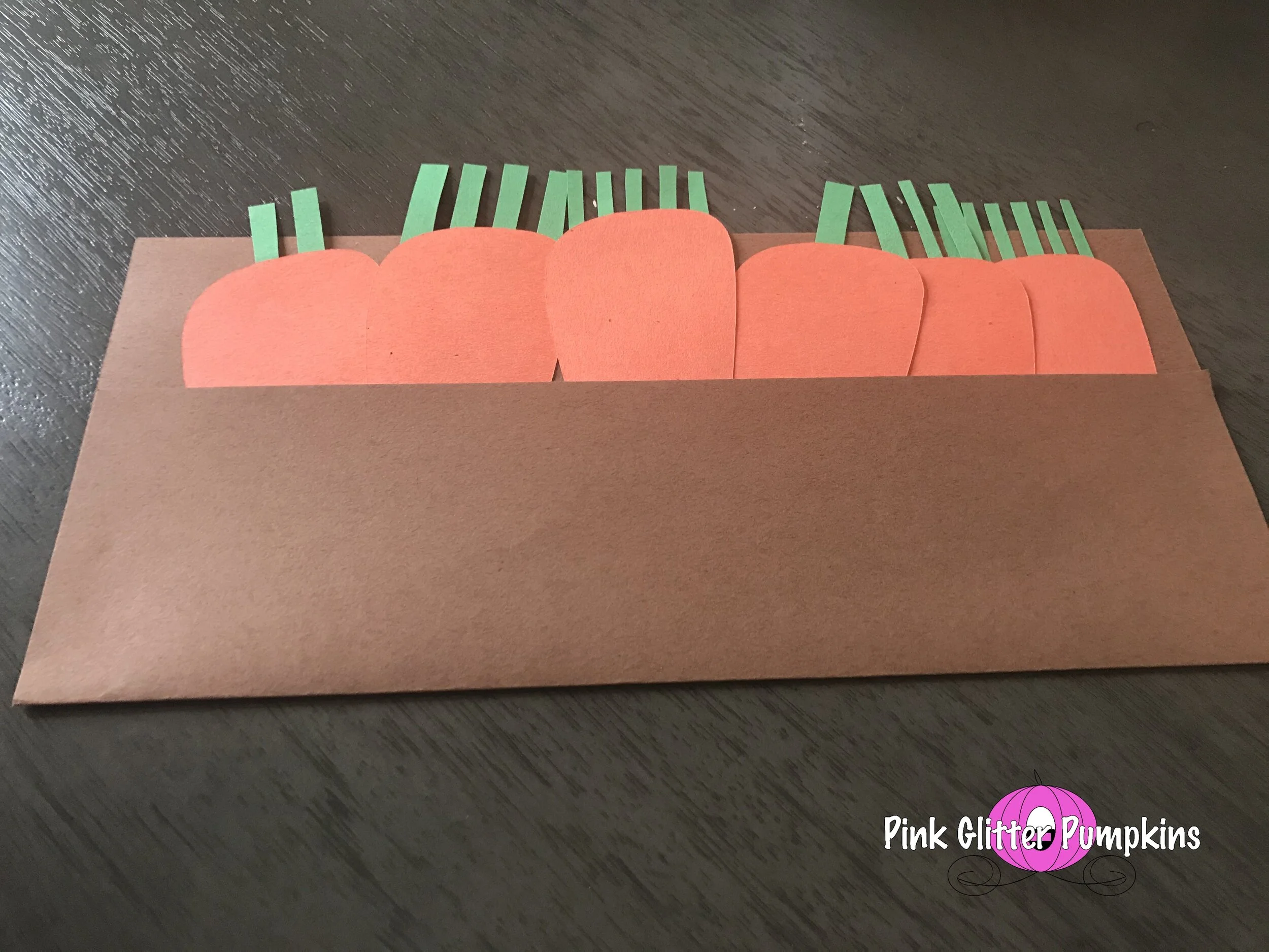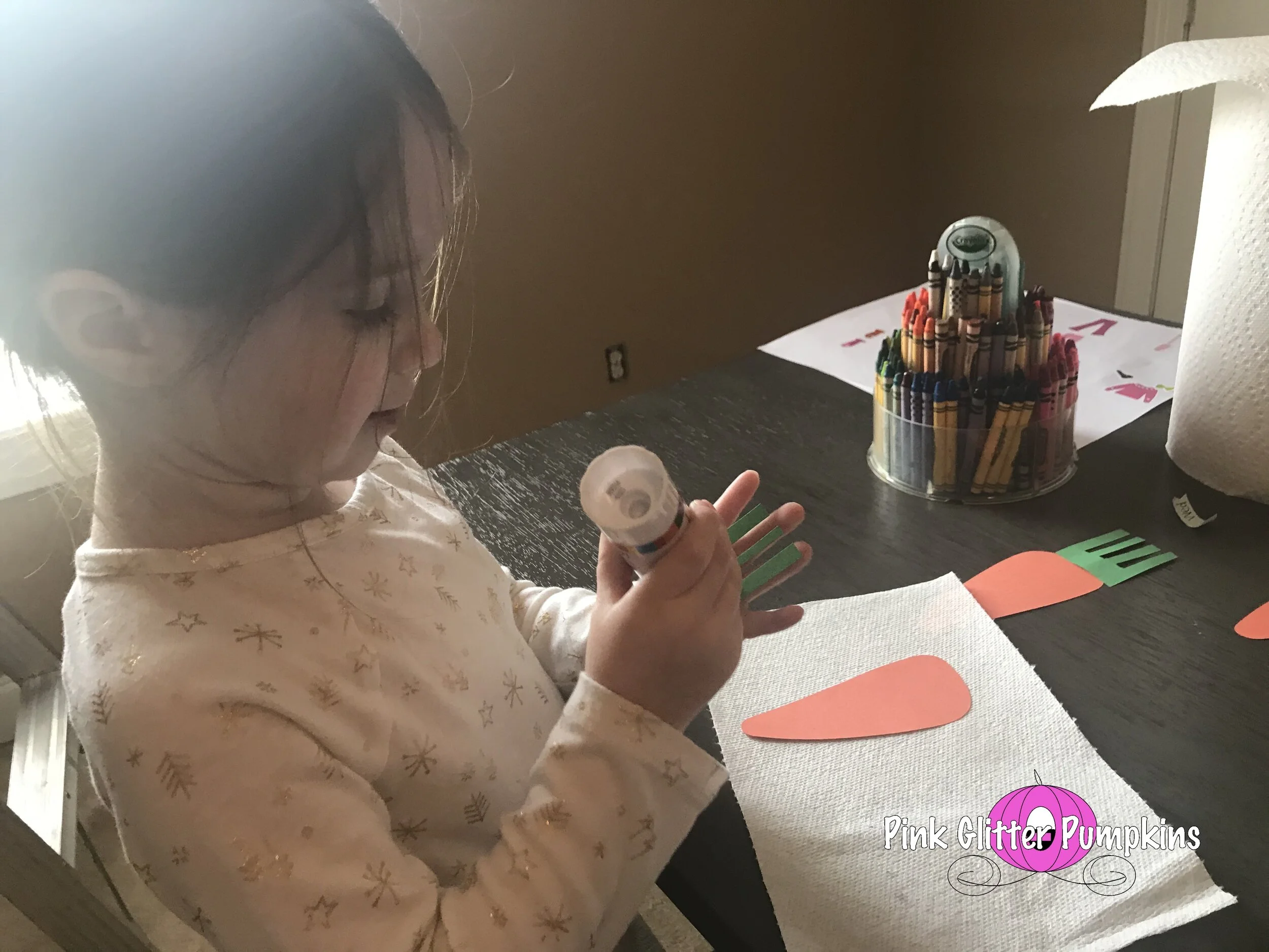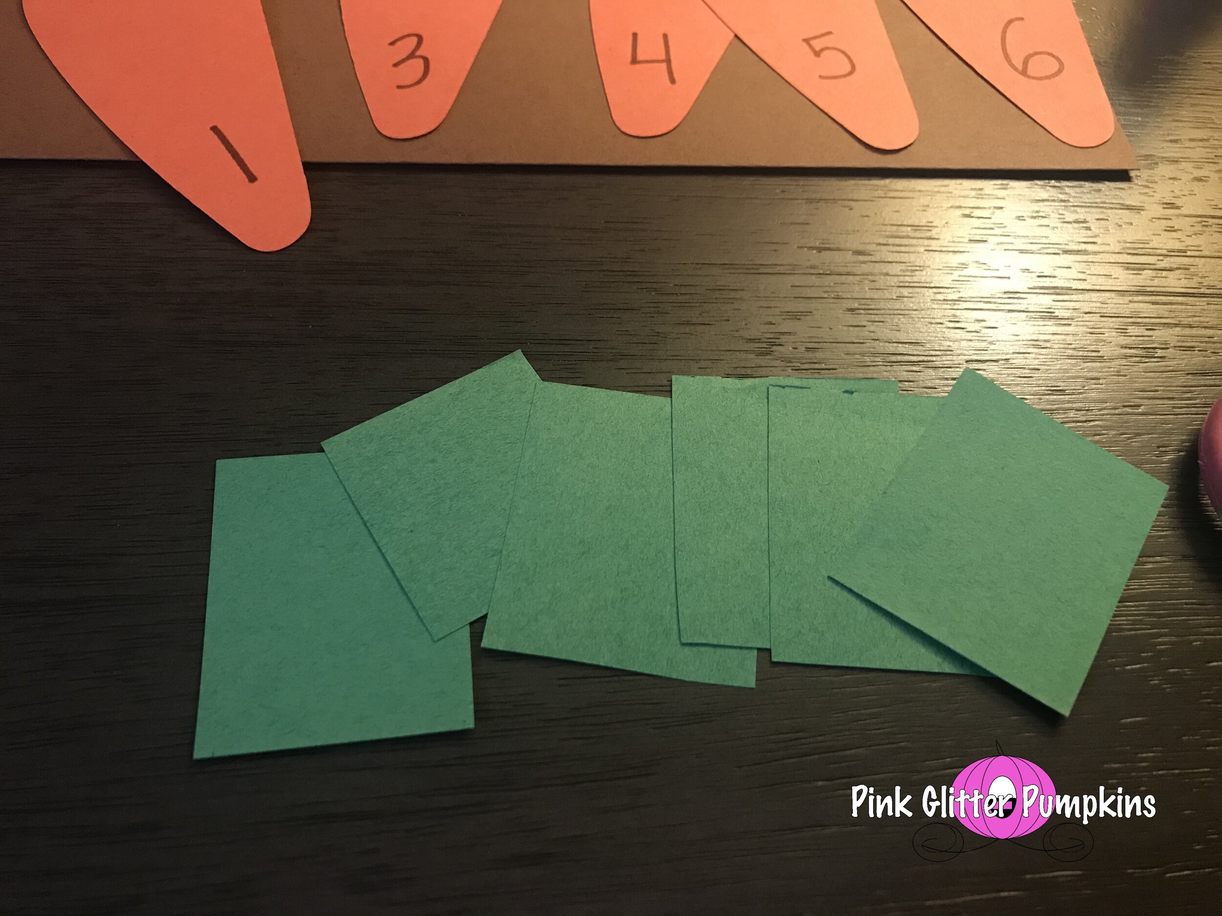 With orange construction paper, cut out 6 (to however many you want) carrots. To make the craft more educational, I added numbers on the bottom. I did 1-6, but you can use any numbers that work for the next step.