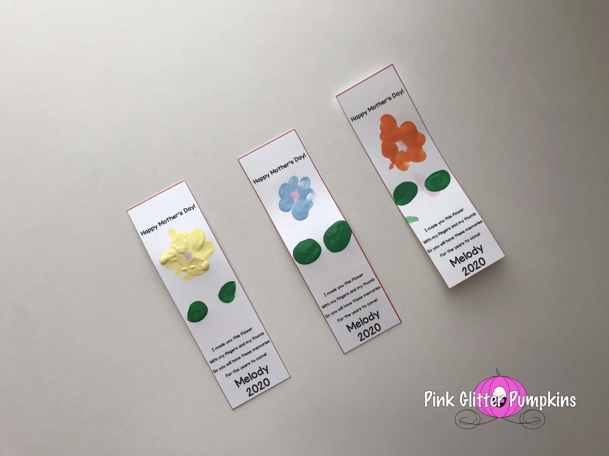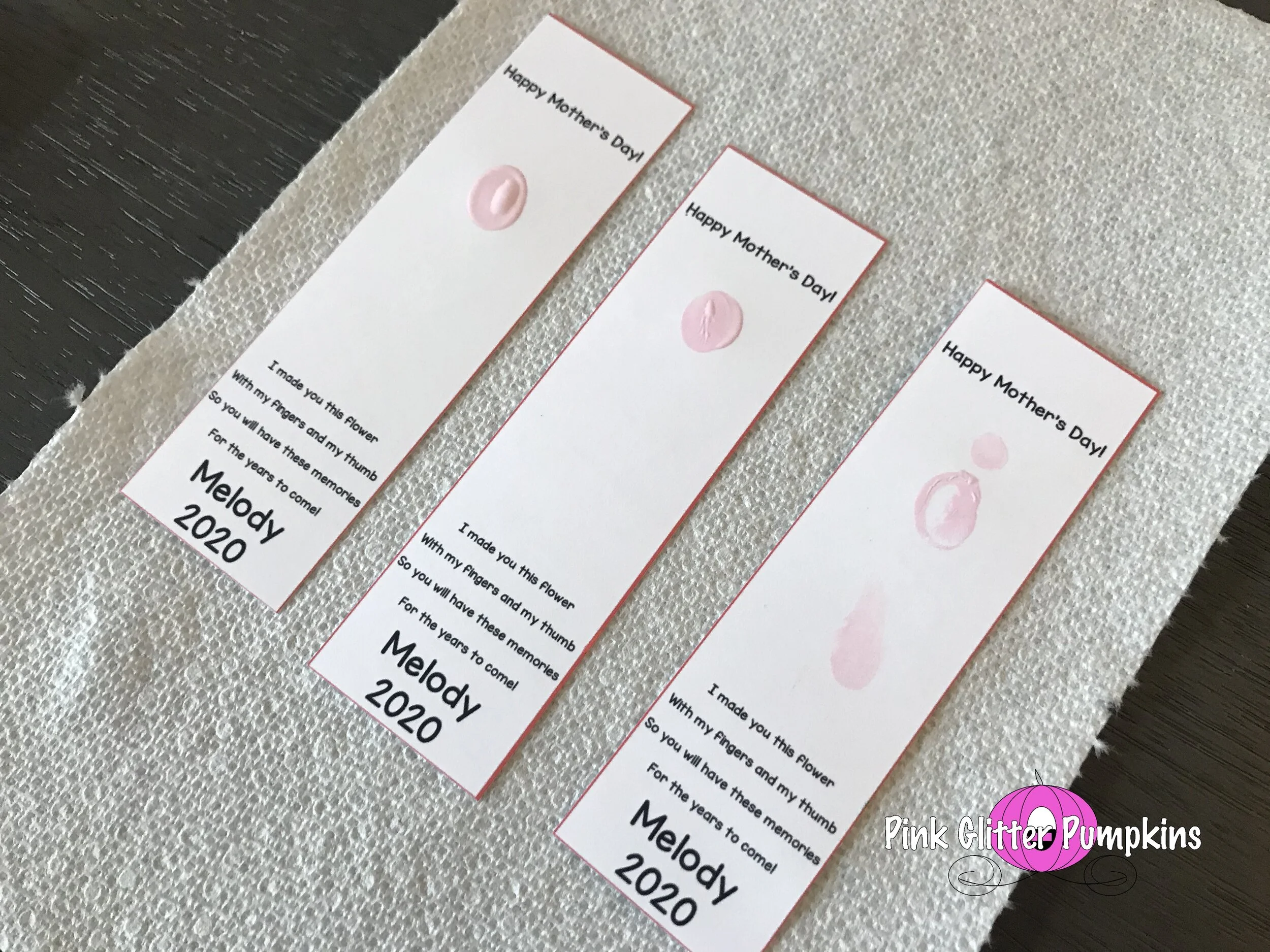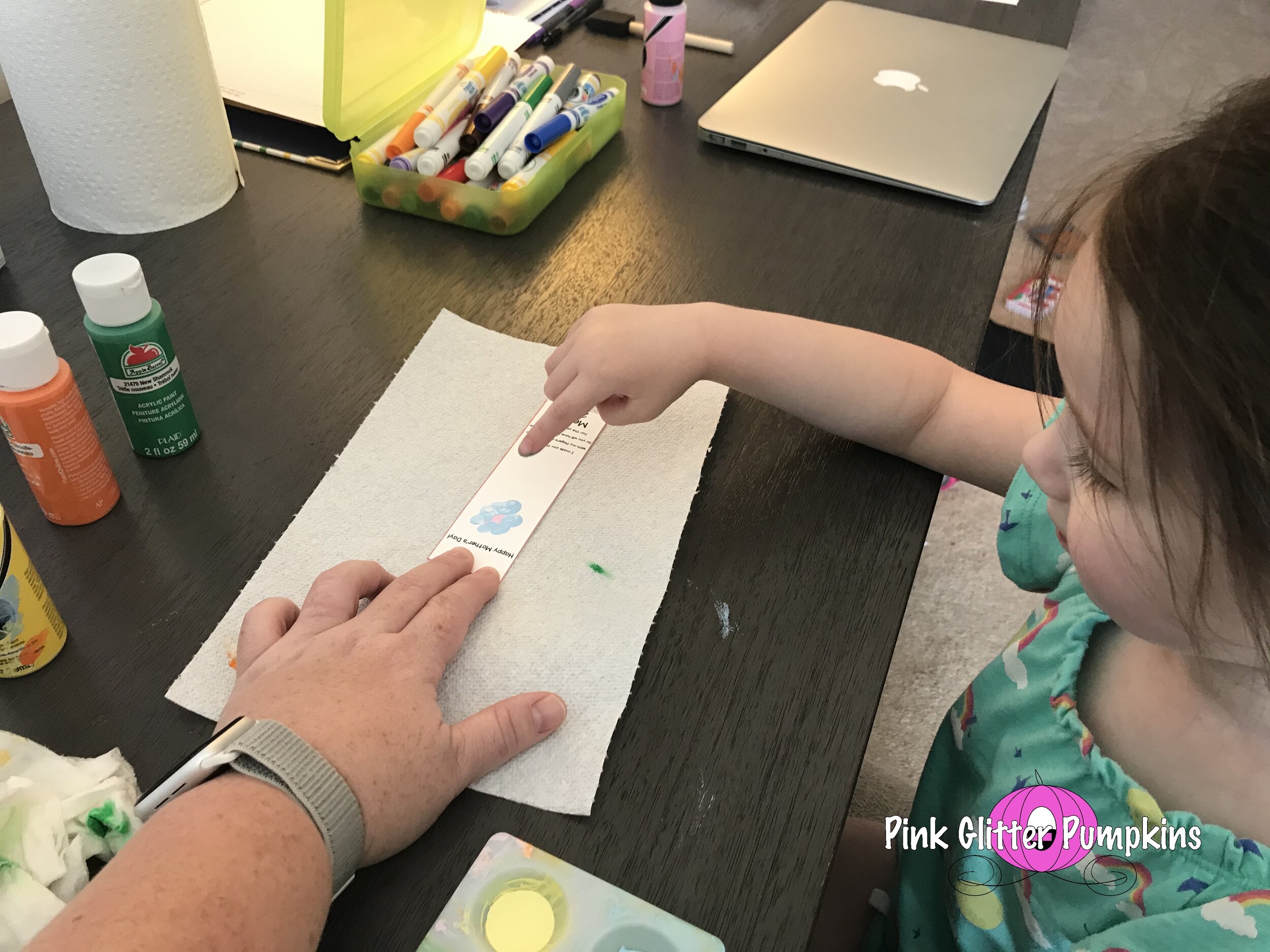 To start, I printed out a bookmark I made using Pixelmator (you will find a blank template you can print out for yourself at the bottom). I cut it out, then I had Melody write her name on the back with a yellow marker so it wouldn’t bleed through the cardstock. This isn’t required, but I don’t want to forget the way she writes her name at 3! I let her pick 3 colors of paint. All of the painting (except for the “stem/stick”) is done with Melody’s finger print, FYI. So first she made a dot to be the center of the flower using pink. Then she went around the flower using a specific color for me, my mom, and my mother-in-law. Then I had her make the leaves near the bottom. I drew the stick using a q-tip and the green paint.