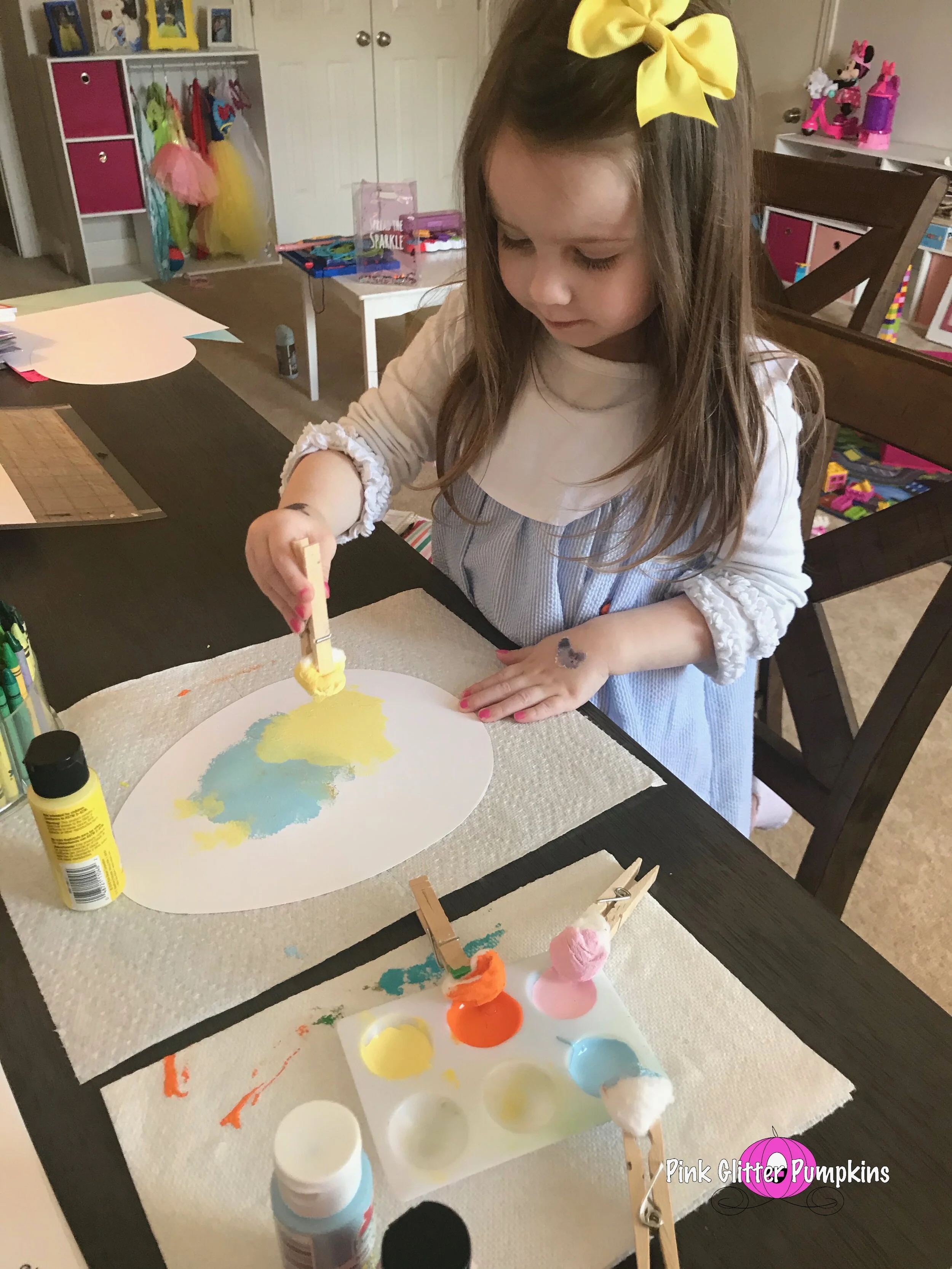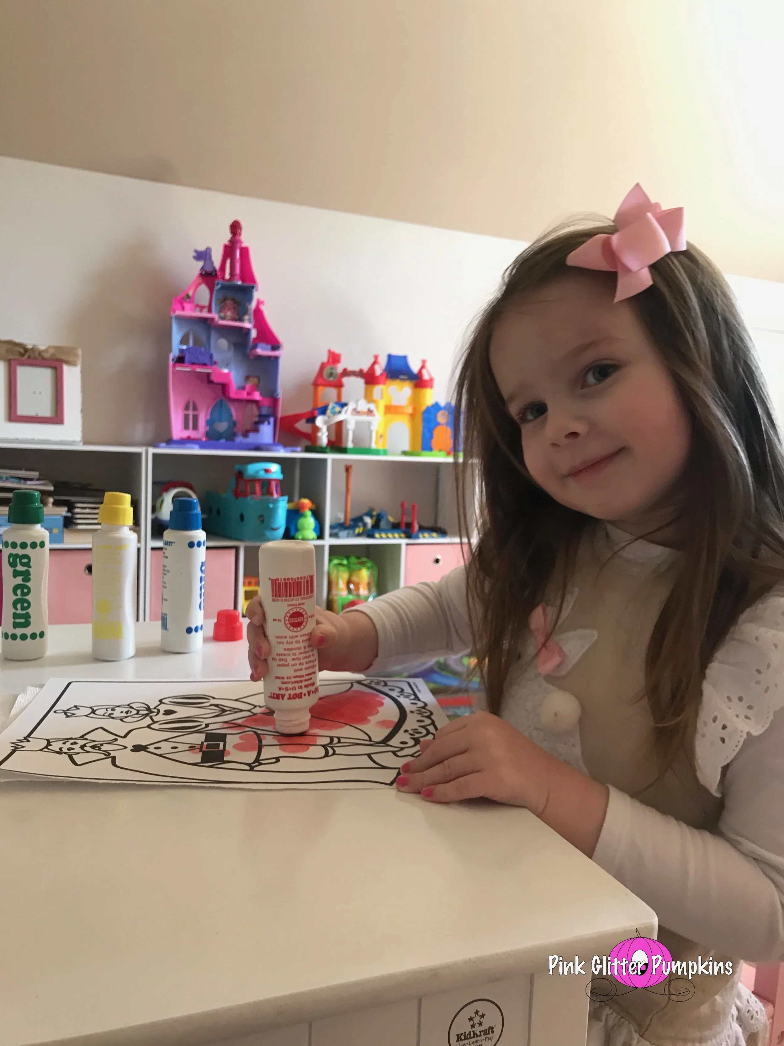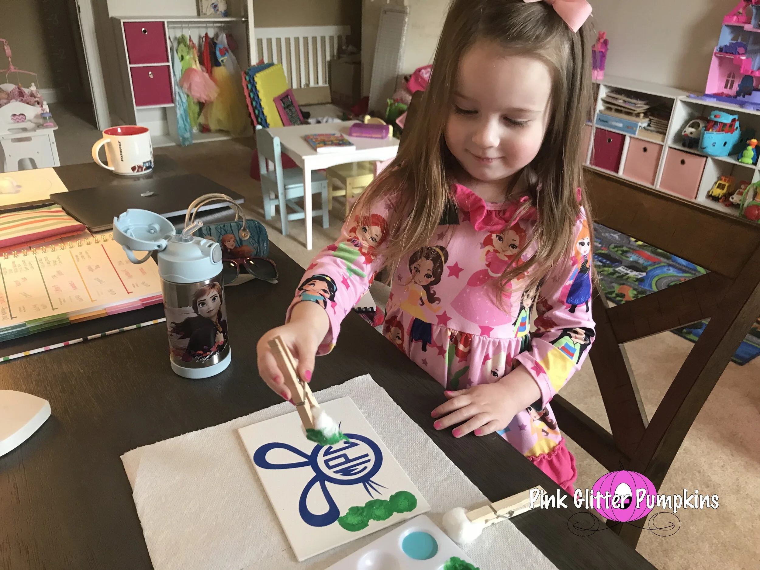 On Friday, we reviewed all of her letters A-E, and we learned about the Number 1. She practiced writing her name more, then we worked on a new craft with were button crosses. She couldn’t just leave the crafting at that, so she did some dot art!