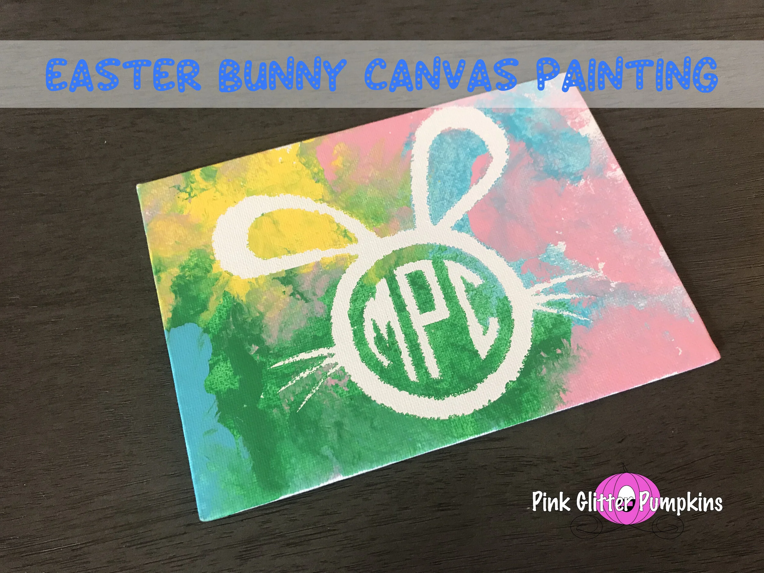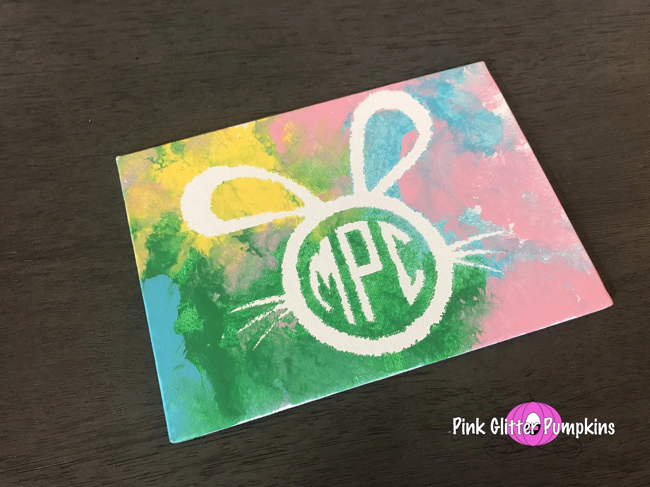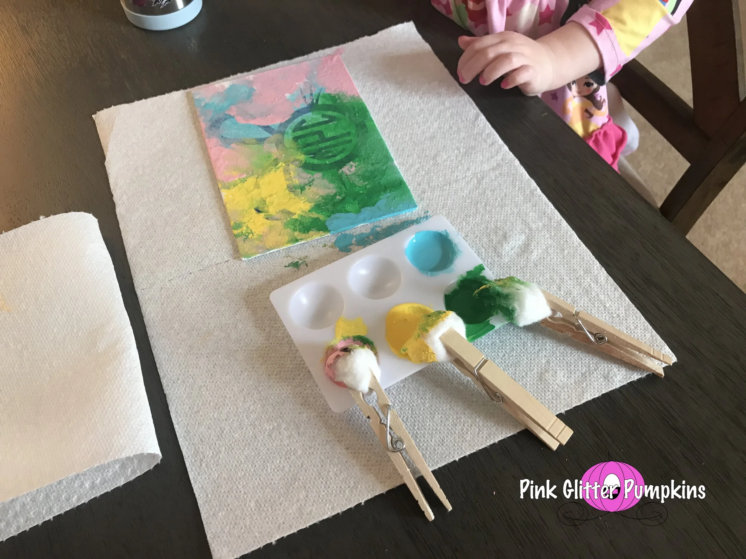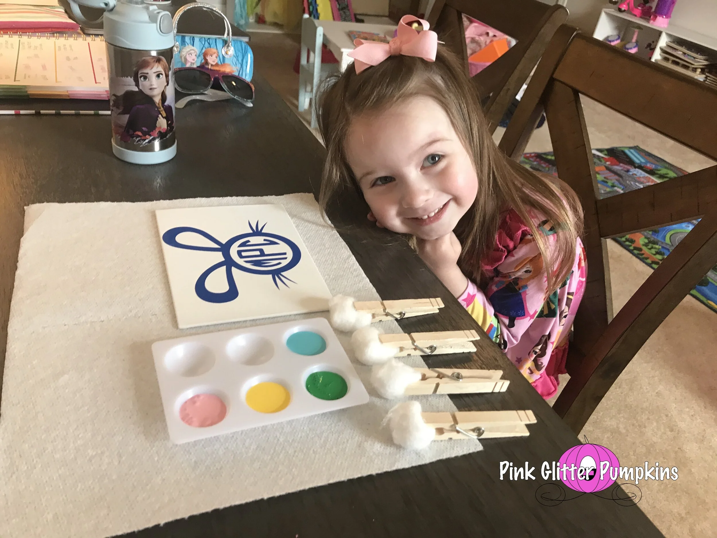To start you need to cut out a bunny using either scissors or a Silhouette Cameo using adhesive vinyl. I did a bunny with Melody’s initials to be different. Then you will want to attach this to a canvas. I have these thin 5x7 canvases I got from Michael’s a while back. I LOVE these. Now to set things up, I let Melody pick 4 paint colors (use however many you want). For each paint color, I had a cotton ball attached to a clothes pin as the brush. The idea is to make “dots” using the cotton ball. Melody “dabbed” some, but she also smeared.