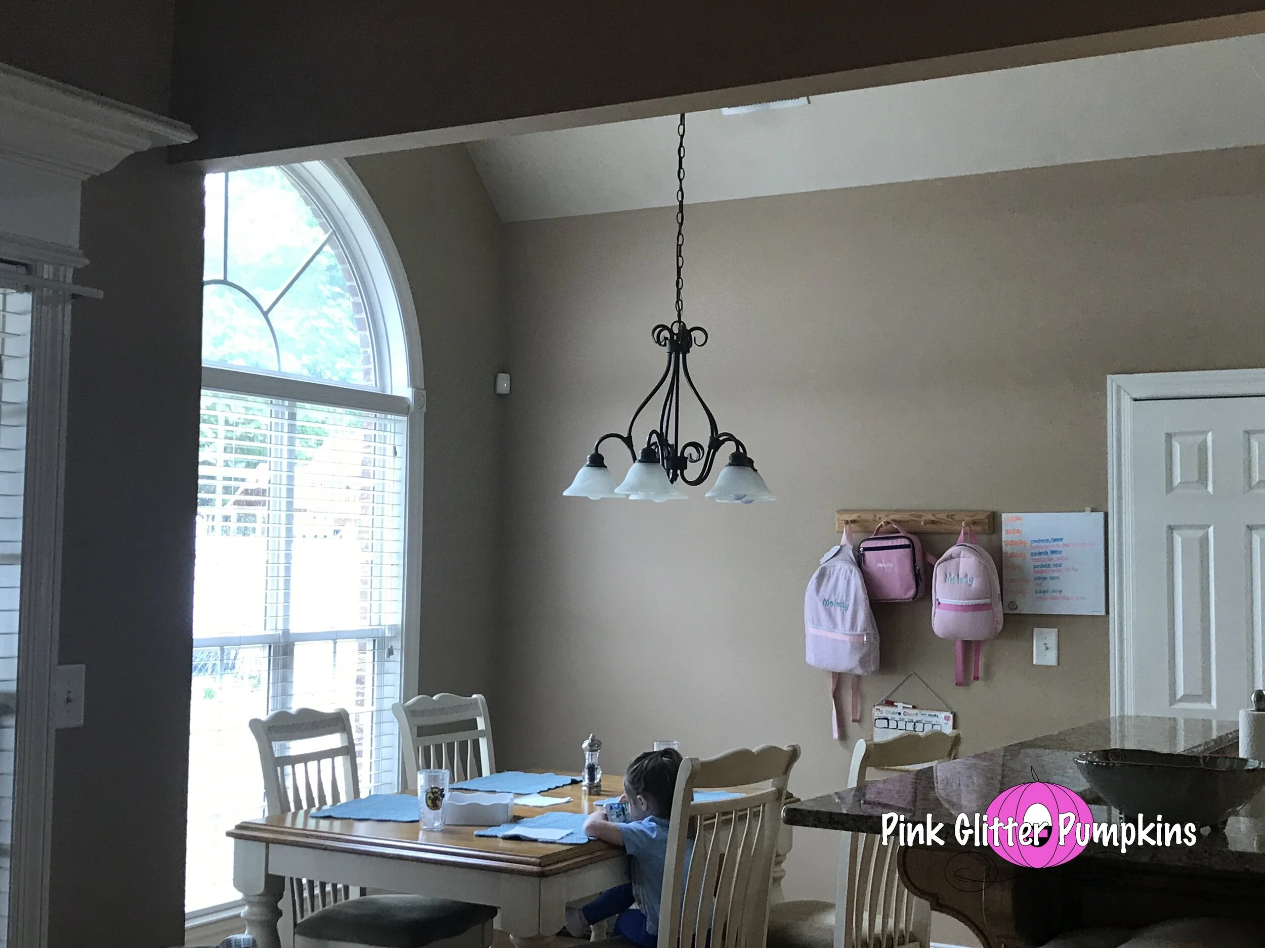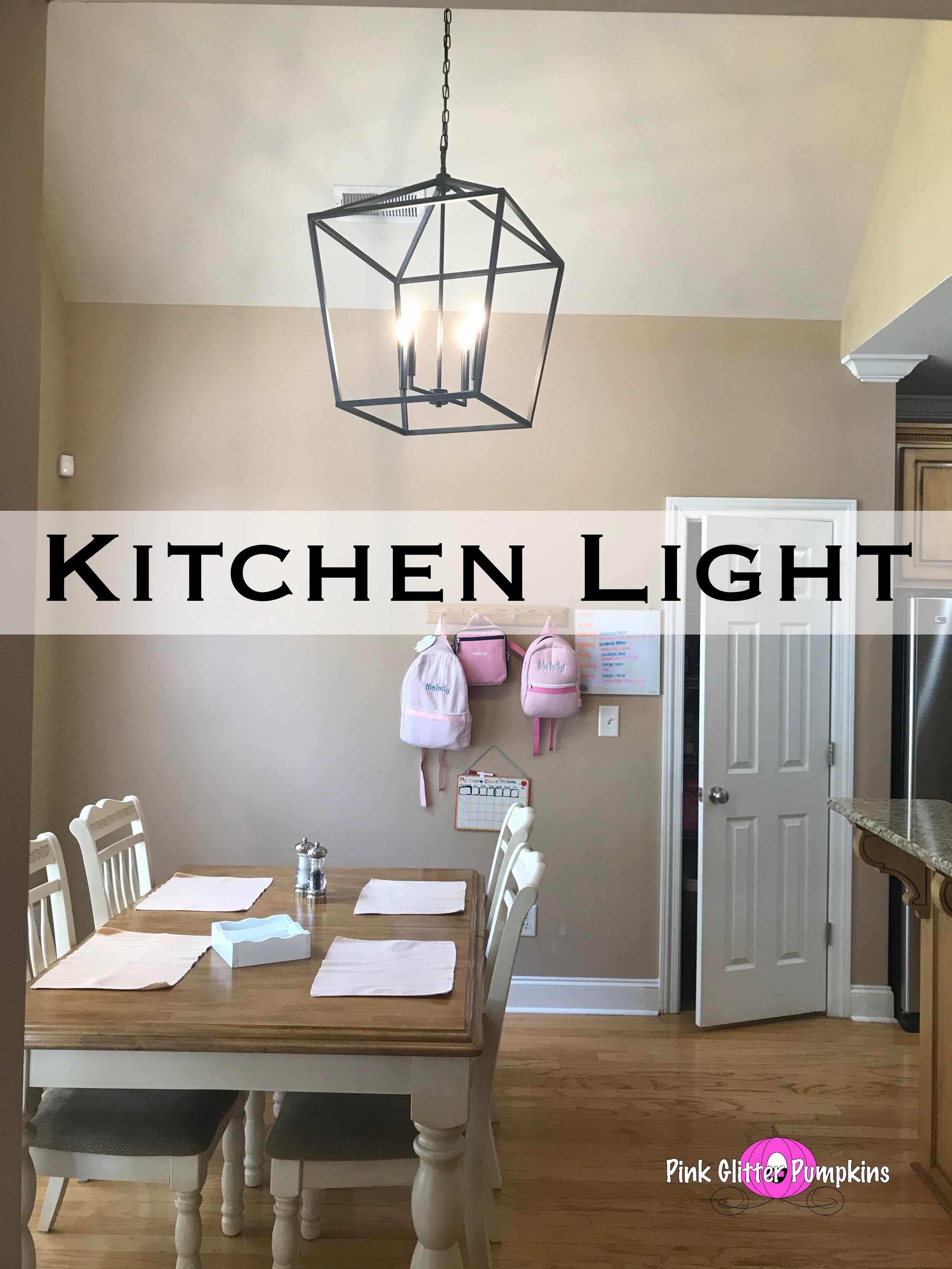 I feel like all we have been doing the last three months has been renovations. Being at home we have constantly seen all the things we want to do, and thankfully we have had the resources to do them since we are home and not spending money as we usually do. One of the small things we wanted to do in our kitchen this year was to change the light fixture. We hope to do a big kitchen project next year, but our original kitchen light fixture was awful for how we used it. It was too low, and people would constantly hit their head on it. And we really loved our kitchen light fixtures in our previous house and wanted one for our new one. So we contacted our local light company and they delivered it to our car. Then we hired an electrician to install it since our ceilings are too tall for us to do it!