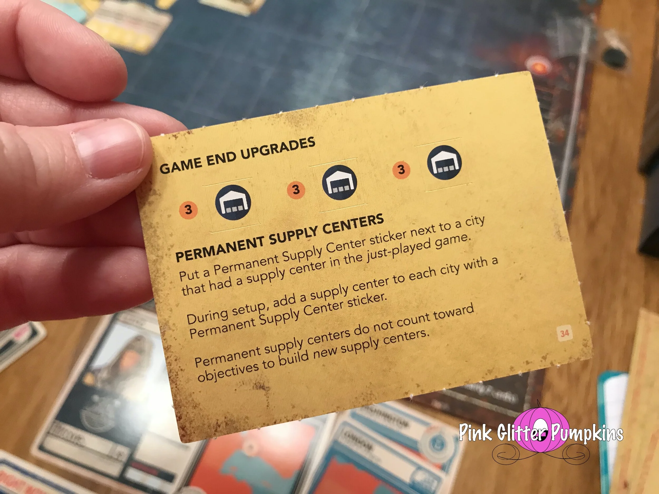 Another new action we received was establish supply line action. So Chicago was automatically added to the board via supply line, but if you wanted to add any other city, you had to spend 2 supply cubes while in a city you want to connect to the new city. We received a sticker for the rule book and our action cards that you can see below.