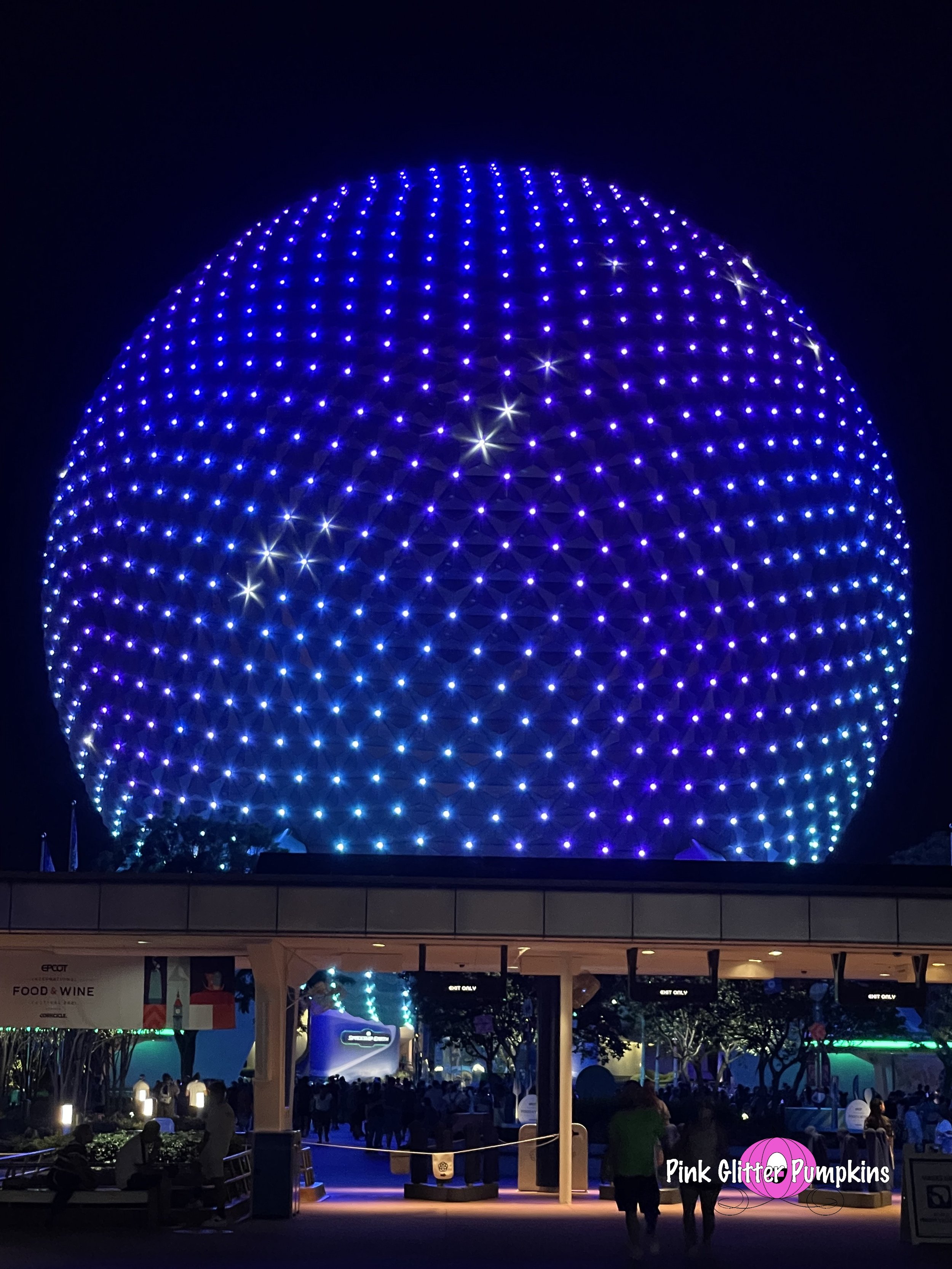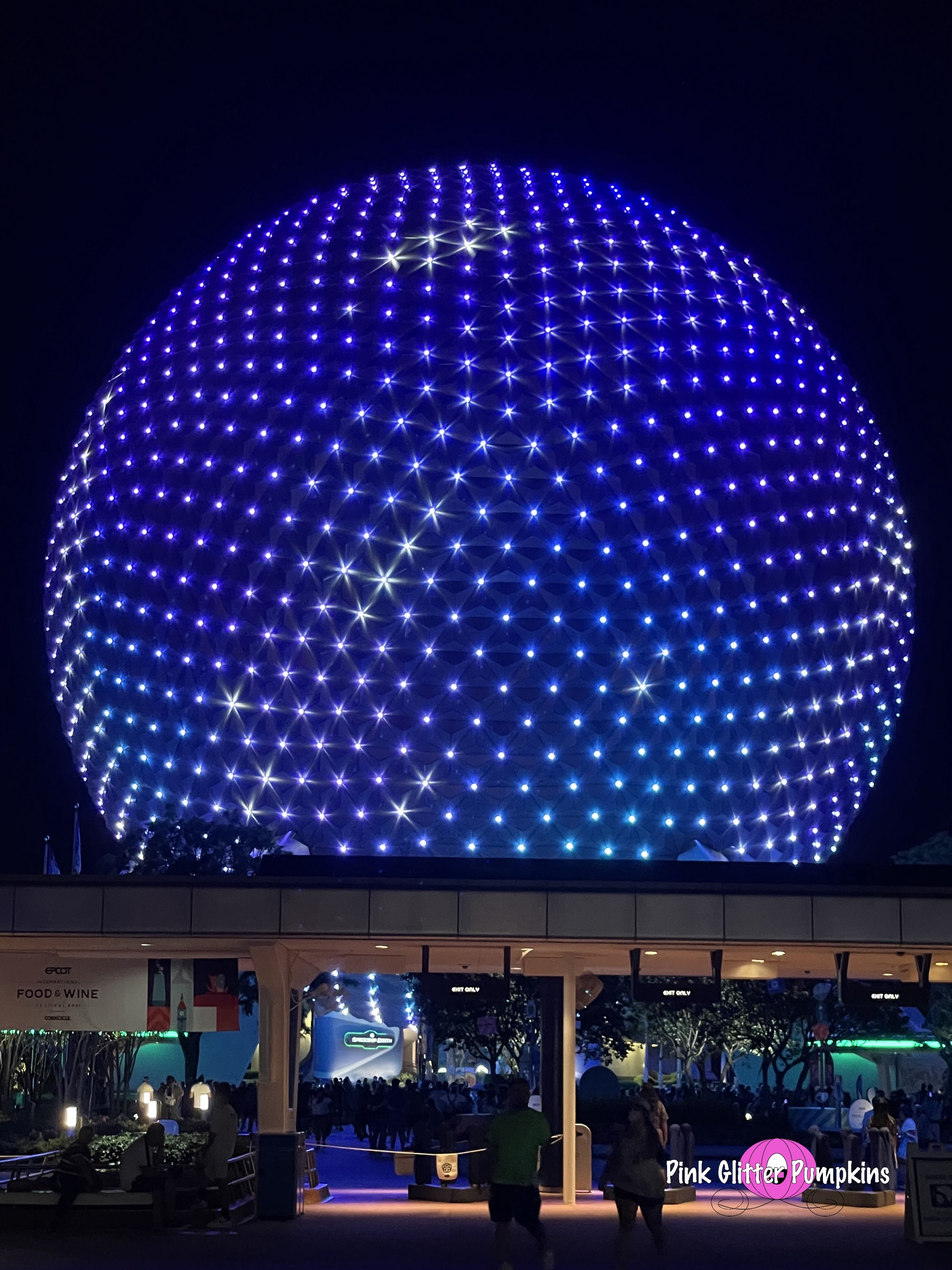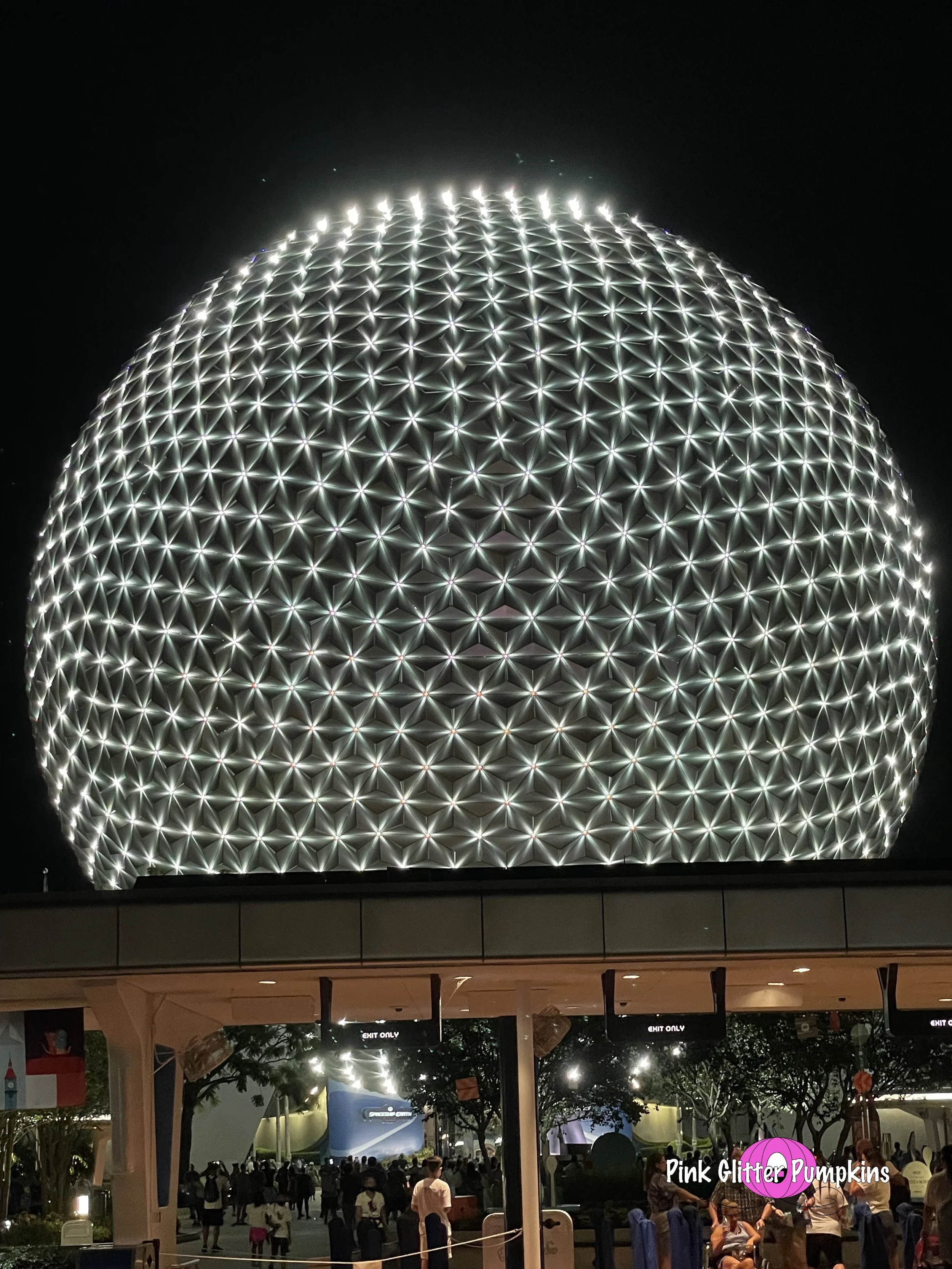 We started heading out around 7:40 or so. As we were walking the lights came on Spaceship Earth, so we watched the show. It really is so beautiful and a great addition that Disney has made. We also grabbed some Joffreyβs on the way out. I got one of their 50th anniversary specials which was amazing. Then we headed out. We did snap a quick picture on our way.