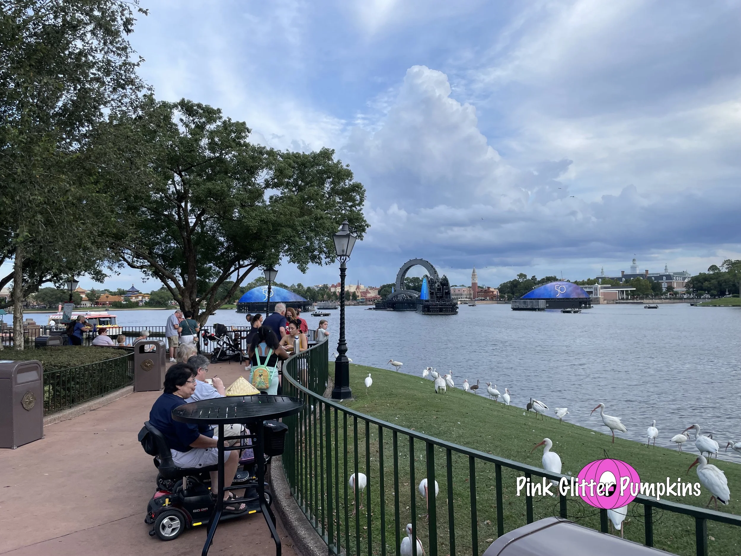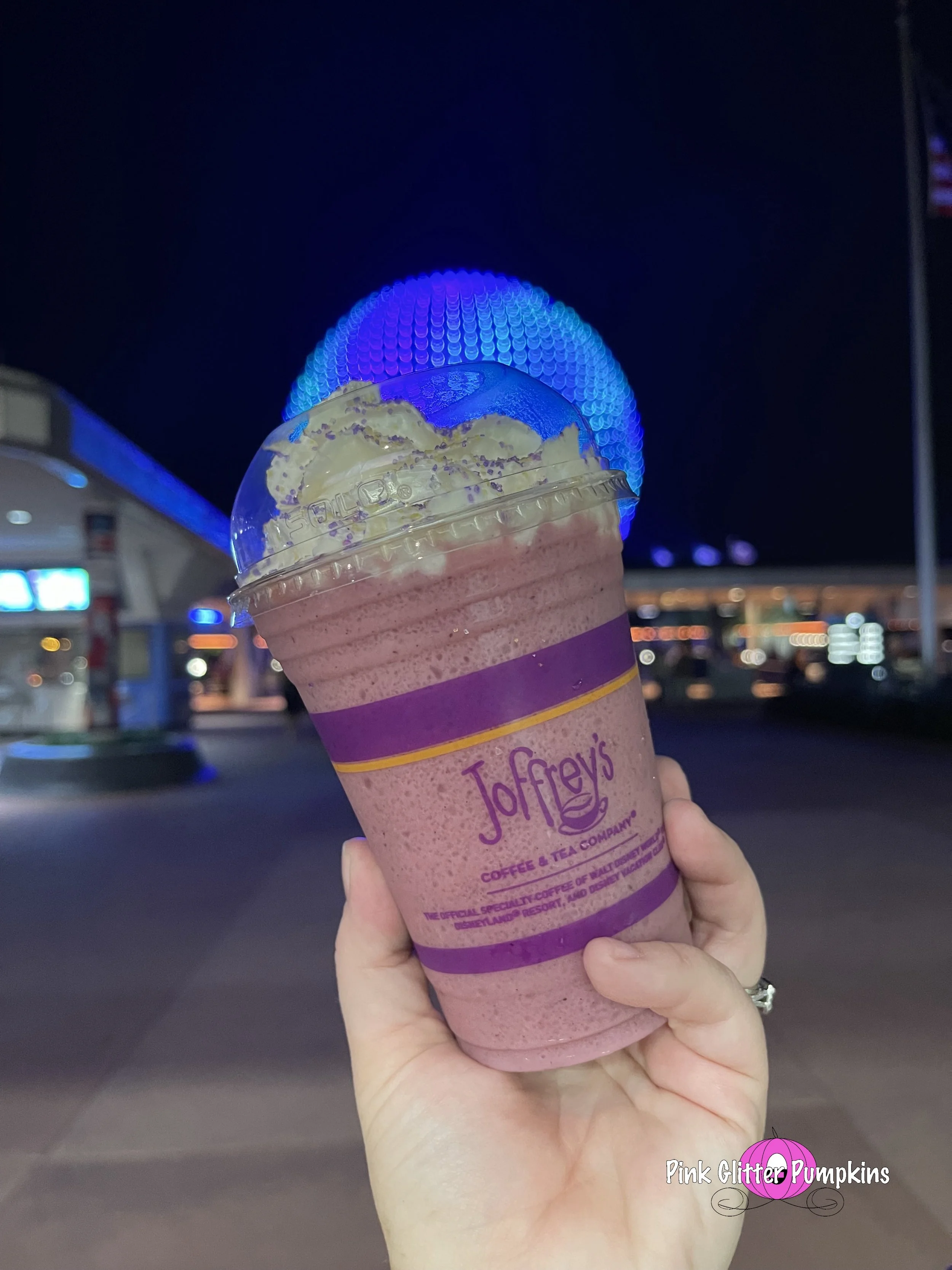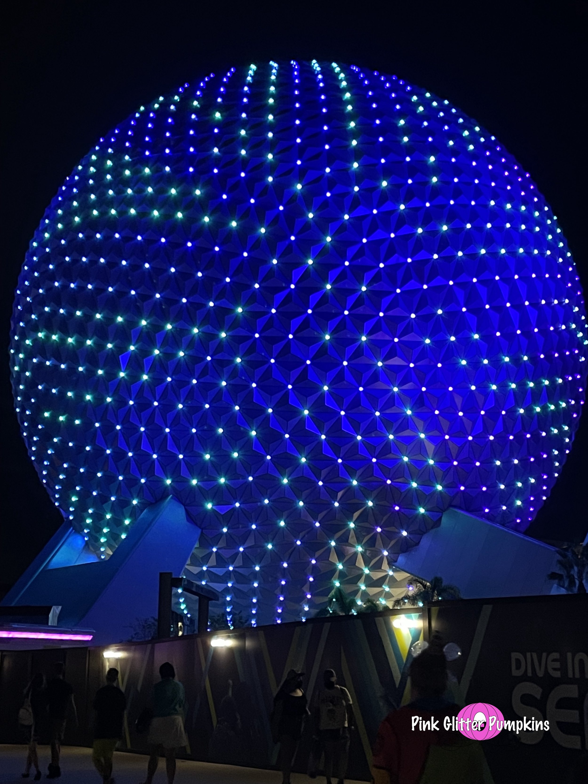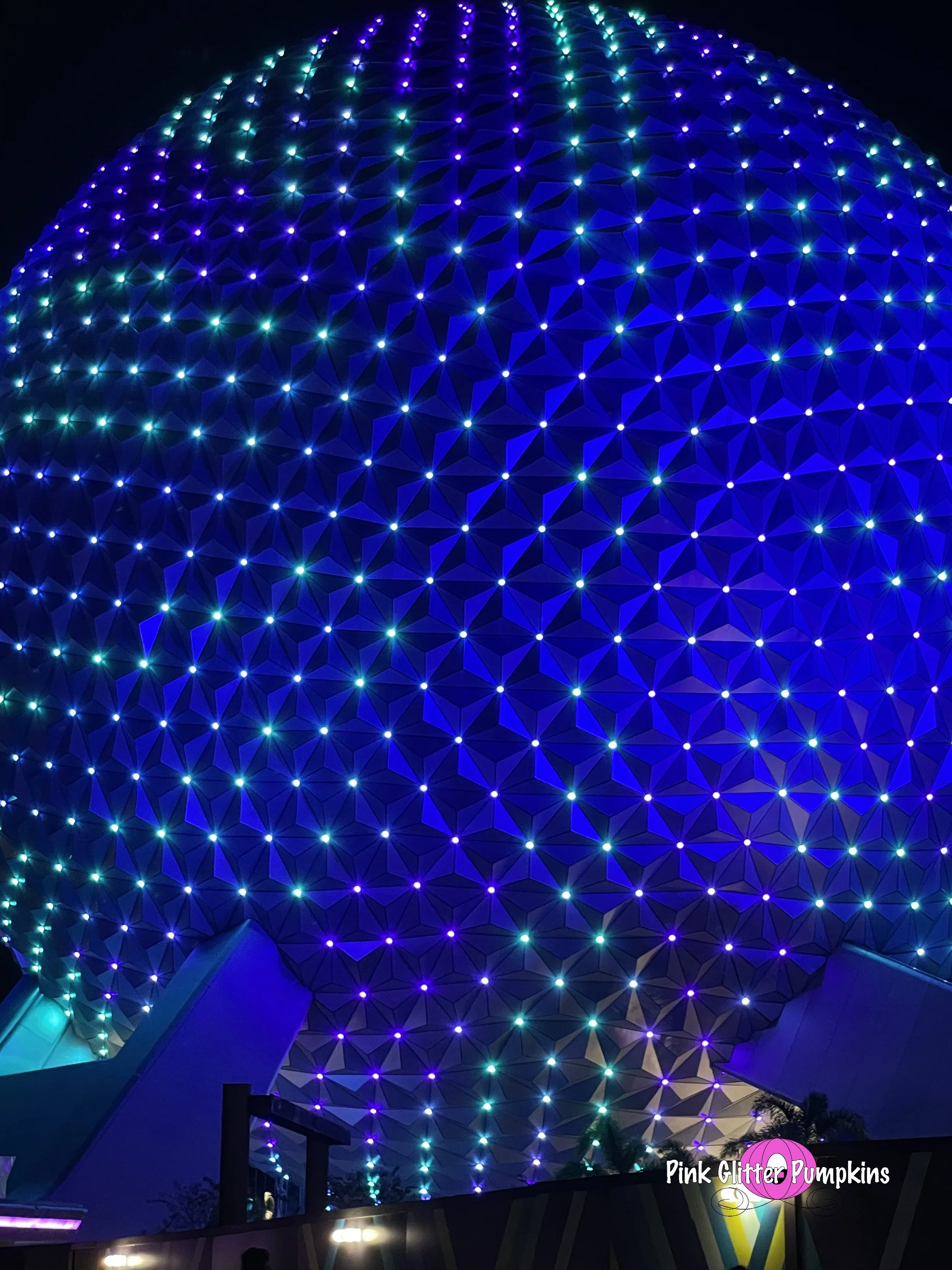 We started heading out around 7:40 or so. As we were walking the lights came on Spaceship Earth, so we watched the show. It really is so beautiful and a great addition that Disney has made. We also grabbed some Joffreyβs on the way out. I got one of their 50th anniversary specials which was amazing. Then we headed out. We did snap a quick picture on our way.