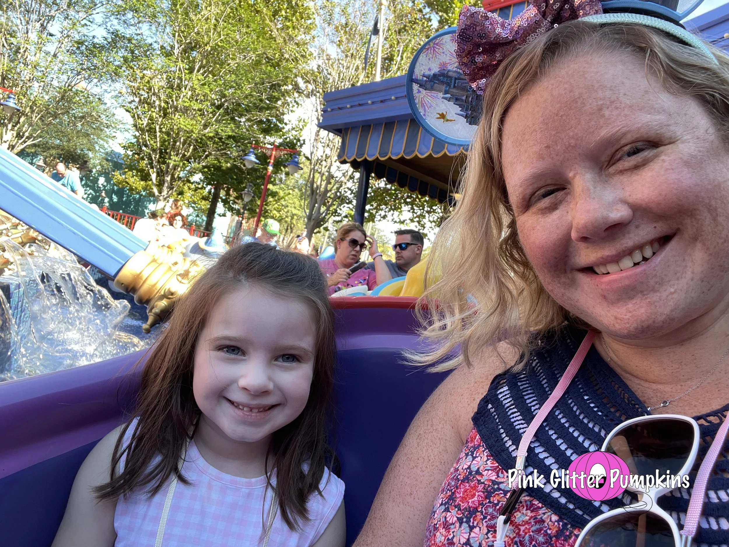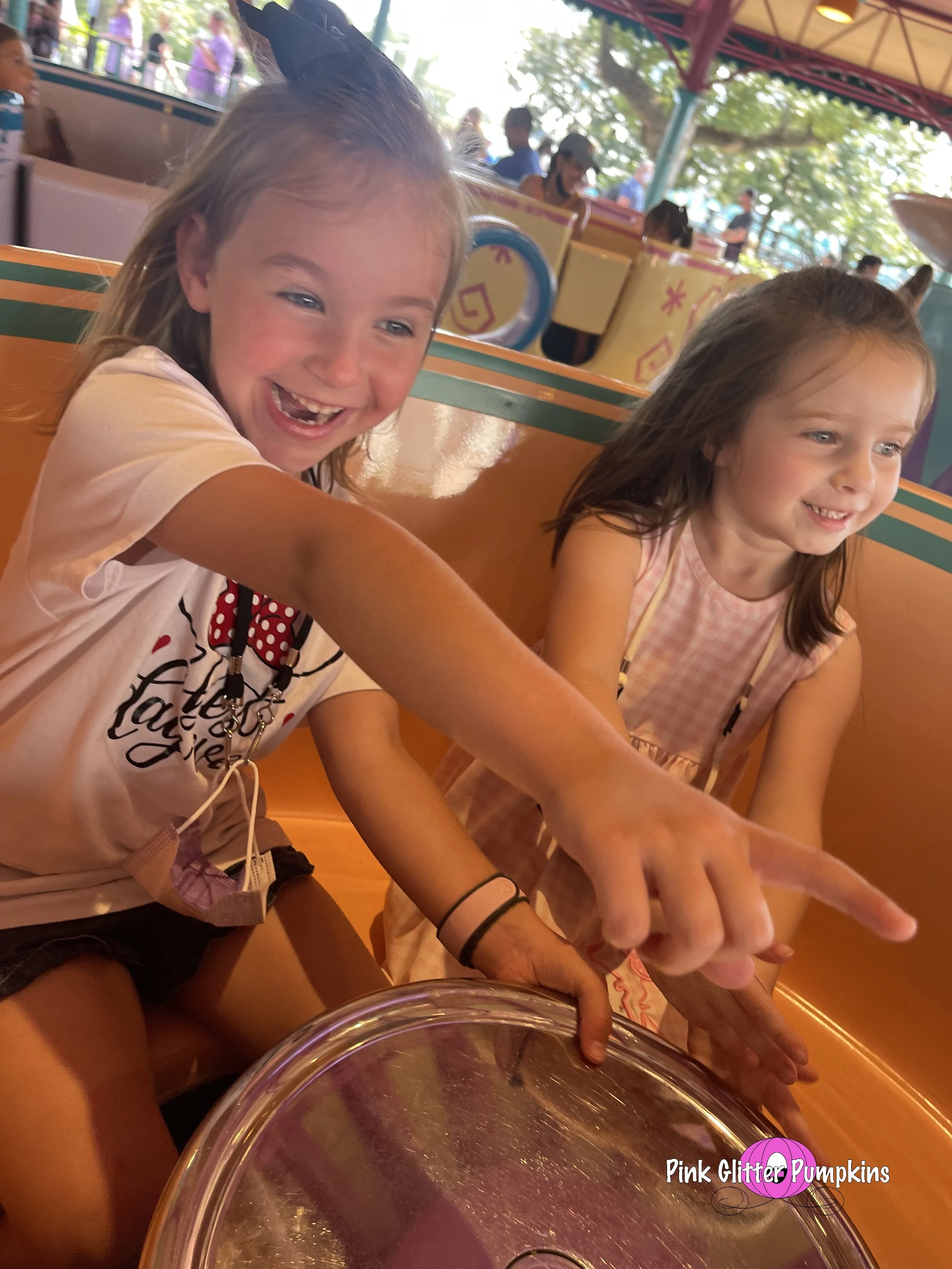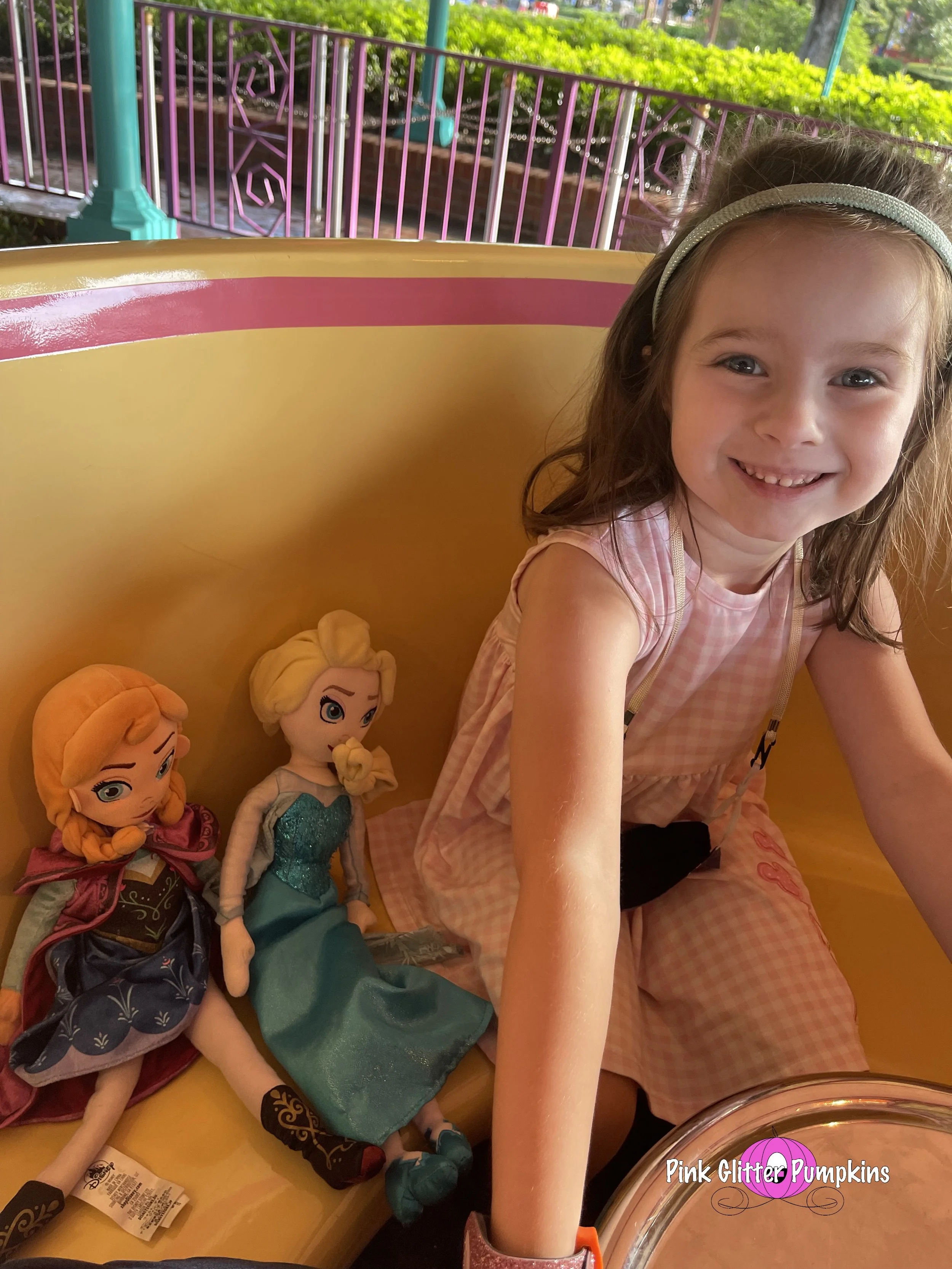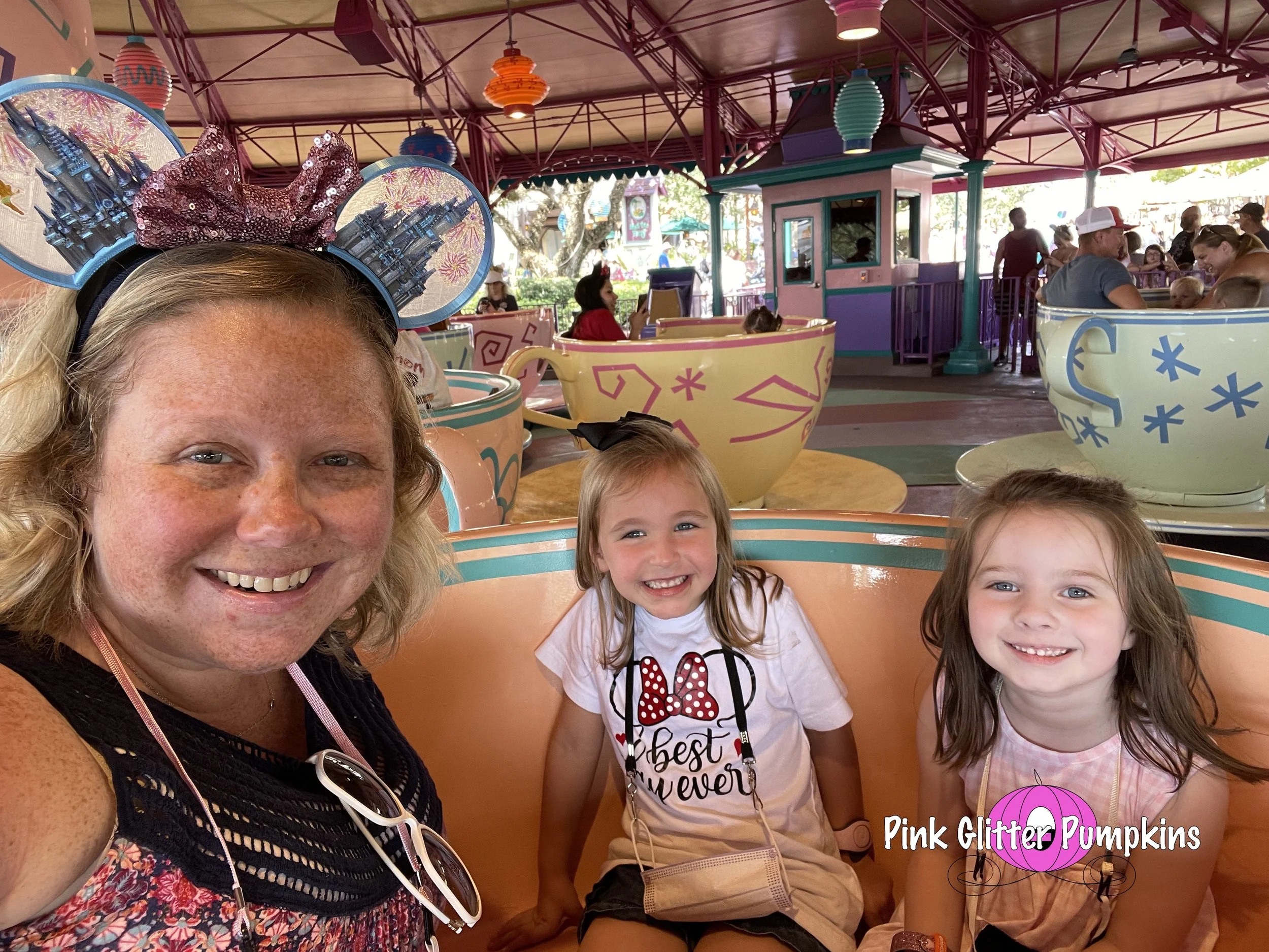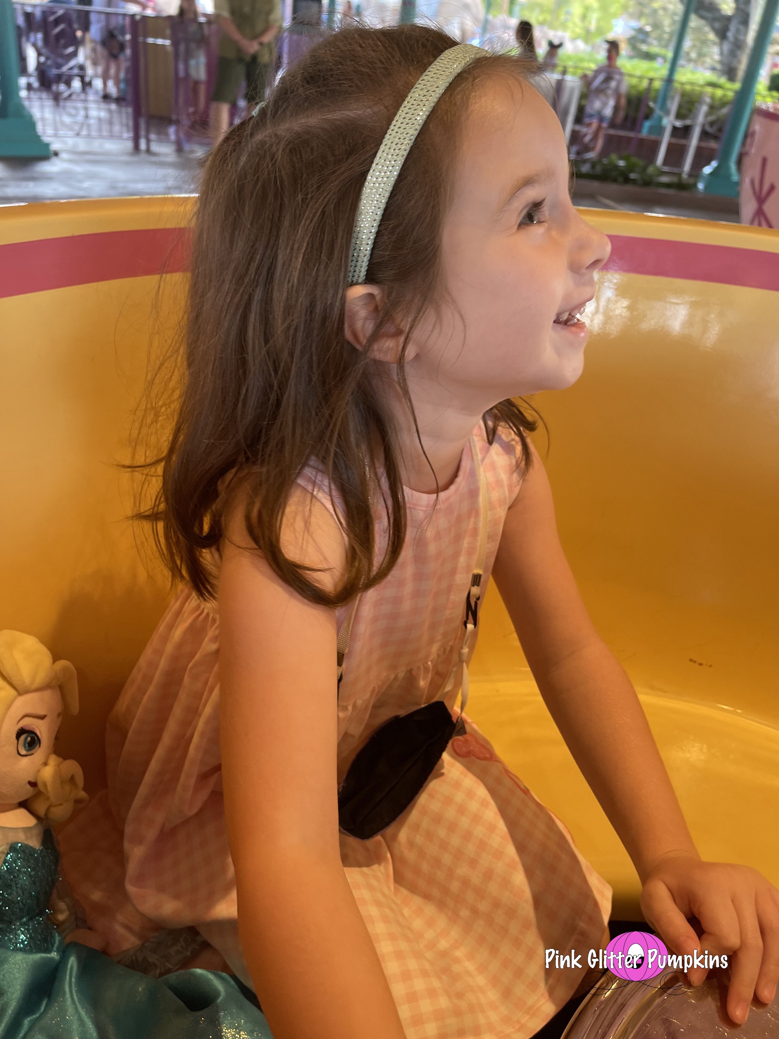 We went straight to Melodyβs favorite, the Teacups! Both Emilyβs group and Rebekahβs group (my sister in law) were at Magic Kingdom that day, so I wanted to be sure and get in Melodyβs favorite while we were by ourselves.